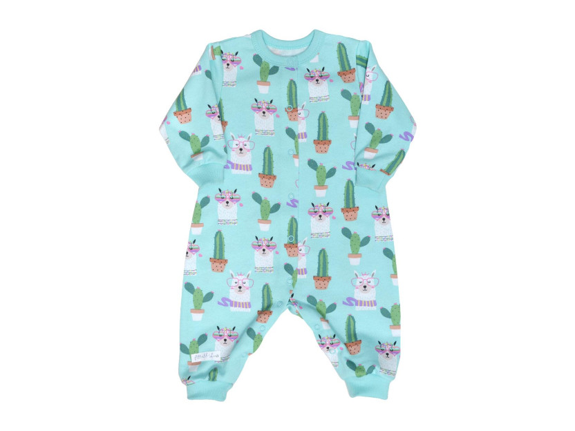 Футер двухнитка:100%х/б. Комбинезон-перед с центральной застежкой по шаговому шву на кнопки.Горловина окантована,длинный рукав и низ ножек на манжете из ластика.