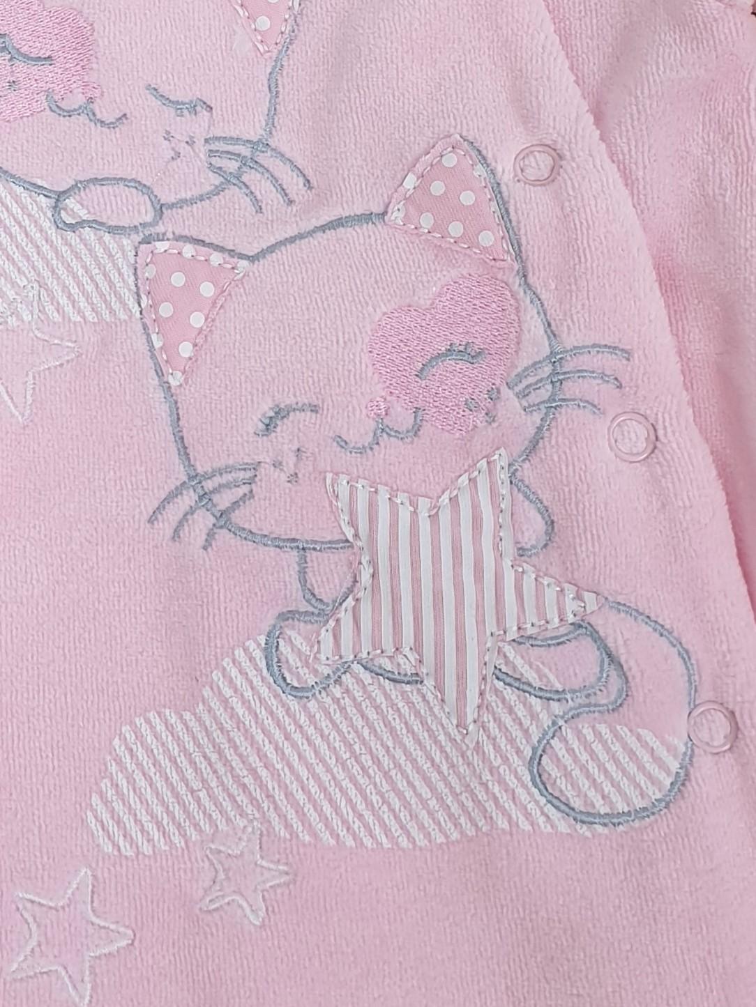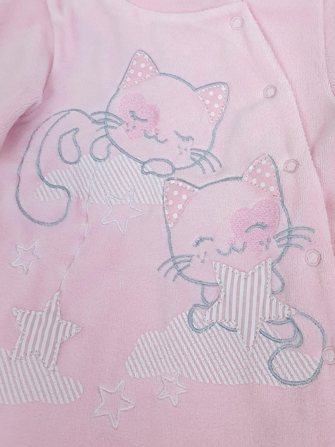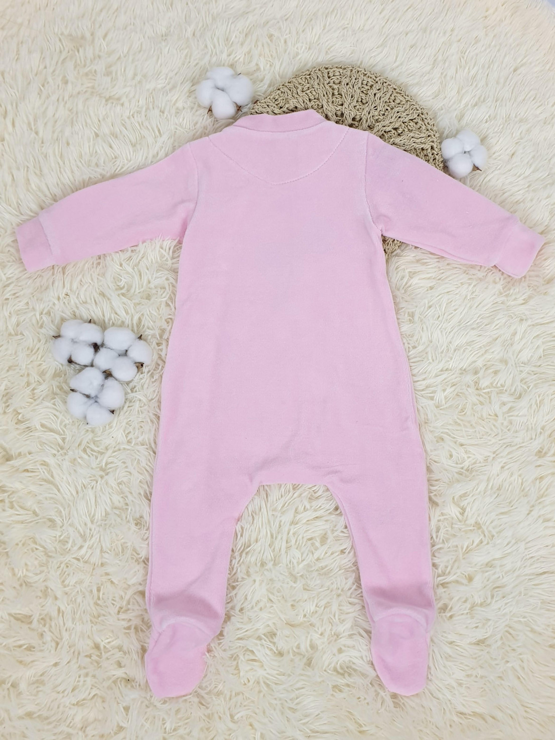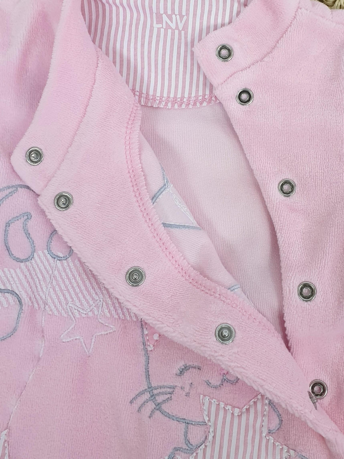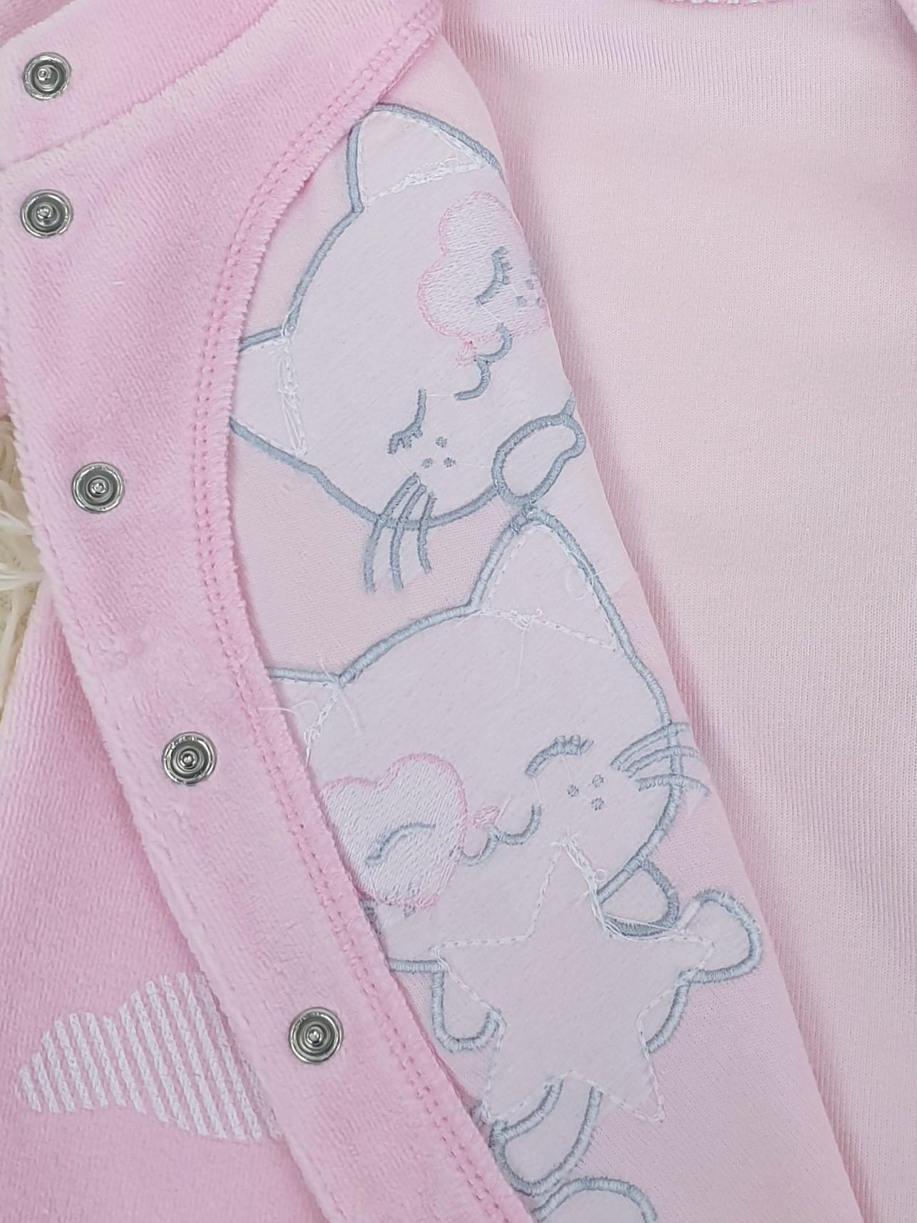 Велюр:80% х/б,20% п/э. Комбинезон-правая сторона переда с вышивкой-аппликацией(печатные детали).Рукав втачной длинный на манжете,в горловине воротник-стойка.Застежка ассиметричная на кнопки.