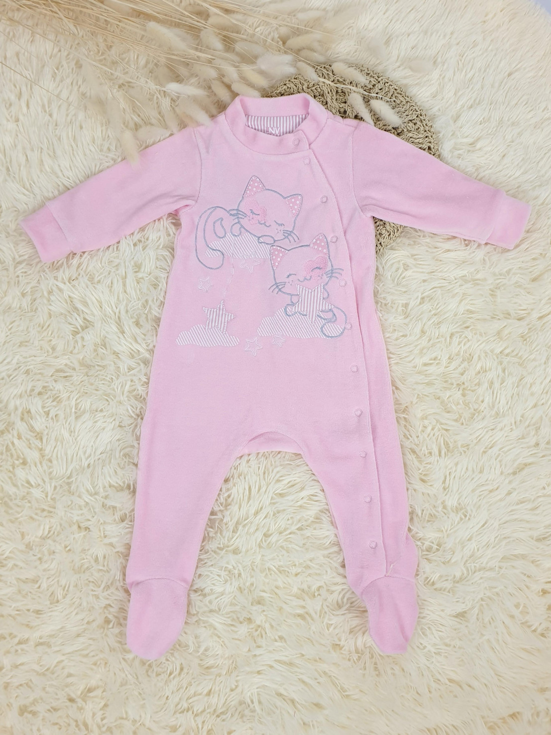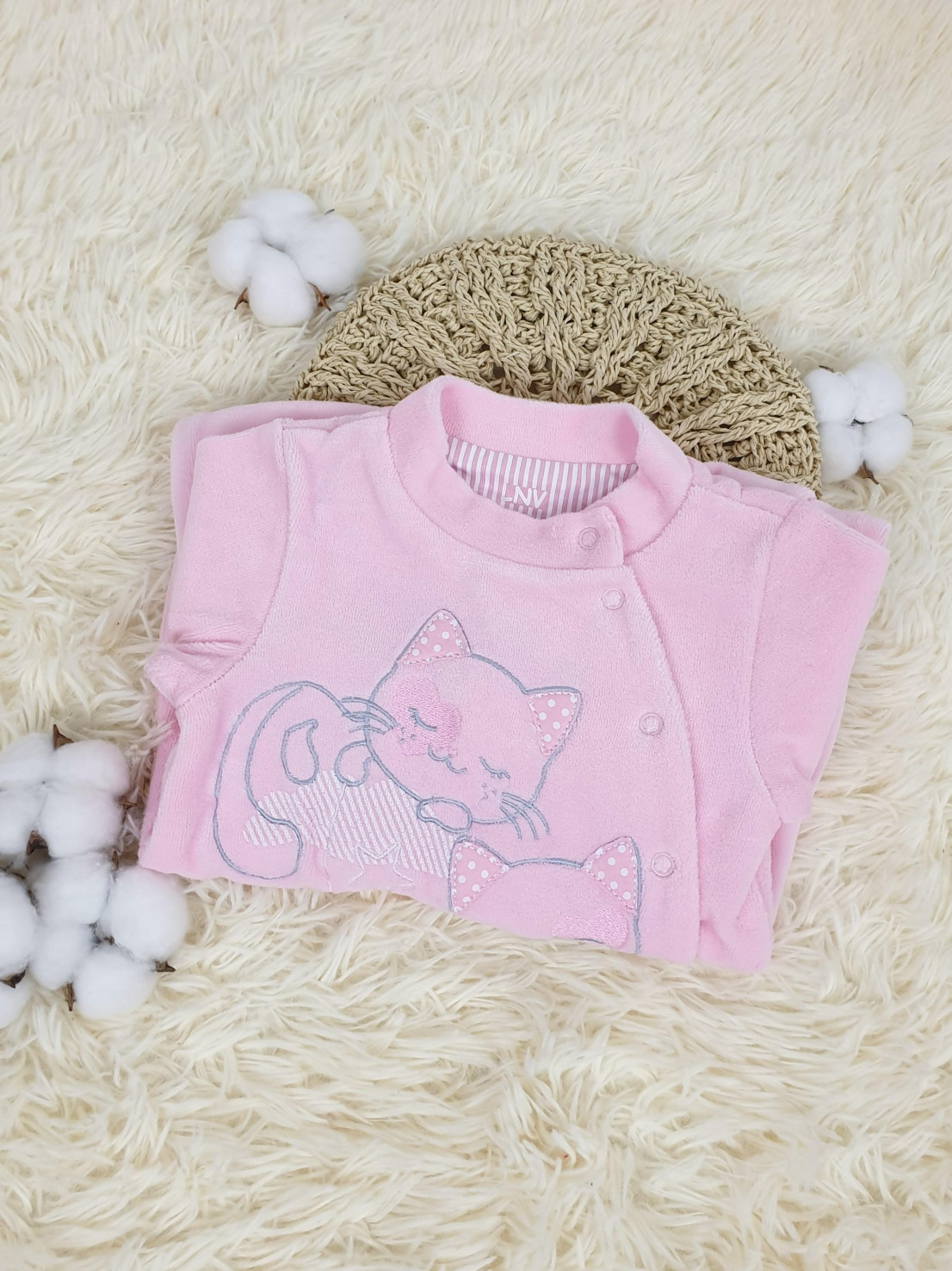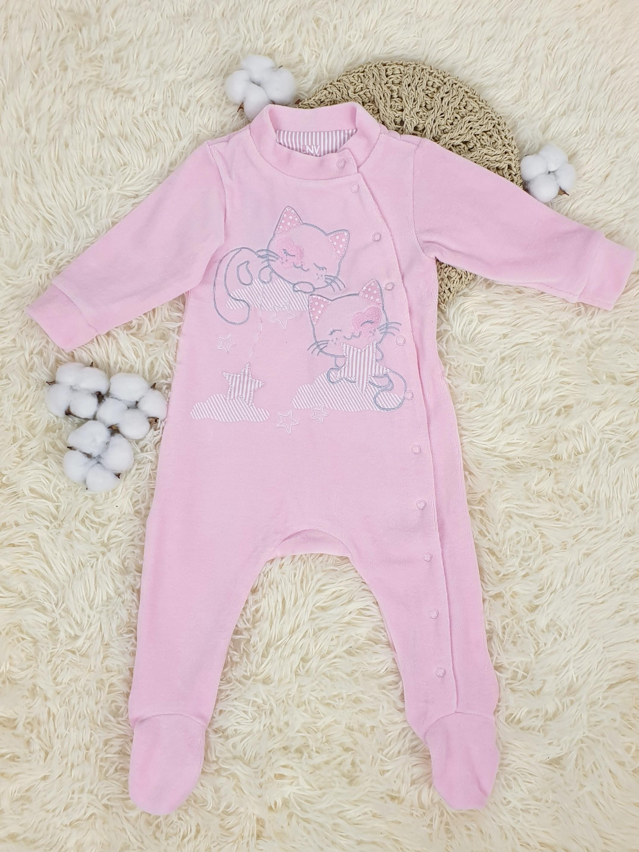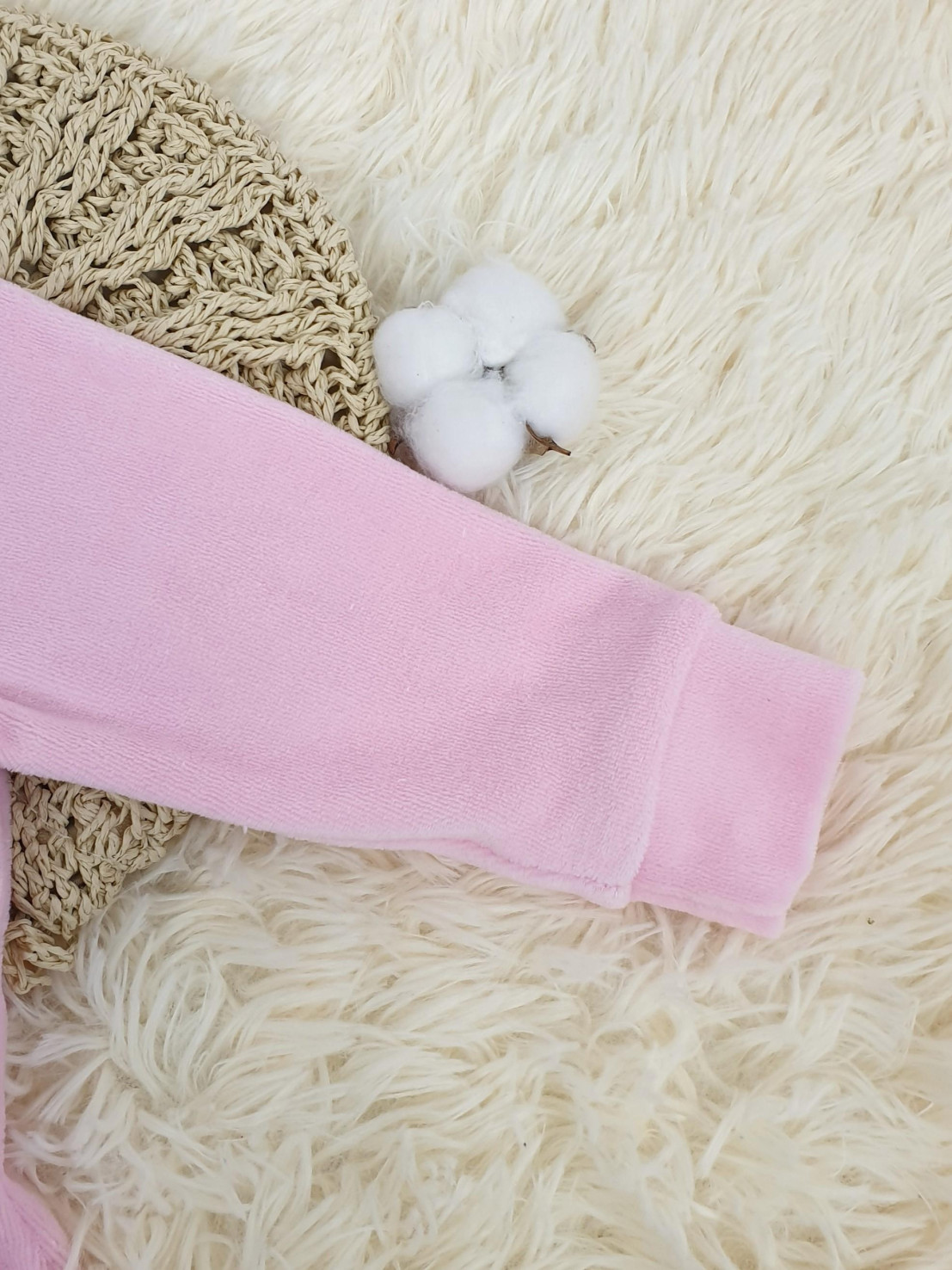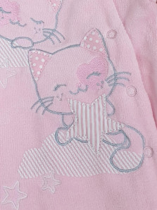 Велюр:80% х/б,20% п/э. Комбинезон-правая сторона переда с вышивкой-аппликацией(печатные детали).Рукав втачной длинный на манжете,в горловине воротник-стойка.Застежка ассиметричная на кнопки.