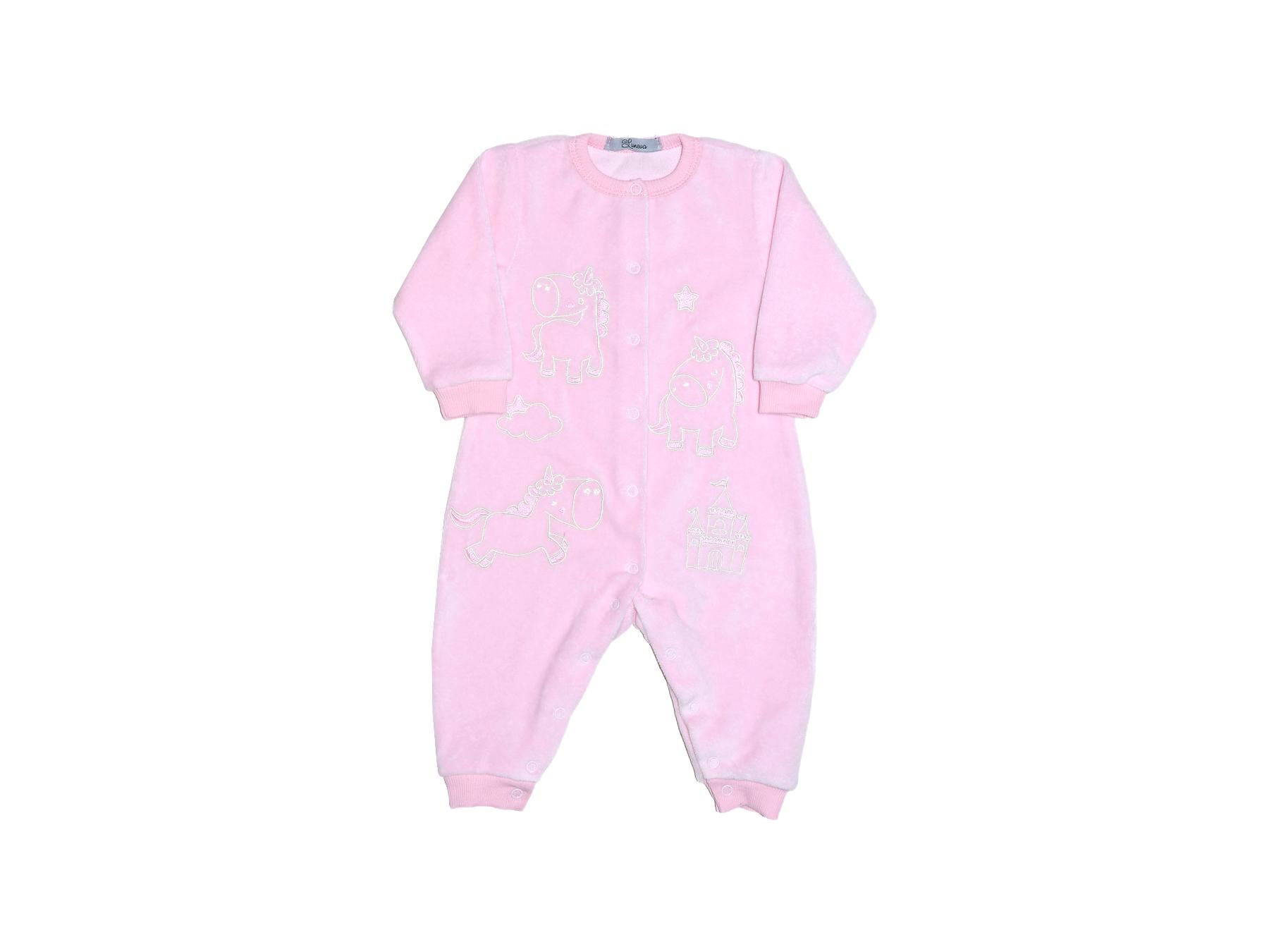 Велюр:80% х/б,20% п/э. Комбинезон-перед с центральной застежкой и по шаговому шву на кнопки.Горловина окантована,длинный рукав и низ ножек на манжете из ластика.Вышивка по переду.