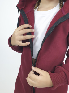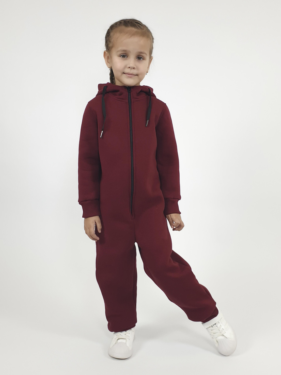 Футер 3-х нитка:85% х/б,15% п/э. Комбинезон с центральной застежкой на "молнию"длинный рукав и низ брюк на манжете.В горловине капюшон со шнуром,сзади в области талии резинка(фиксирующая ширину спинки).