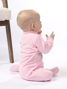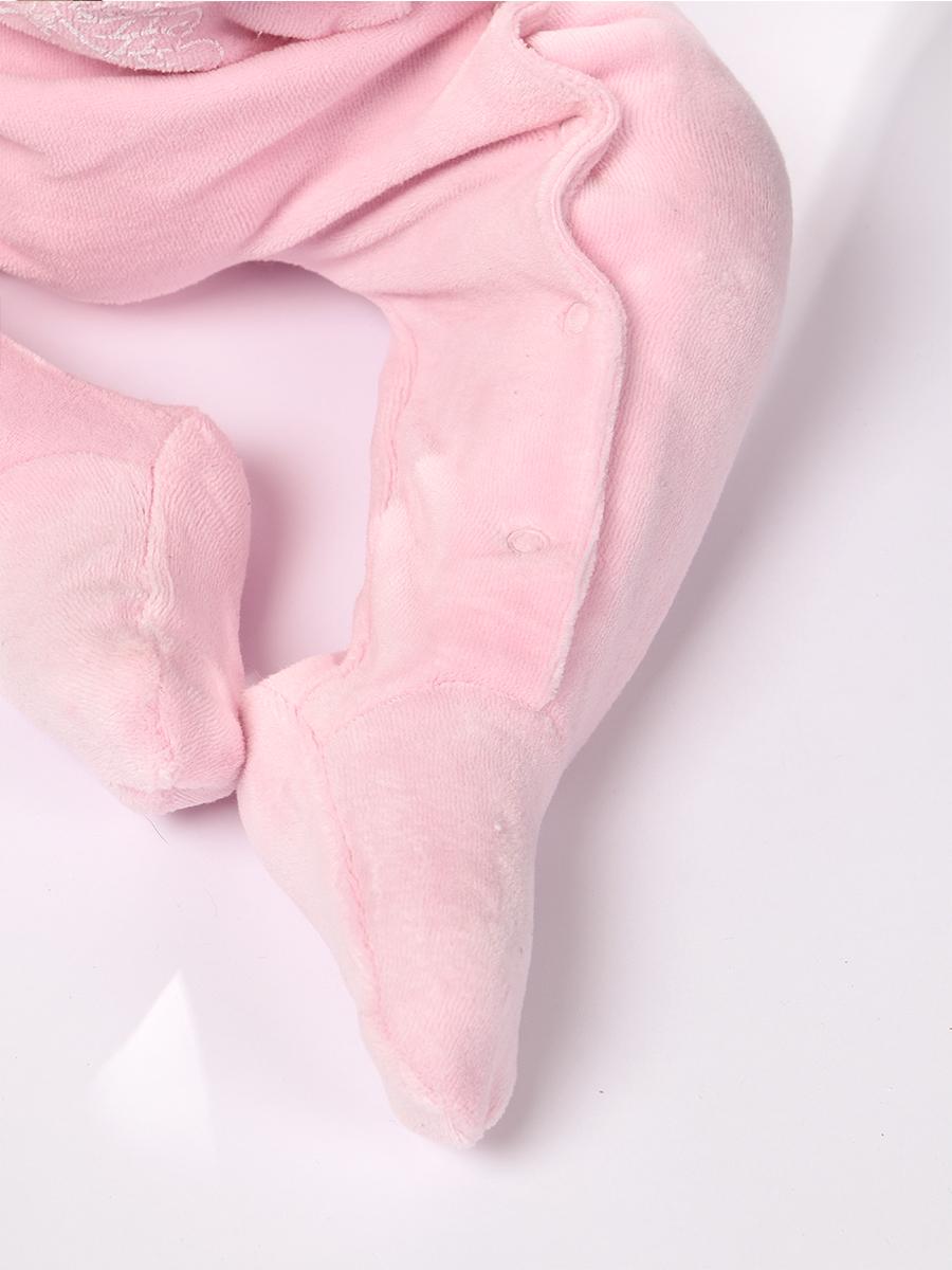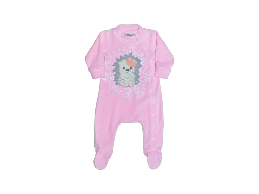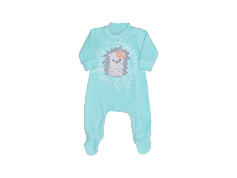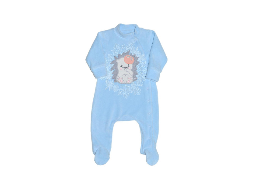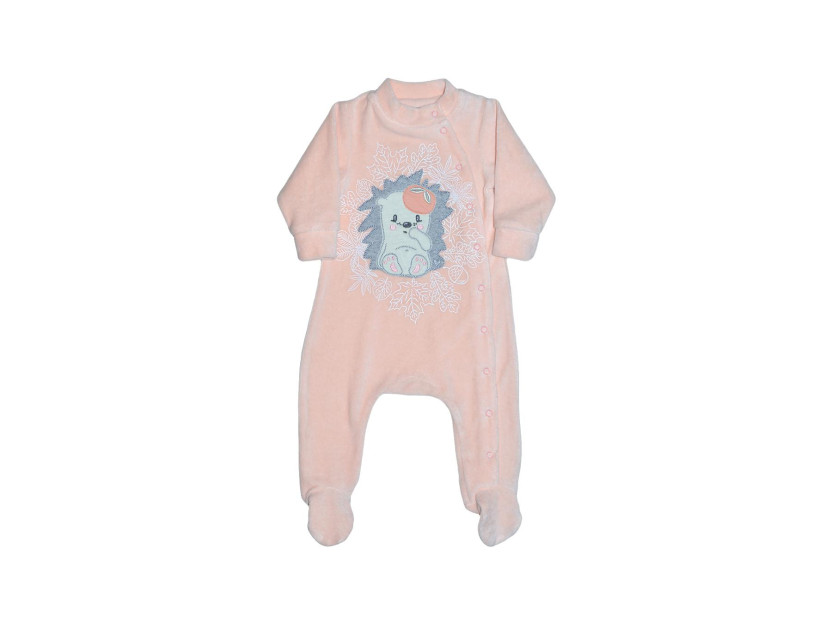 Велюр: 80% х/б.,20% п/э. Комбинезон-правая сторона переда с печатью и вышивкой аппликацией.Рукав втачной,длинный на манжете.В горловине воротник-стойка.застежка ассиметричная на кнопки.