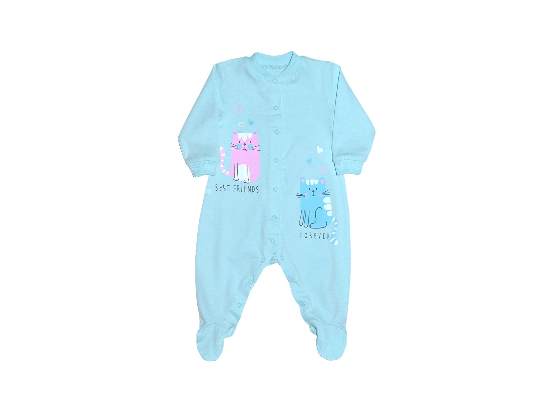 Кулирное полотно: 100% х/б. Комбинезон-перед с центральной застежкой и по шаговому шву на кнопки.Печать по двум частям переда.Горловина на стойке из ластика.Рукав втачной длинный на манжете из ластика.