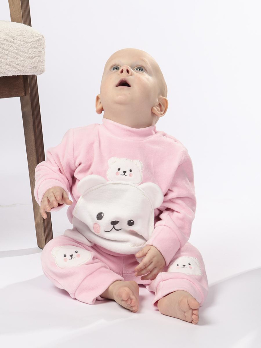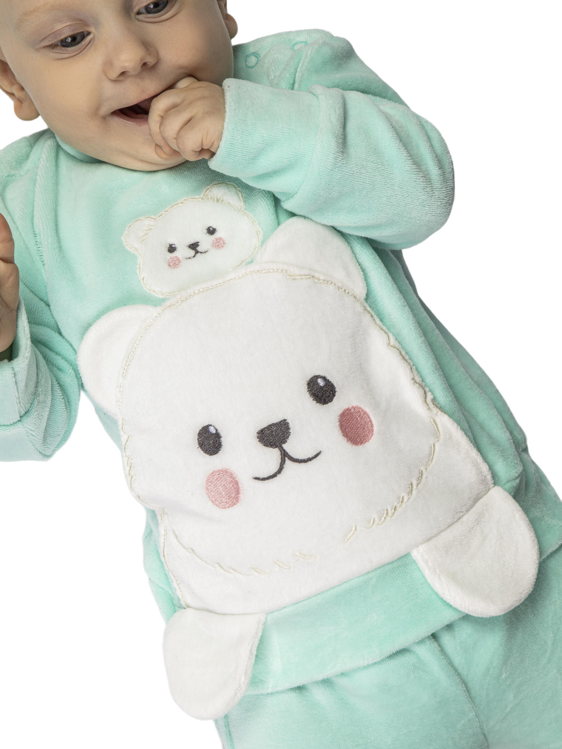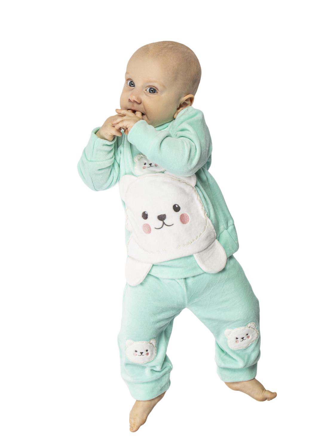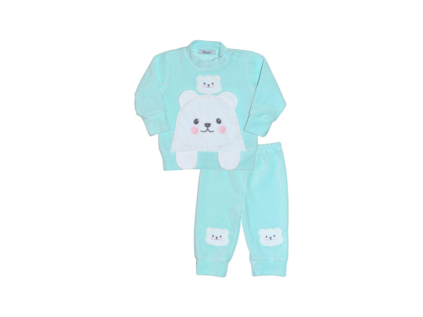 Велюр:80% х/б,20% п/э. Комплект.Джемпер прямой на поясе.В горловине воротник-стойка,застежка в плече на кнопки.Перед с вышивкой-аппликацией,накладной карман.Рукав втачной,длинный на манжете. Брюки-длинные на резинке,внизу на манжете.Вышивка на переде в области колен.