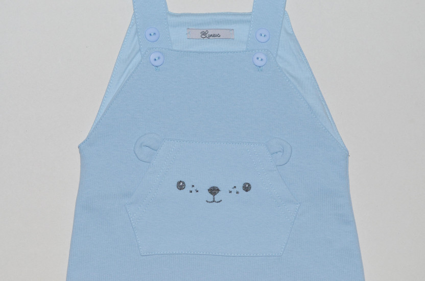 Кулирное полотно:100% х/б.-фуфайка Футер двух-нитка:75% х/б,25% п/э-полукомбинезон Полукомбинезон-свободный на бретелях.Перед с накладным,вышитым карманом и отделочным элементом "ушки".Застежка по шаговому шву на кнопки,бретели пристегиваются на пуговицы. Фуфайка-прямая с коротким рукавом,горловина обработана ластиком.
