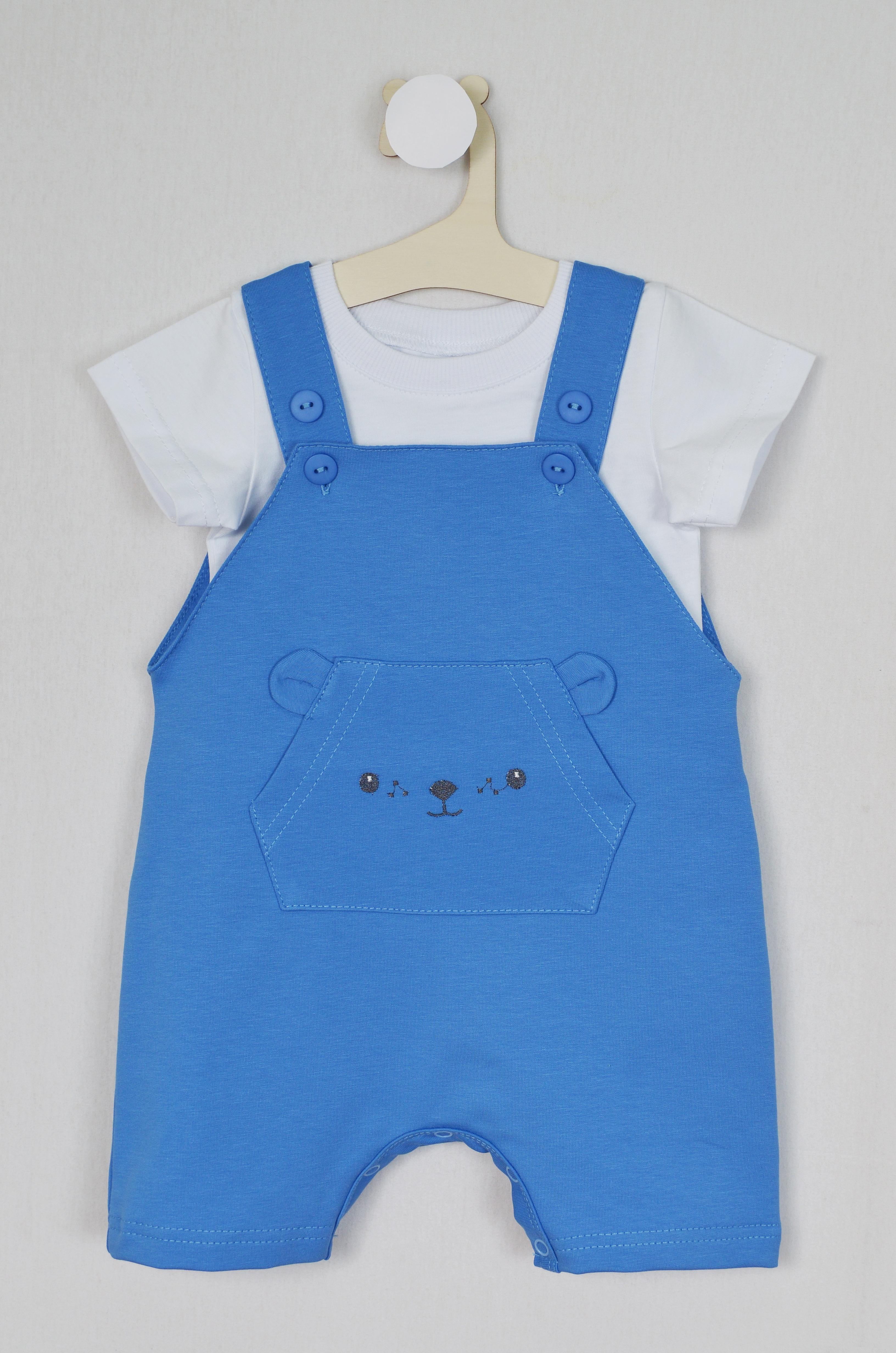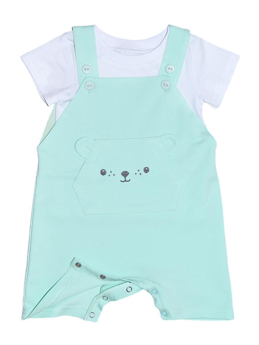 Кулирное полотно:100% х/б.-фуфайка Футер двух-нитка:75% х/б,25% п/э-полукомбинезон Полукомбинезон-свободный на бретелях.Перед с накладным,вышитым карманом и отделочным элементом "ушки".Застежка по шаговому шву на кнопки,бретели пристегиваются на пуговицы. Фуфайка-прямая с коротким рукавом,горловина обработана ластиком.