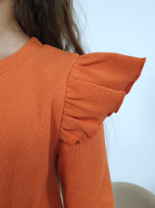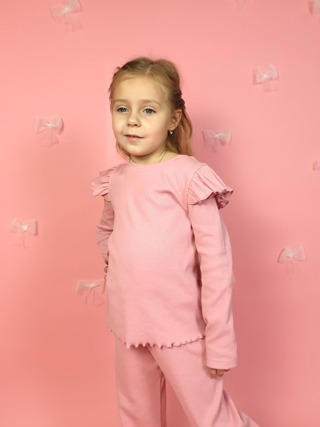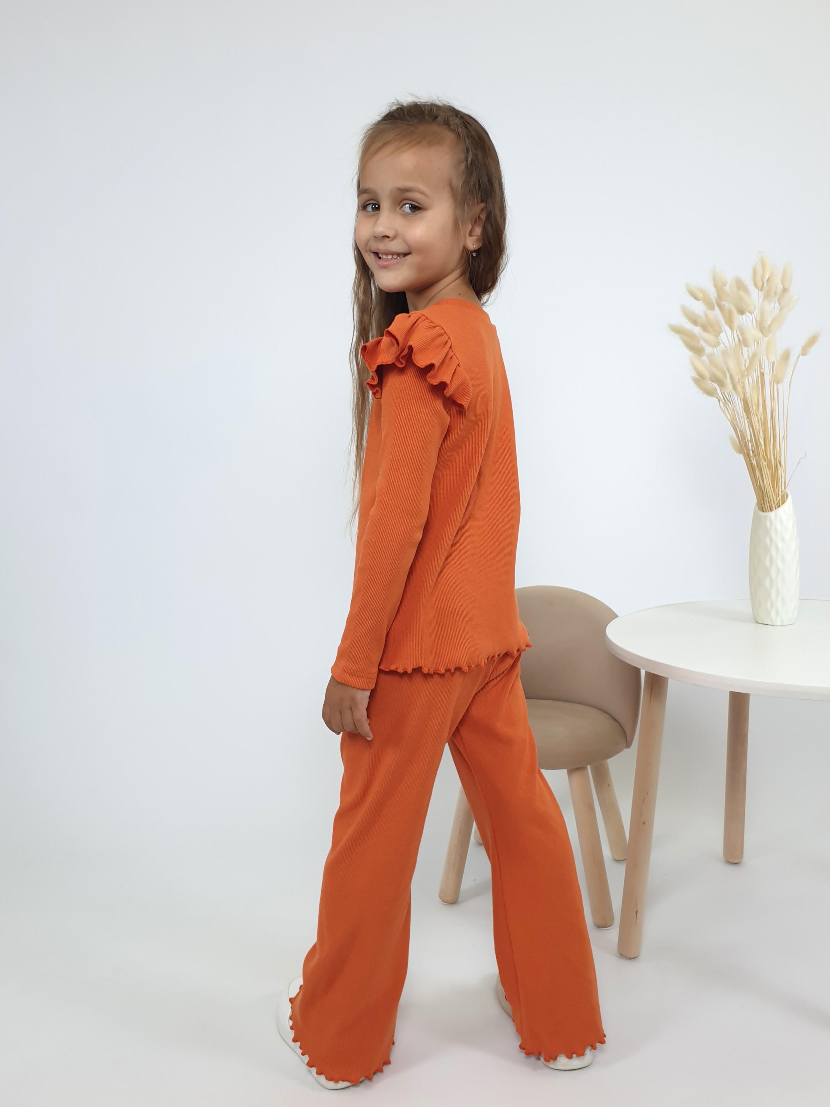 Кашкорсе:95% х/б,5% лайкра. Джемпер-прямой,рукав втачной,длинный.В пройму вставлена рюша.Горловина обработана планкой. Брюки-длинные,расширены к низу,вверху на резинке.
