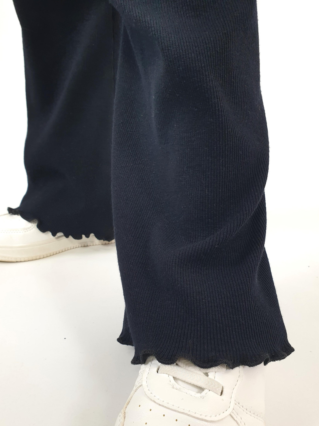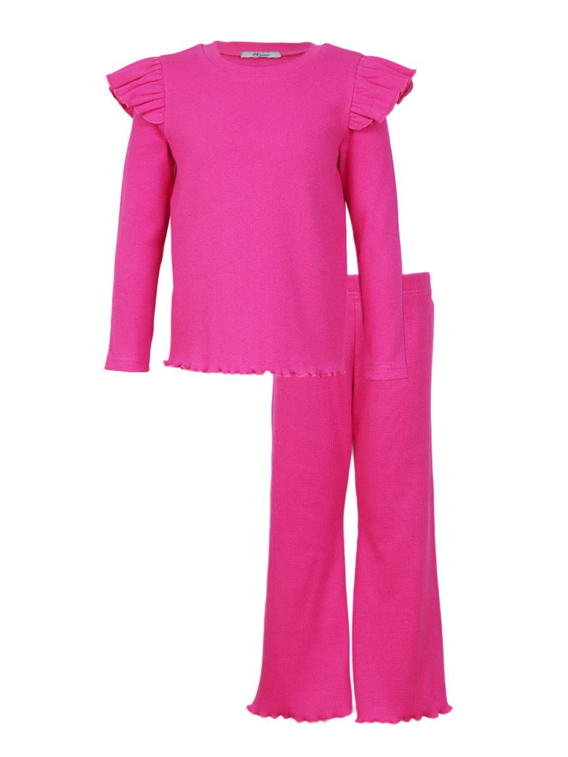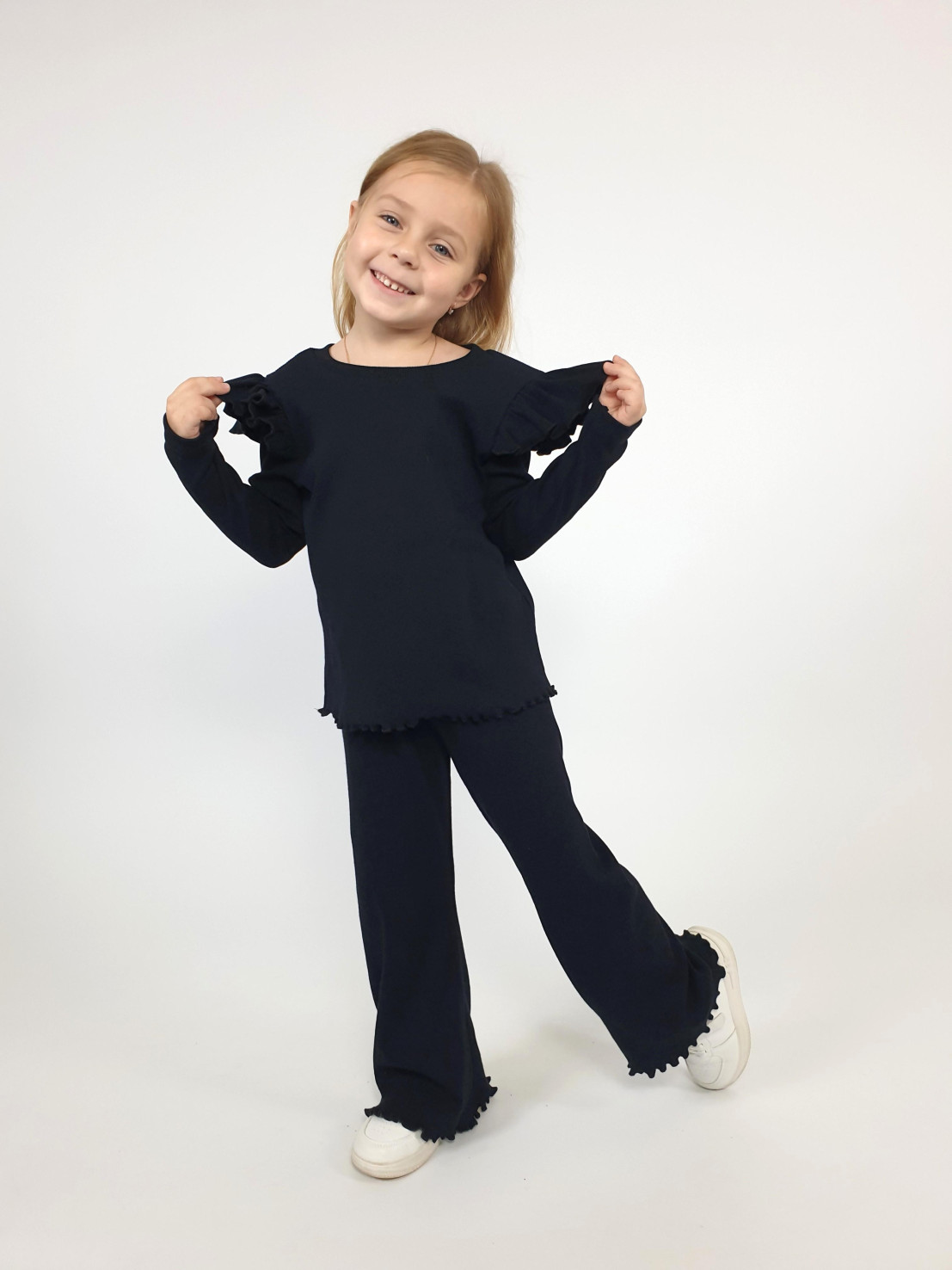 Кашкорсе:95% х/б,5% лайкра. Джемпер-прямой,рукав втачной,длинный.В пройму вставлена рюша.Горловина обработана планкой. Брюки-длинные,расширены к низу,вверху на резинке.