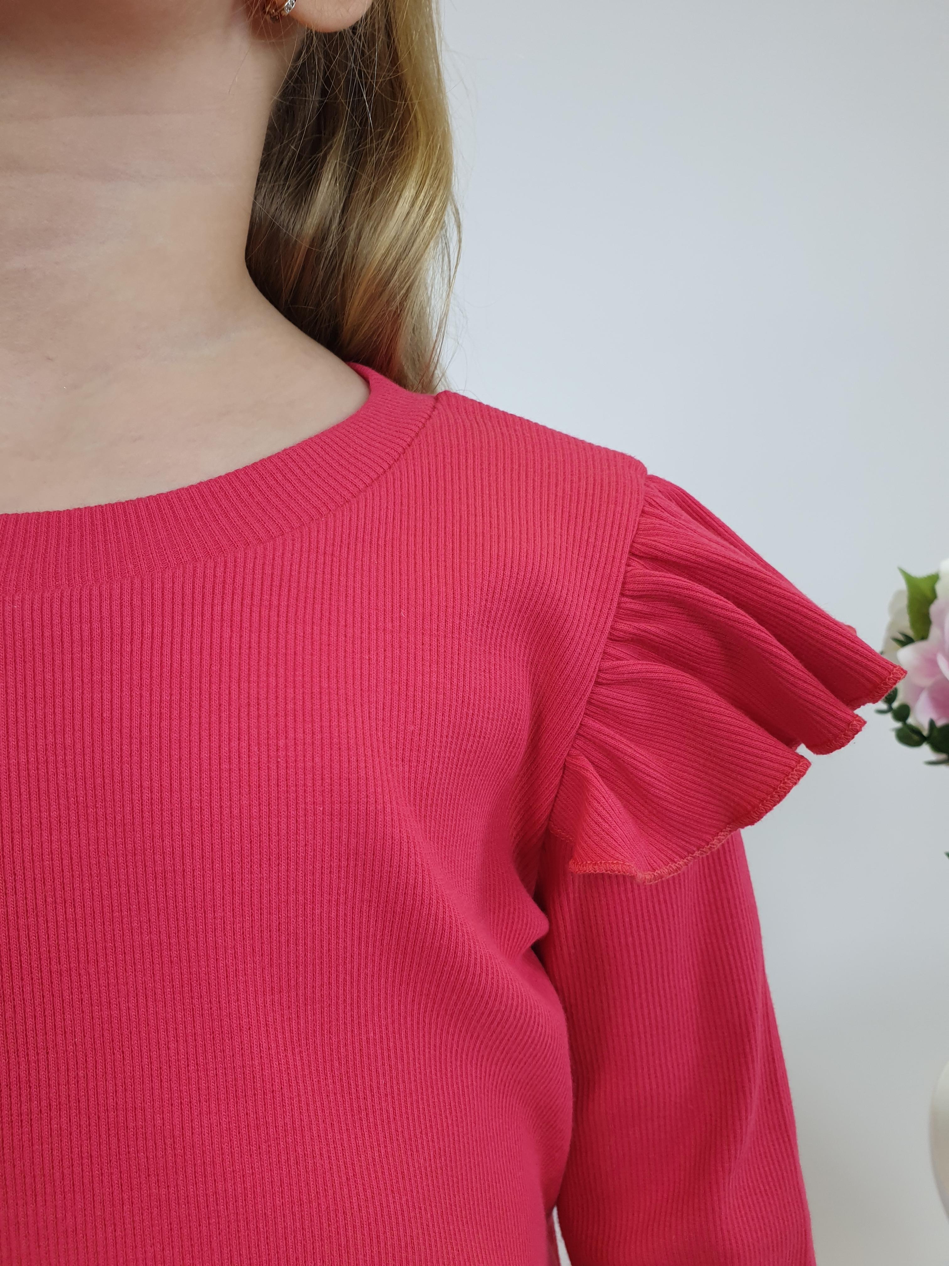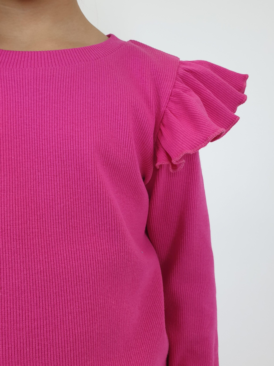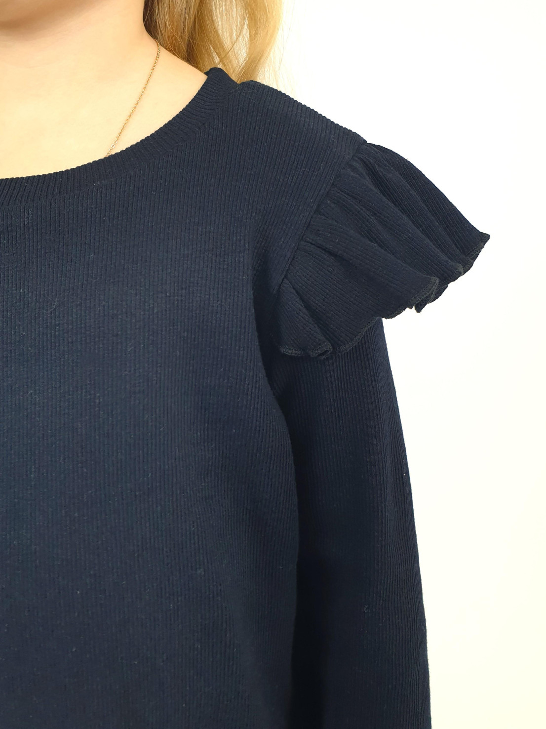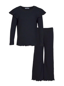 Кашкорсе:95% х/б,5% лайкра. Джемпер-прямой,рукав втачной,длинный.В пройму вставлена рюша.Горловина обработана планкой. Брюки-длинные,расширены к низу,вверху на резинке.