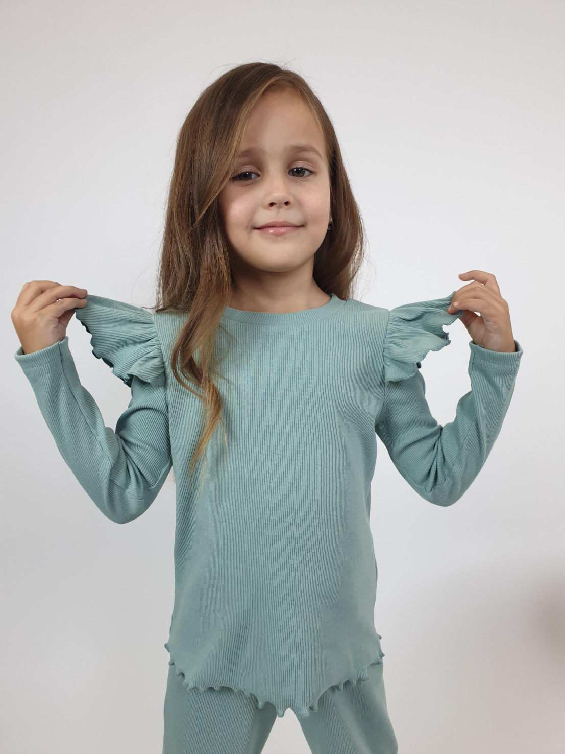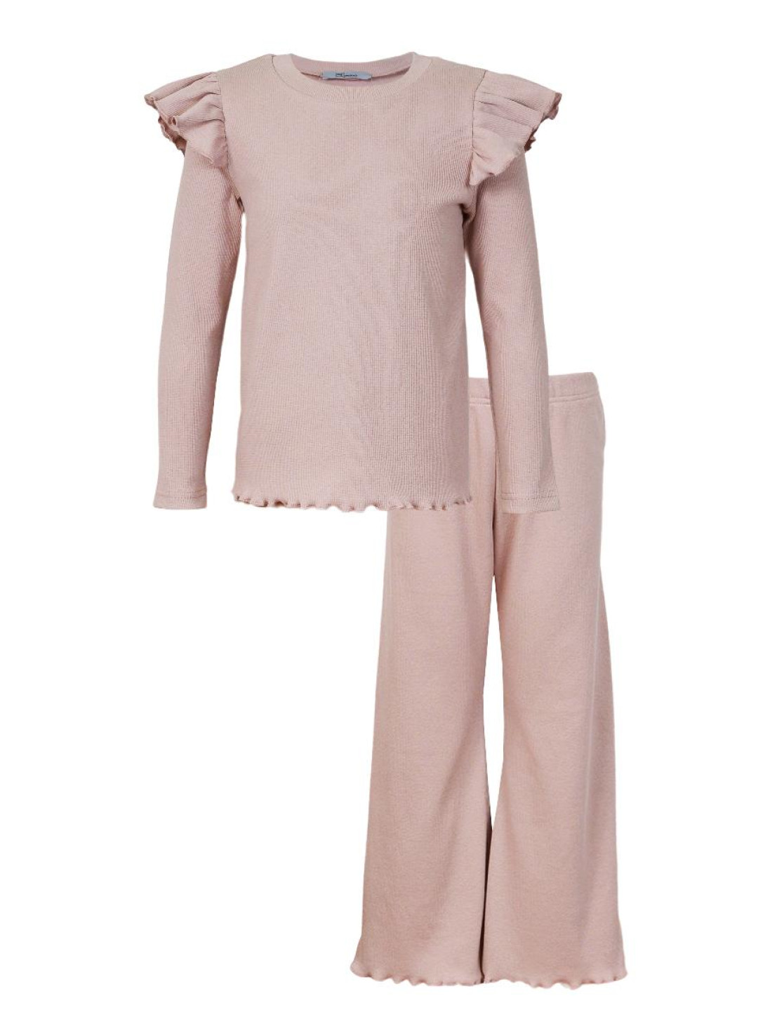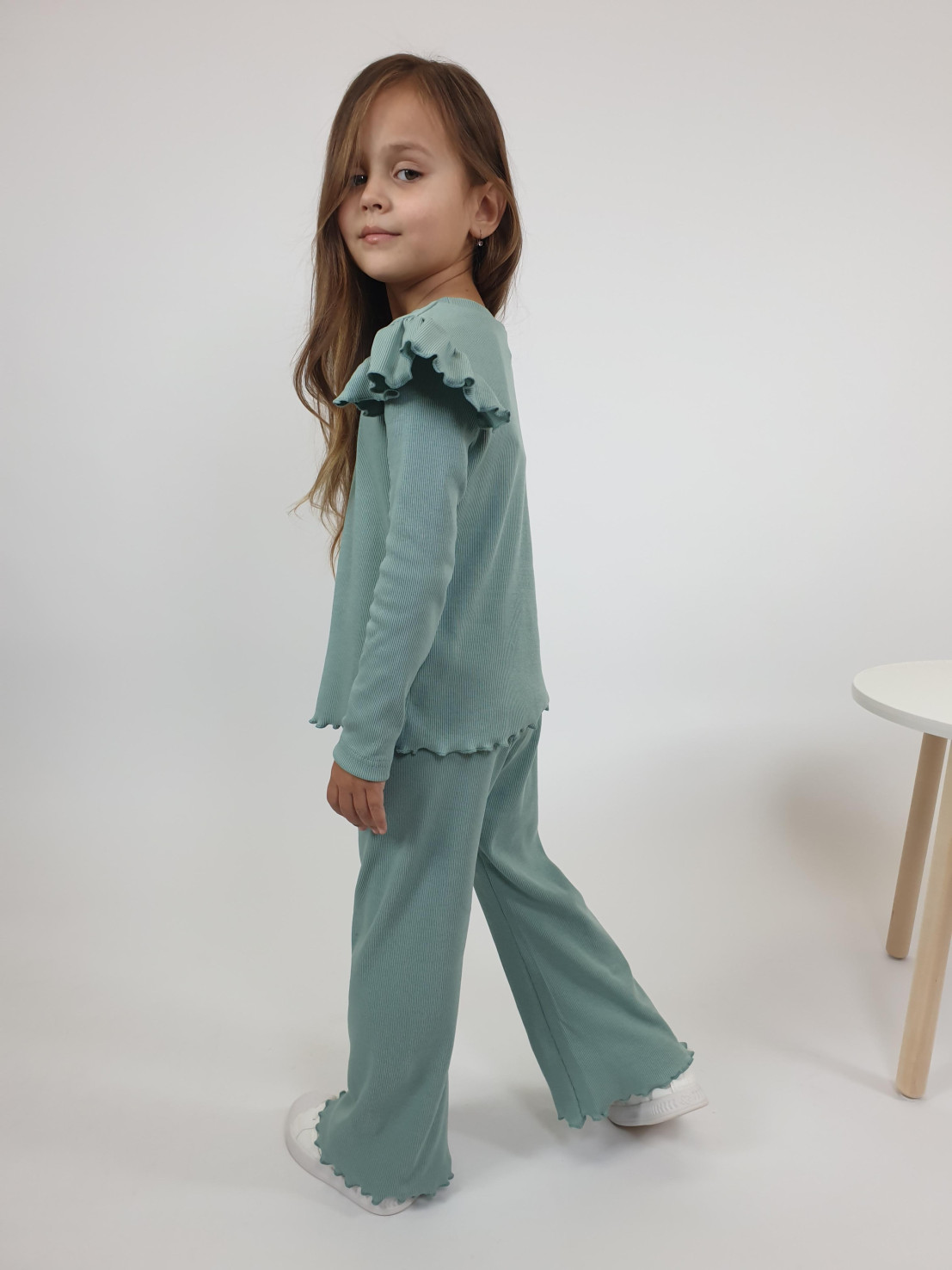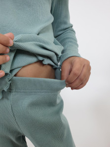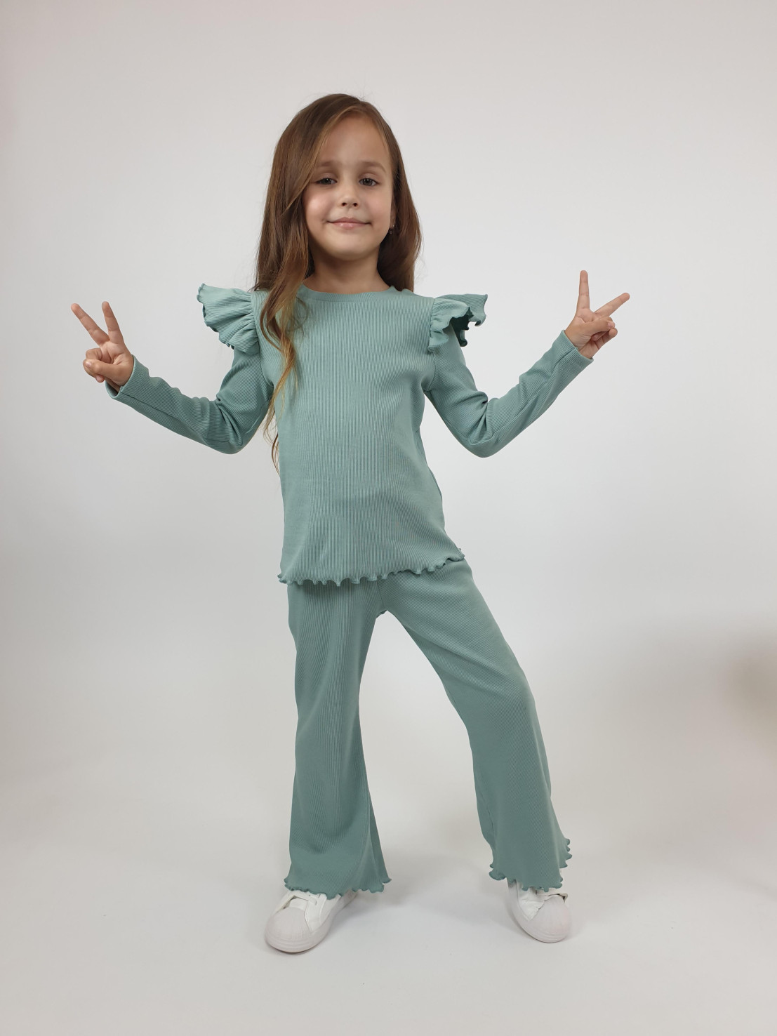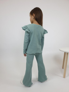Кашкорсе:95% х/б,5% лайкра. Джемпер-прямой,рукав втачной,длинный.В пройму вставлена рюша.Горловина обработана планкой. Брюки-длинные,расширены к низу,вверху на резинке.