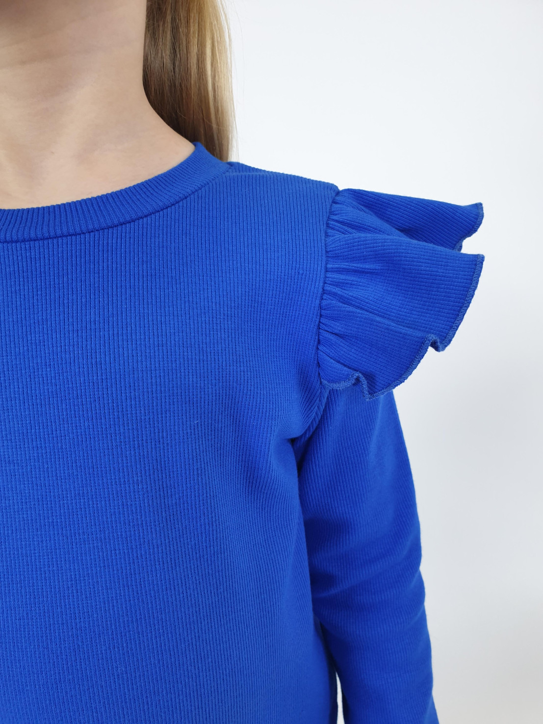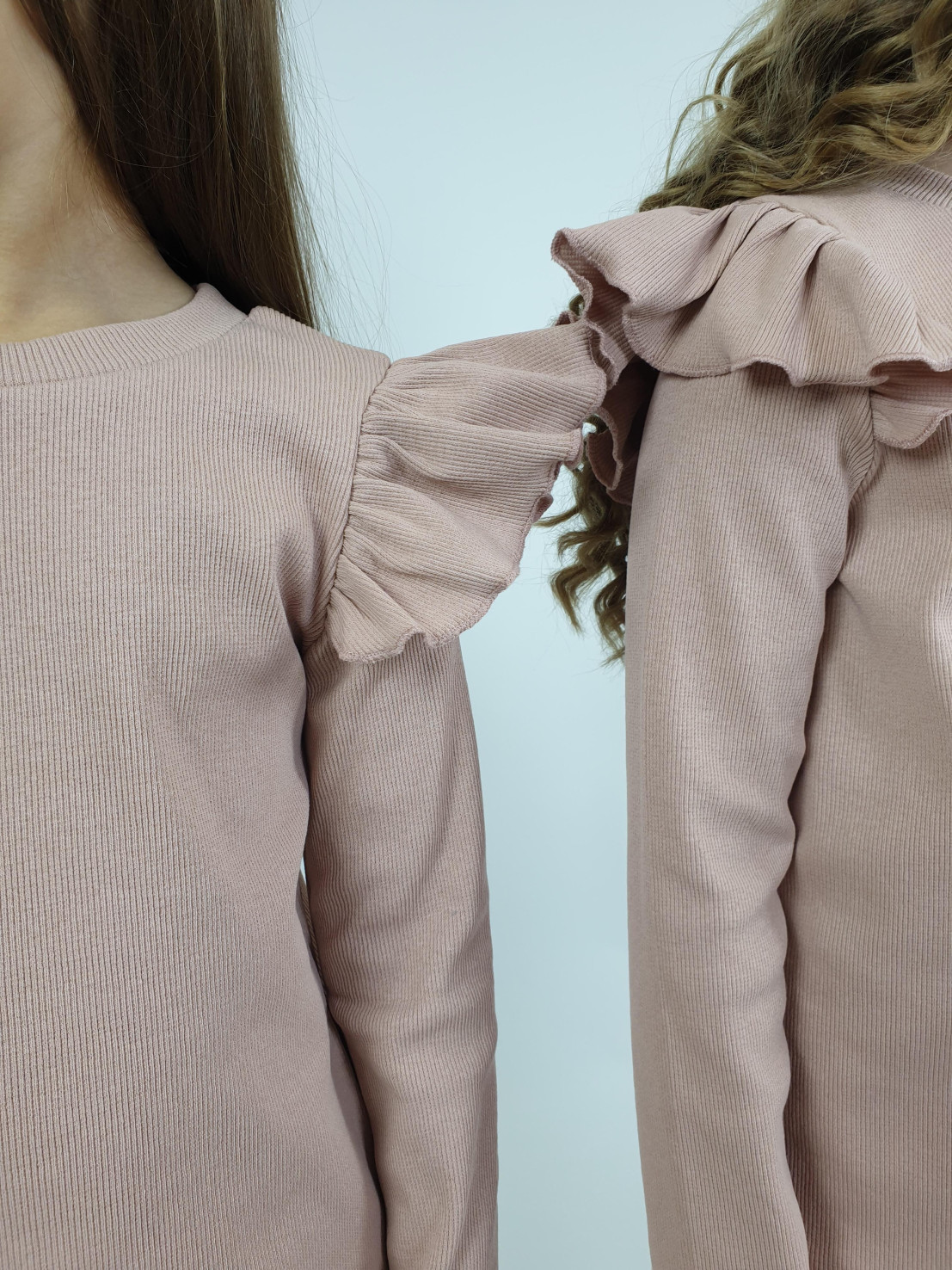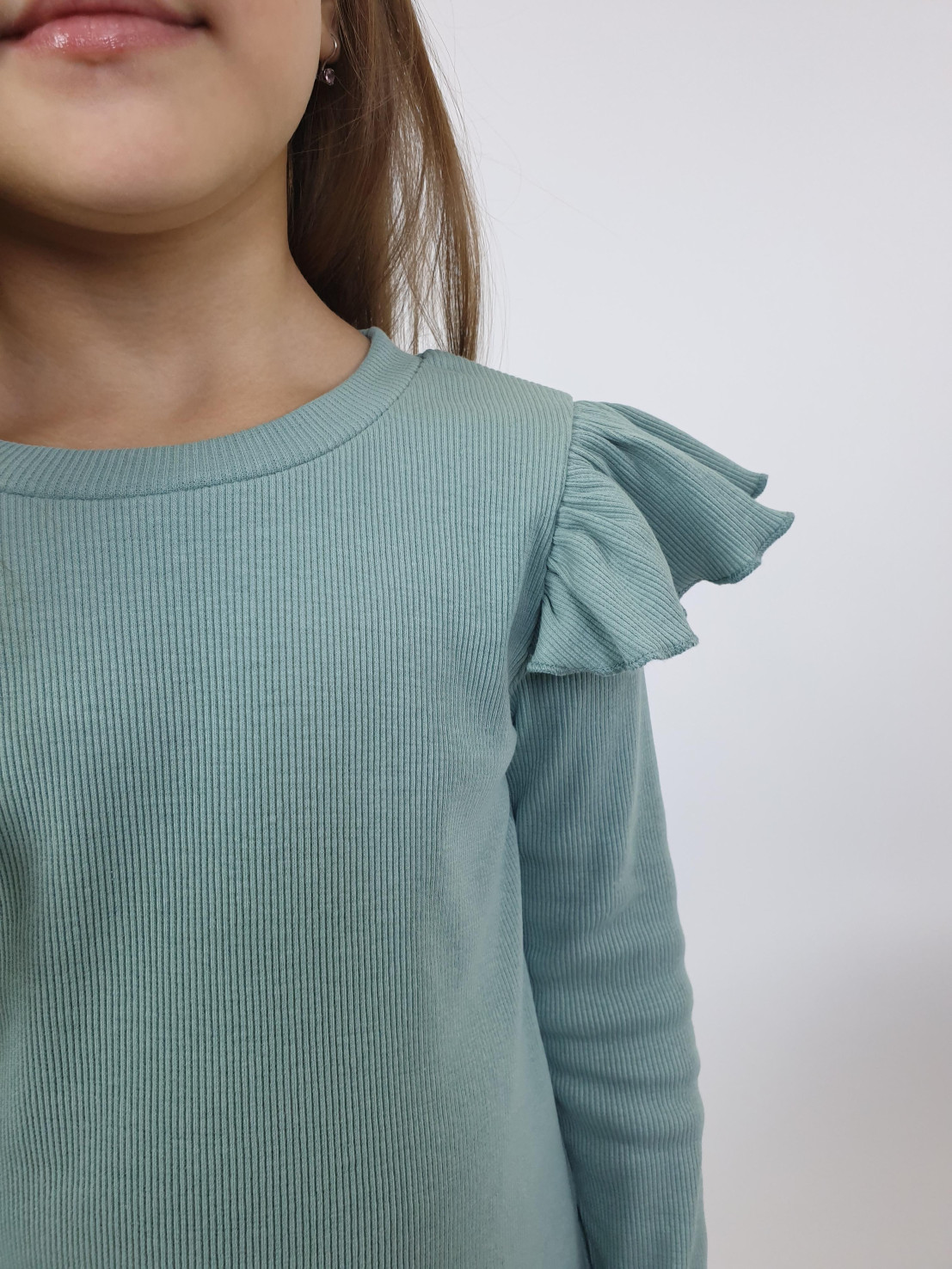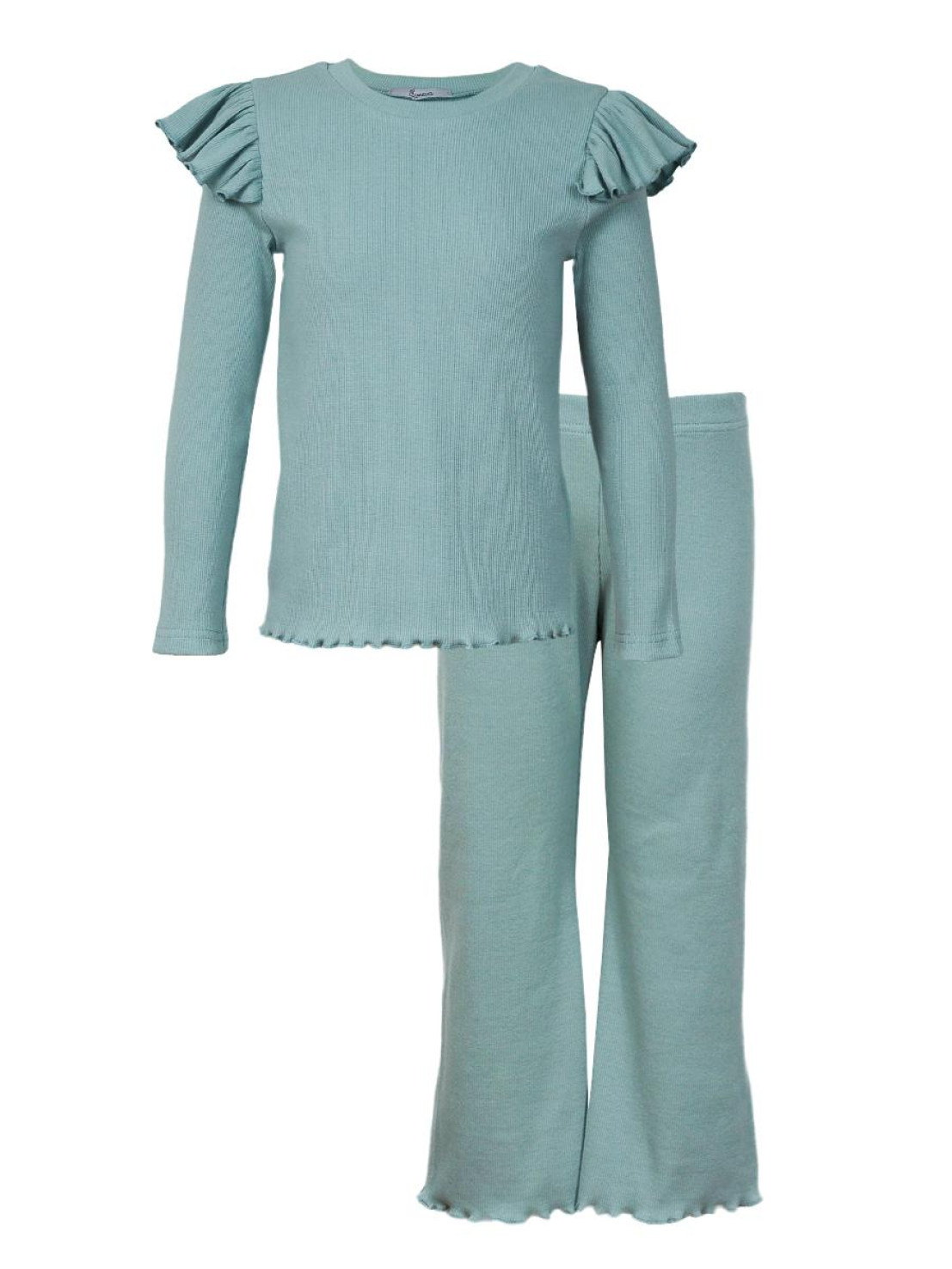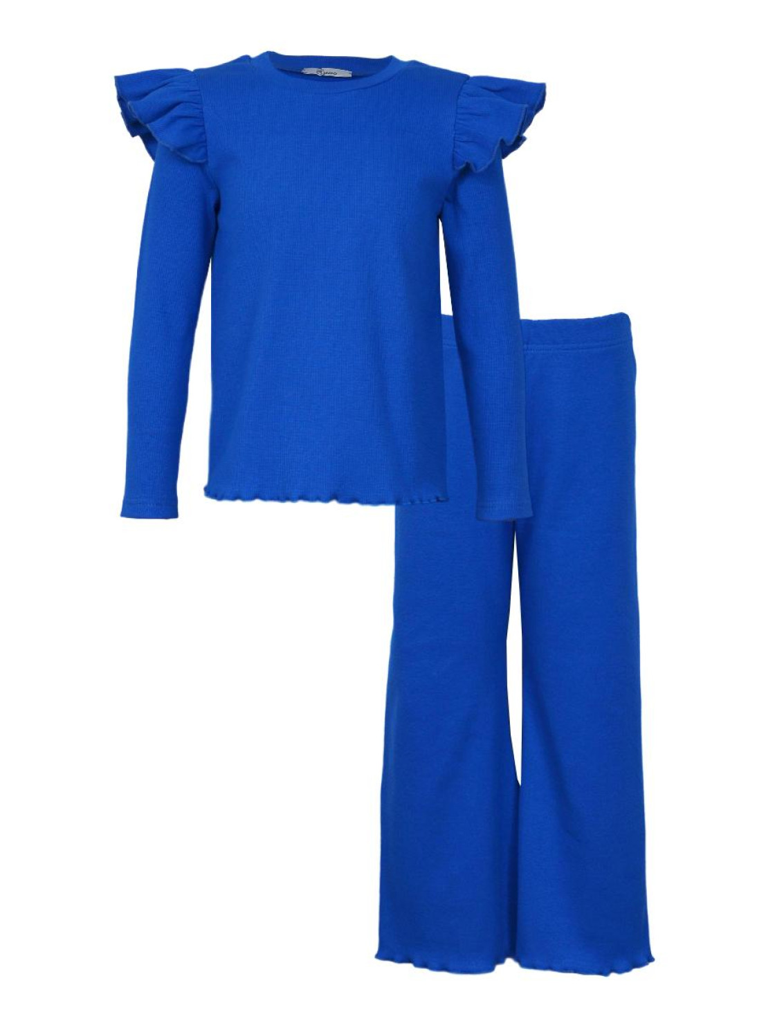 Кашкорсе:95% х/б,5% лайкра. Джемпер-прямой,рукав втачной,длинный.В пройму вставлена рюша.Горловина обработана планкой. Брюки-длинные,расширены к низу,вверху на резинке.