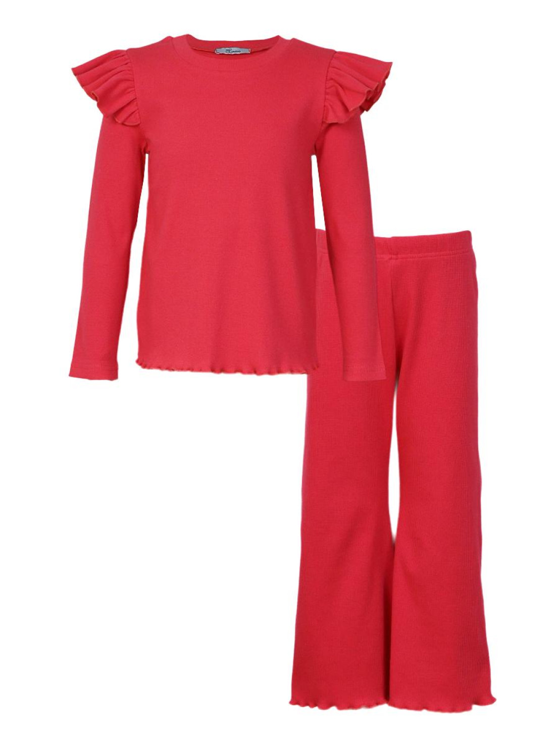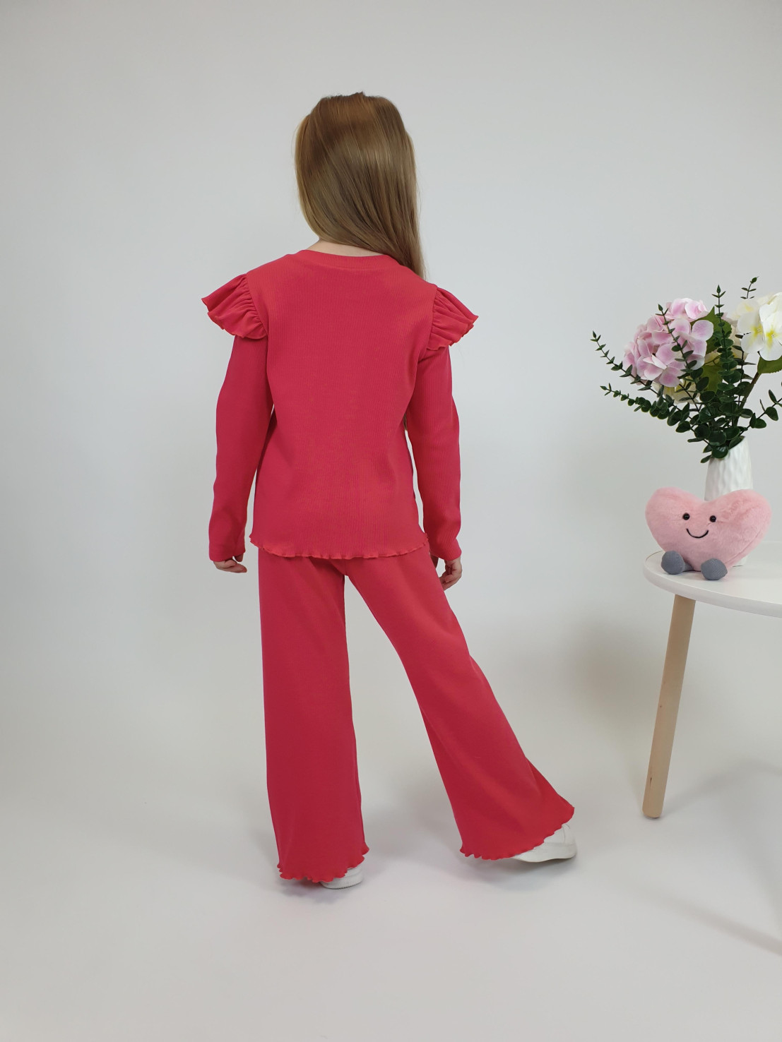 Кашкорсе:95% х/б,5% лайкра. Джемпер-прямой,рукав втачной,длинный.В пройму вставлена рюша.Горловина обработана планкой. Брюки-длинные,расширены к низу,вверху на резинке.