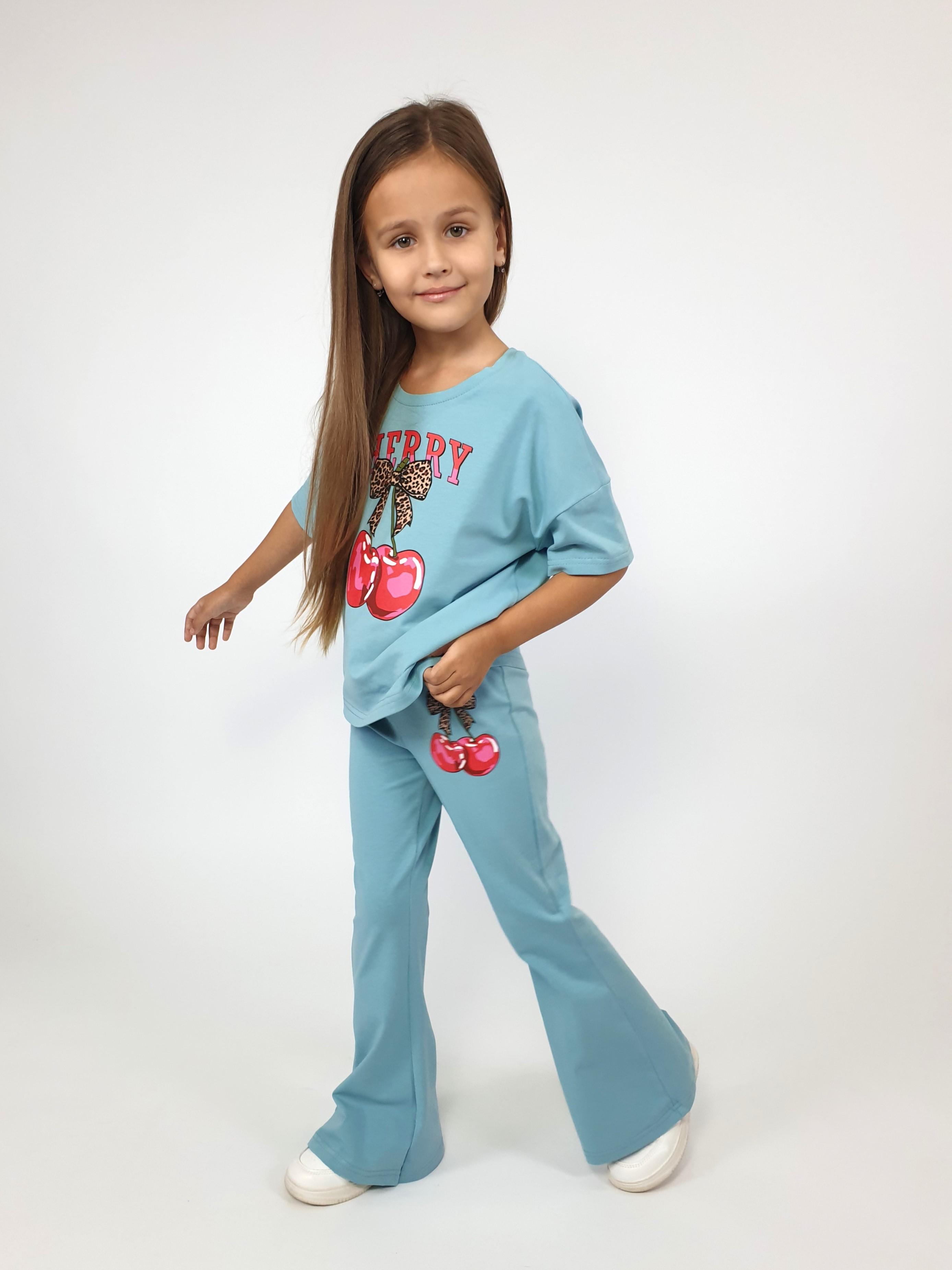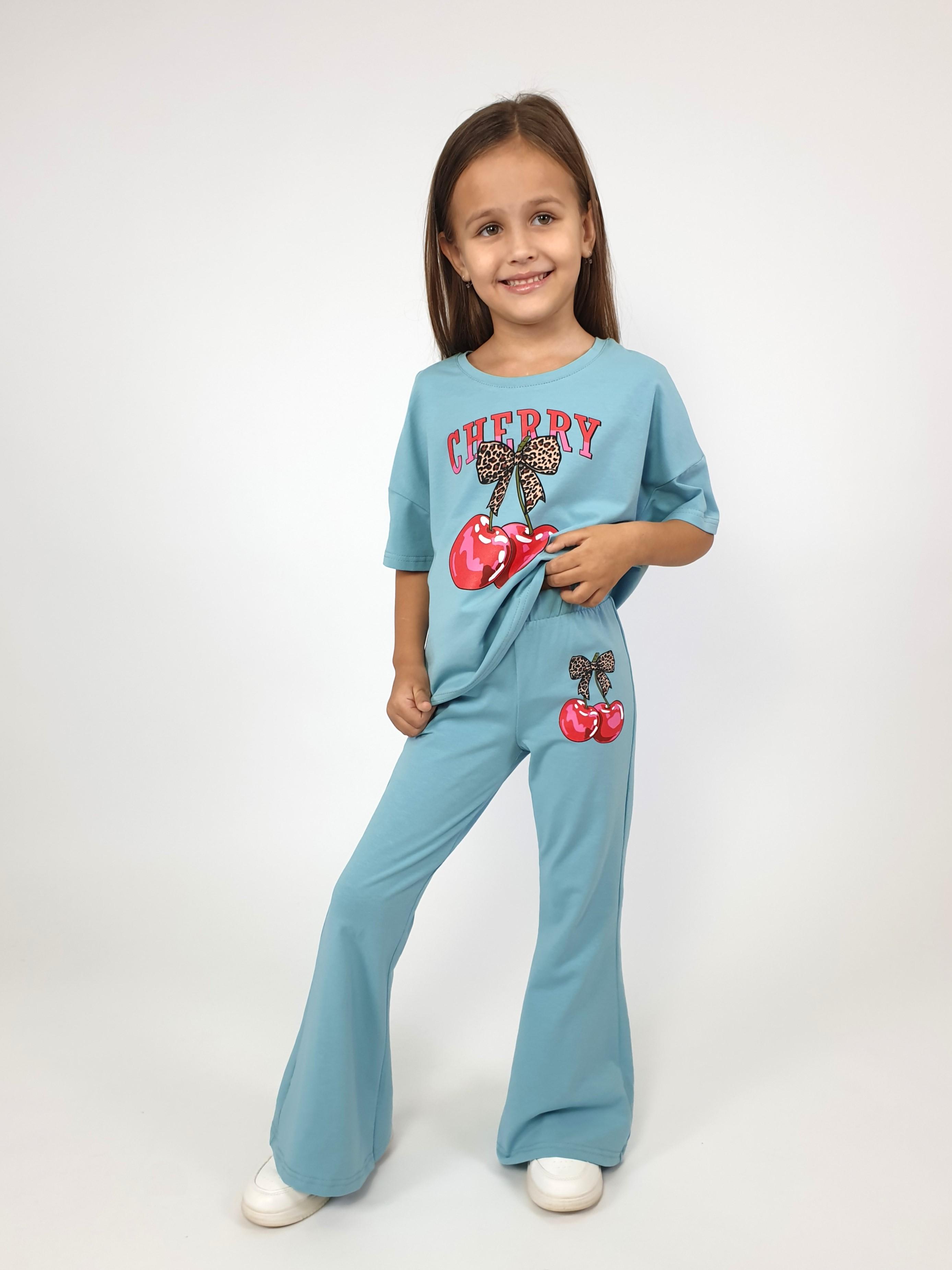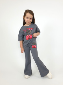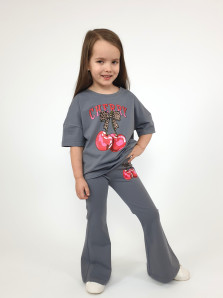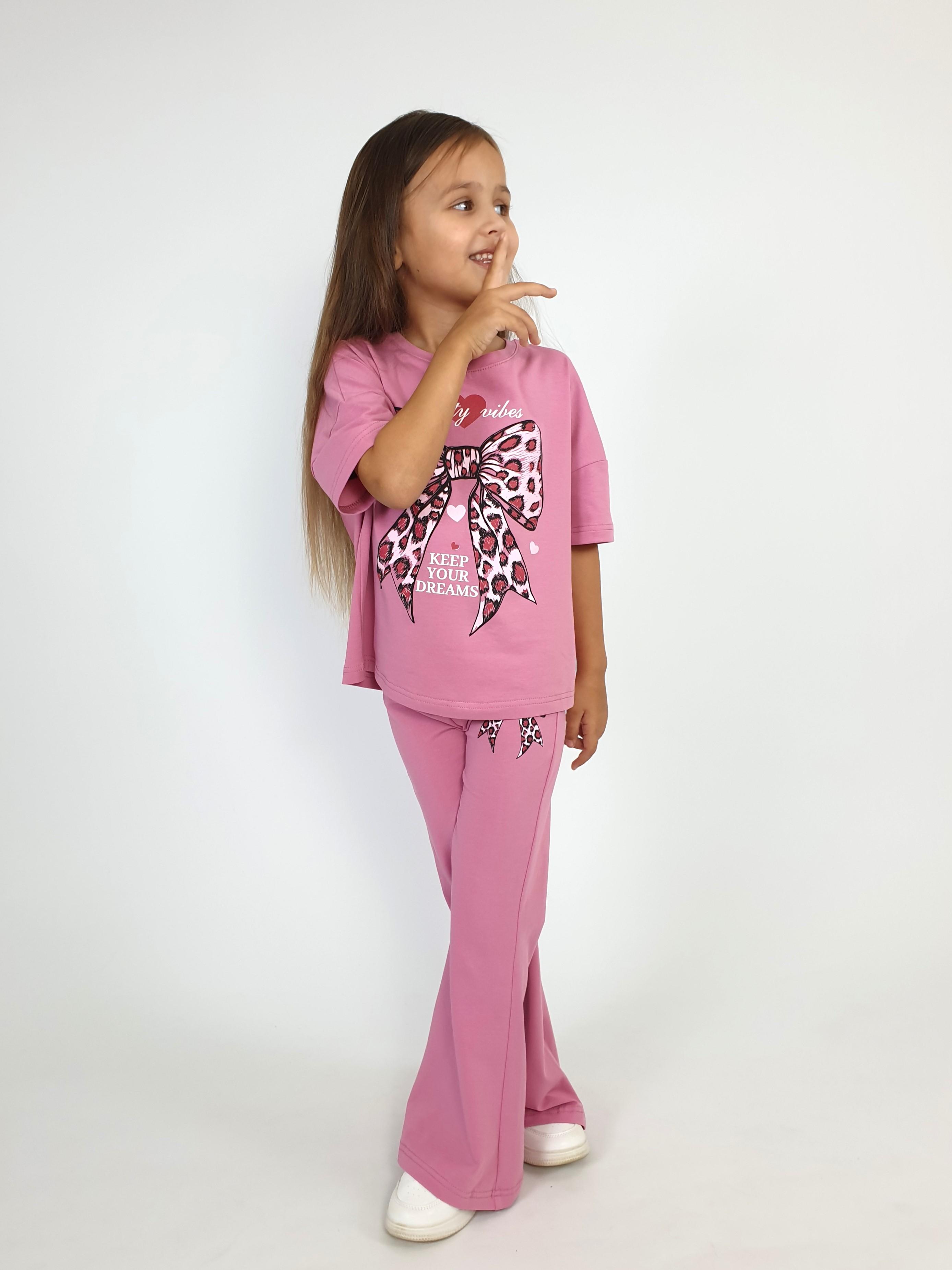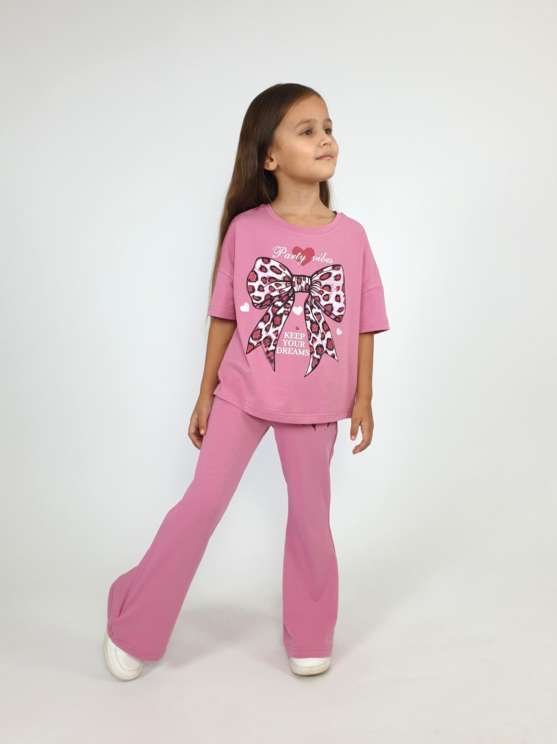 Кулирное полотно:95% х/б,5% лайкра. Джемпер(оверсайз),спущенное плечо,короткий рукав.Горловина обработана планкой.Печать на переде. Брюки-на поясе с резинкой,расширены к низу.Печать слева,вверху.