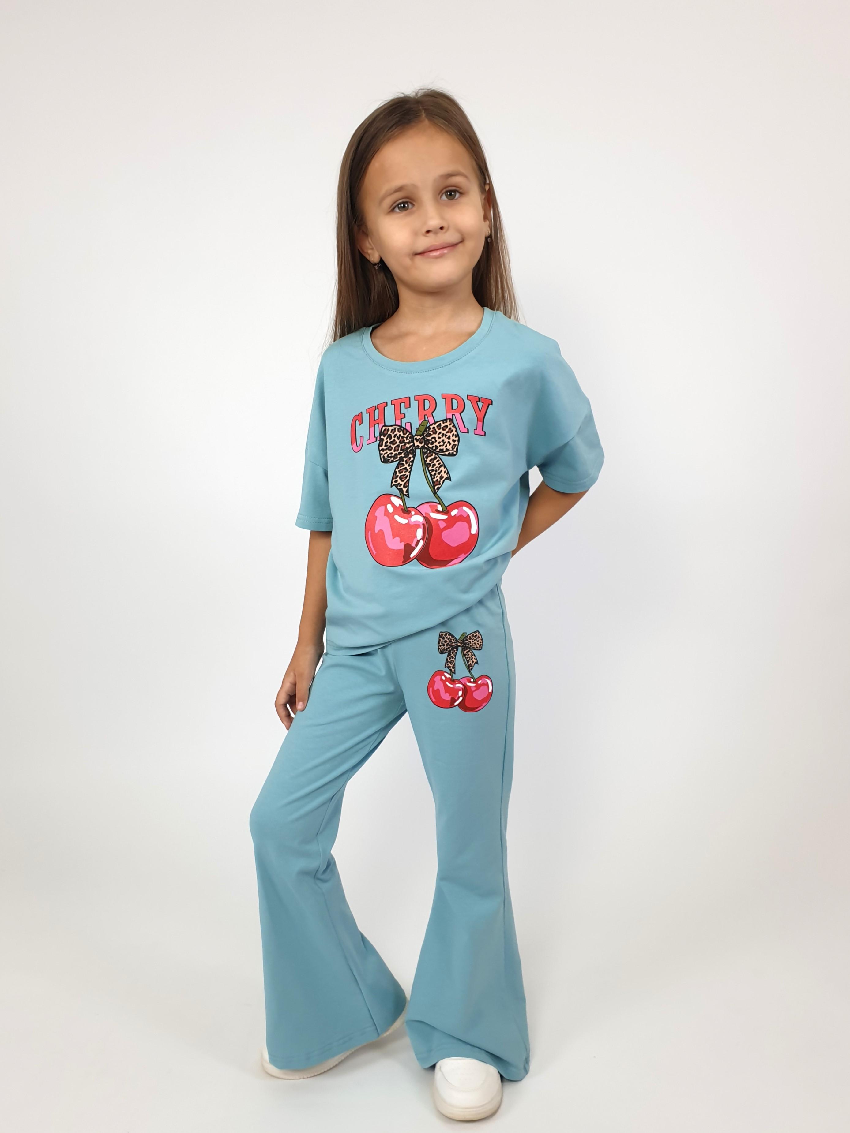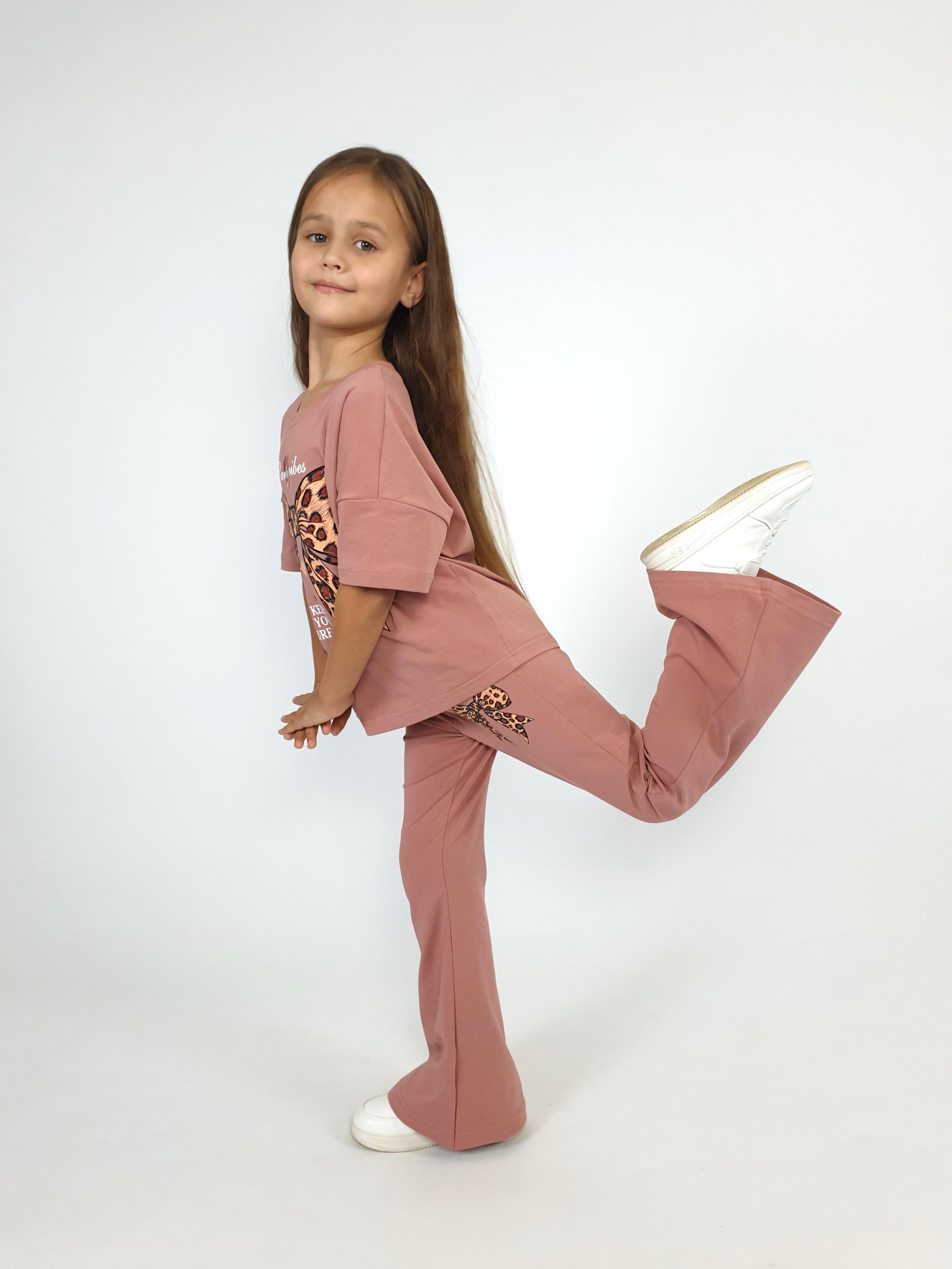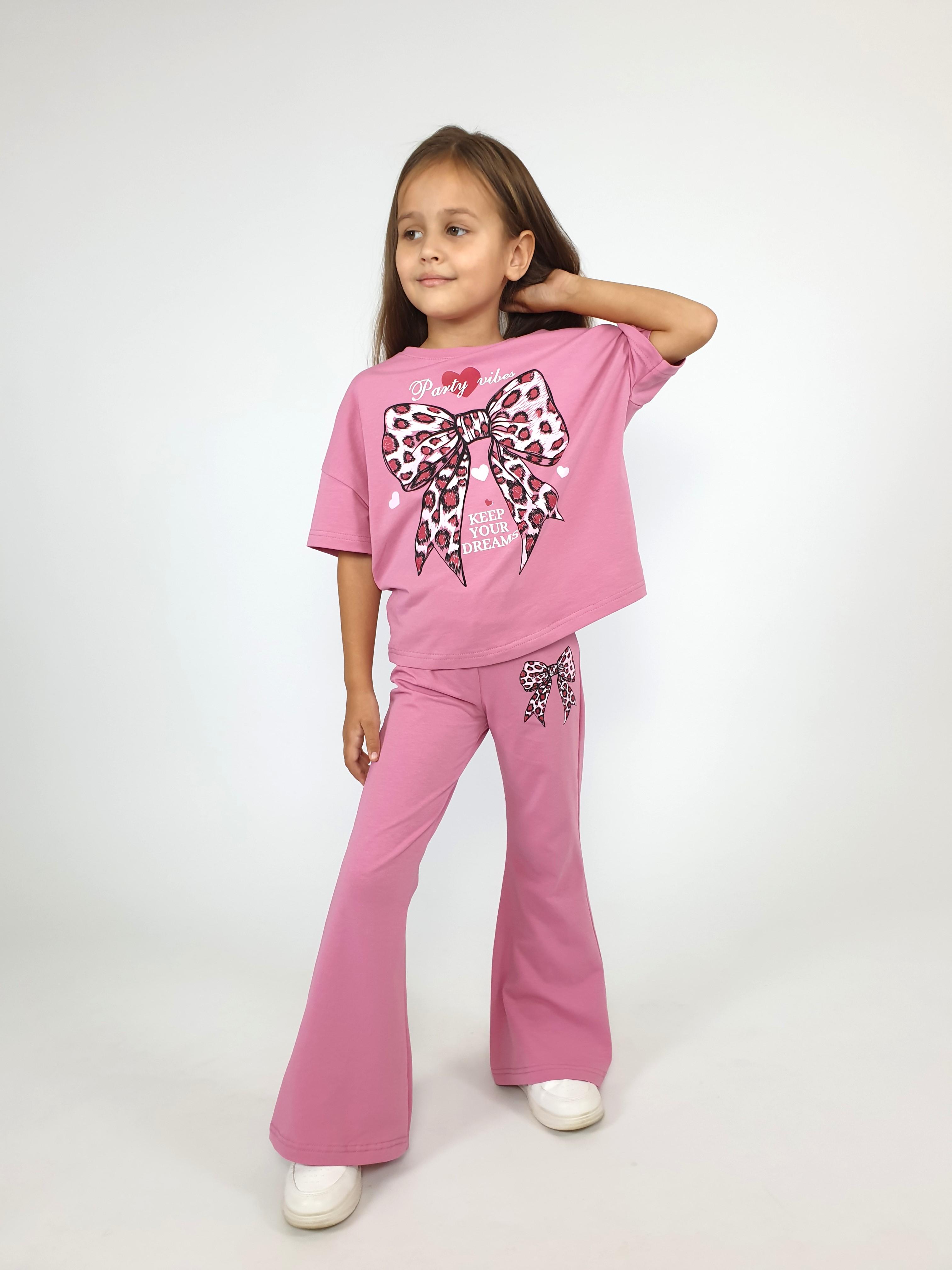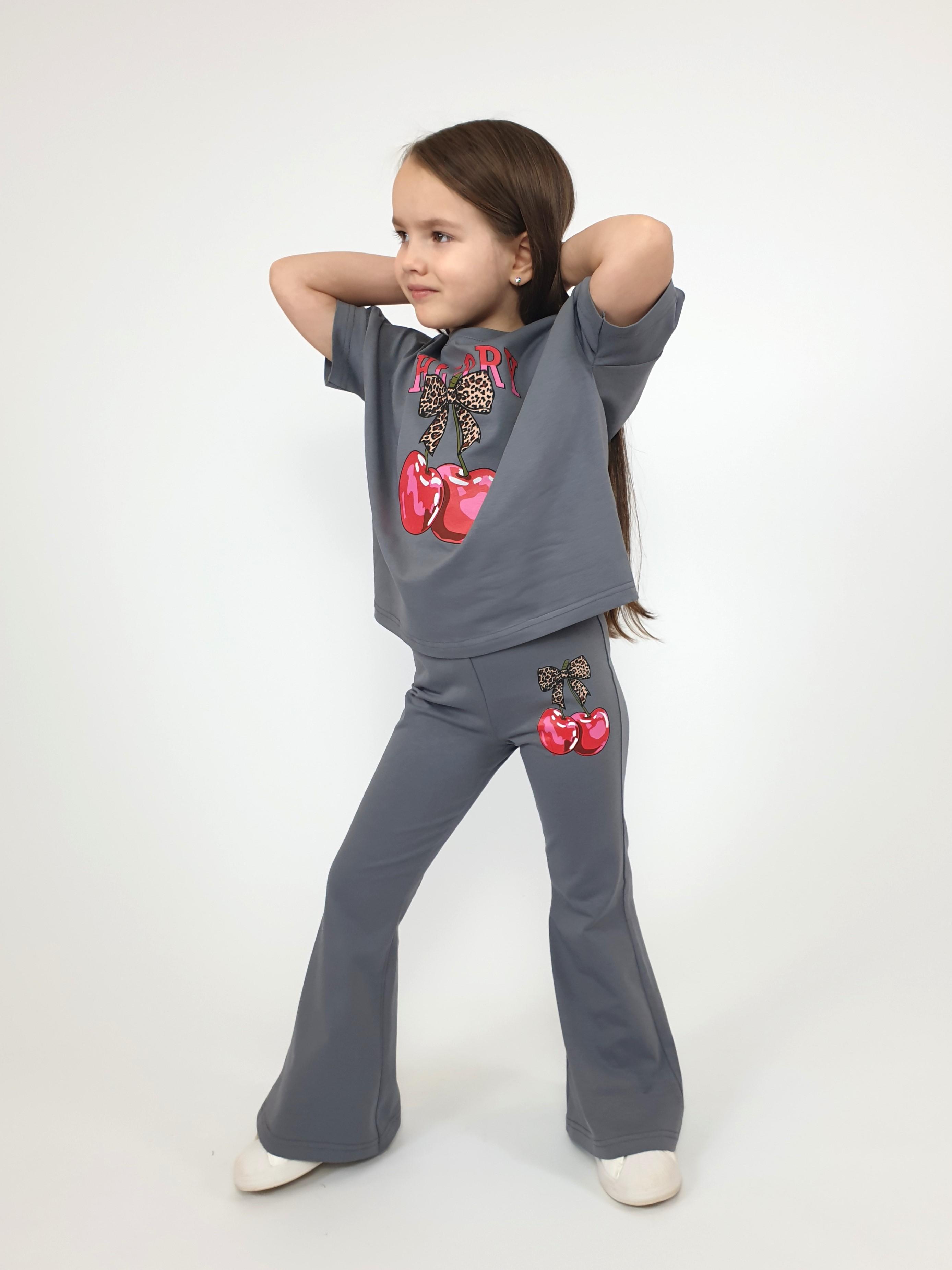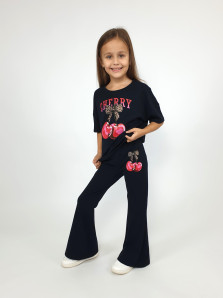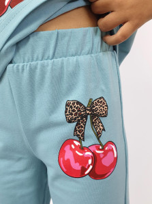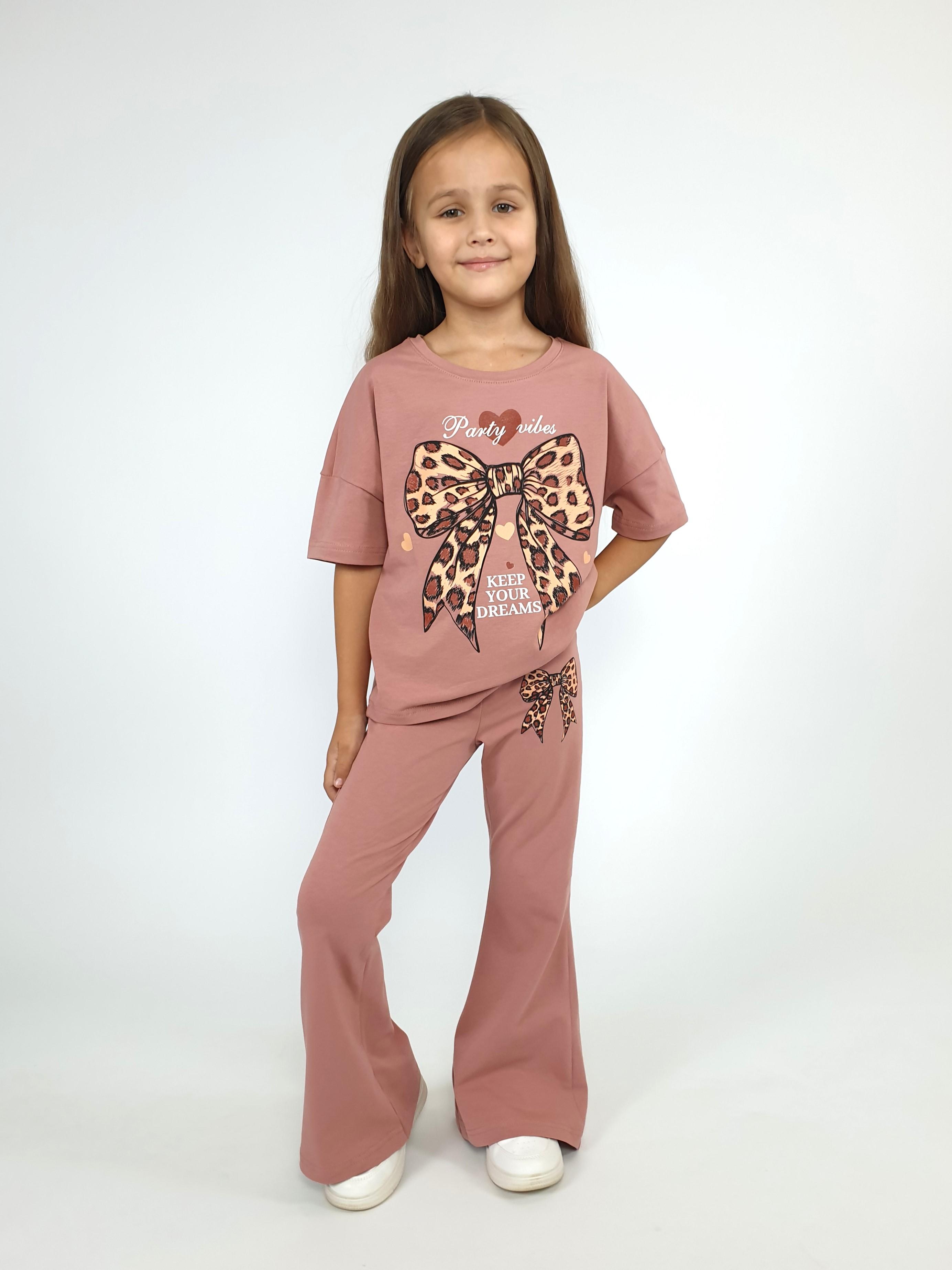 Кулирное полотно:95% х/б,5% лайкра. Джемпер(оверсайз),спущенное плечо,короткий рукав.Горловина обработана планкой.Печать на переде. Брюки-на поясе с резинкой,расширены к низу.Печать слева,вверху.