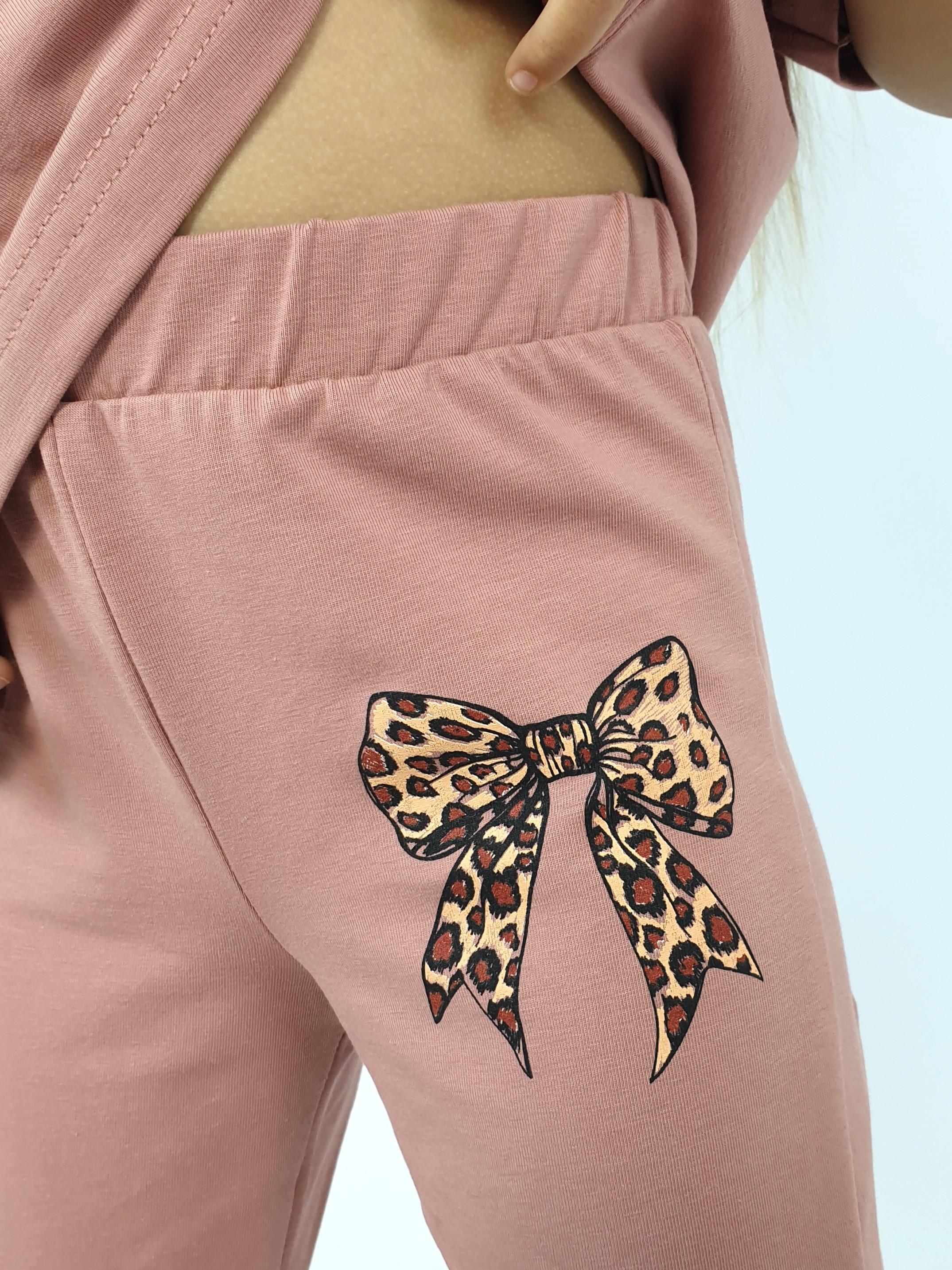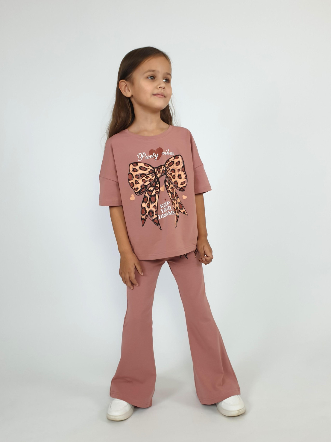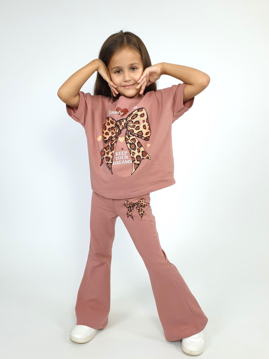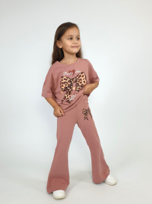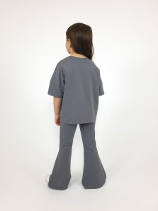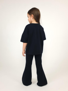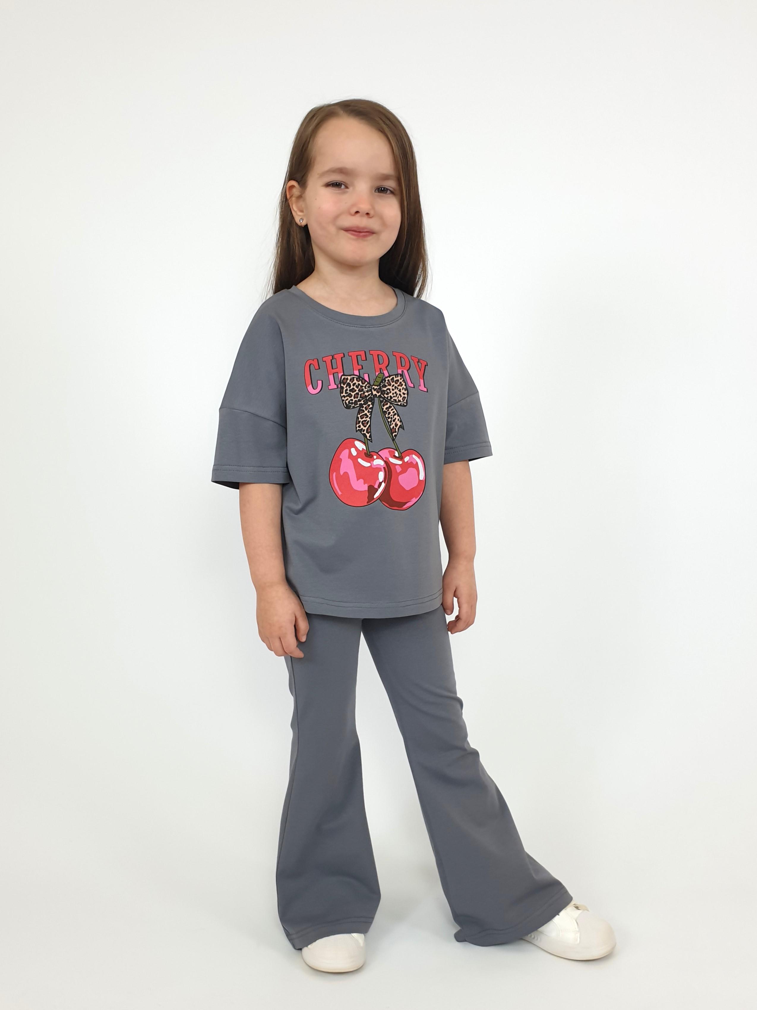 Кулирное полотно:95% х/б,5% лайкра. Джемпер(оверсайз),спущенное плечо,короткий рукав.Горловина обработана планкой.Печать на переде. Брюки-на поясе с резинкой,расширены к низу.Печать слева,вверху.