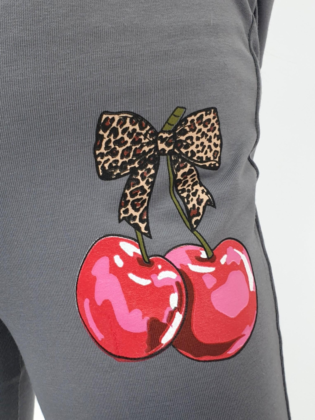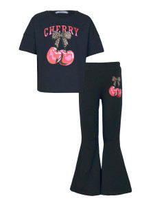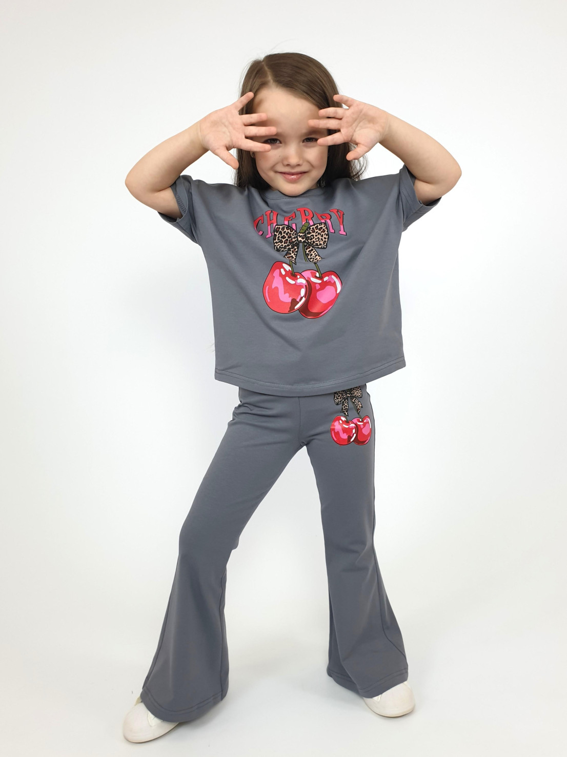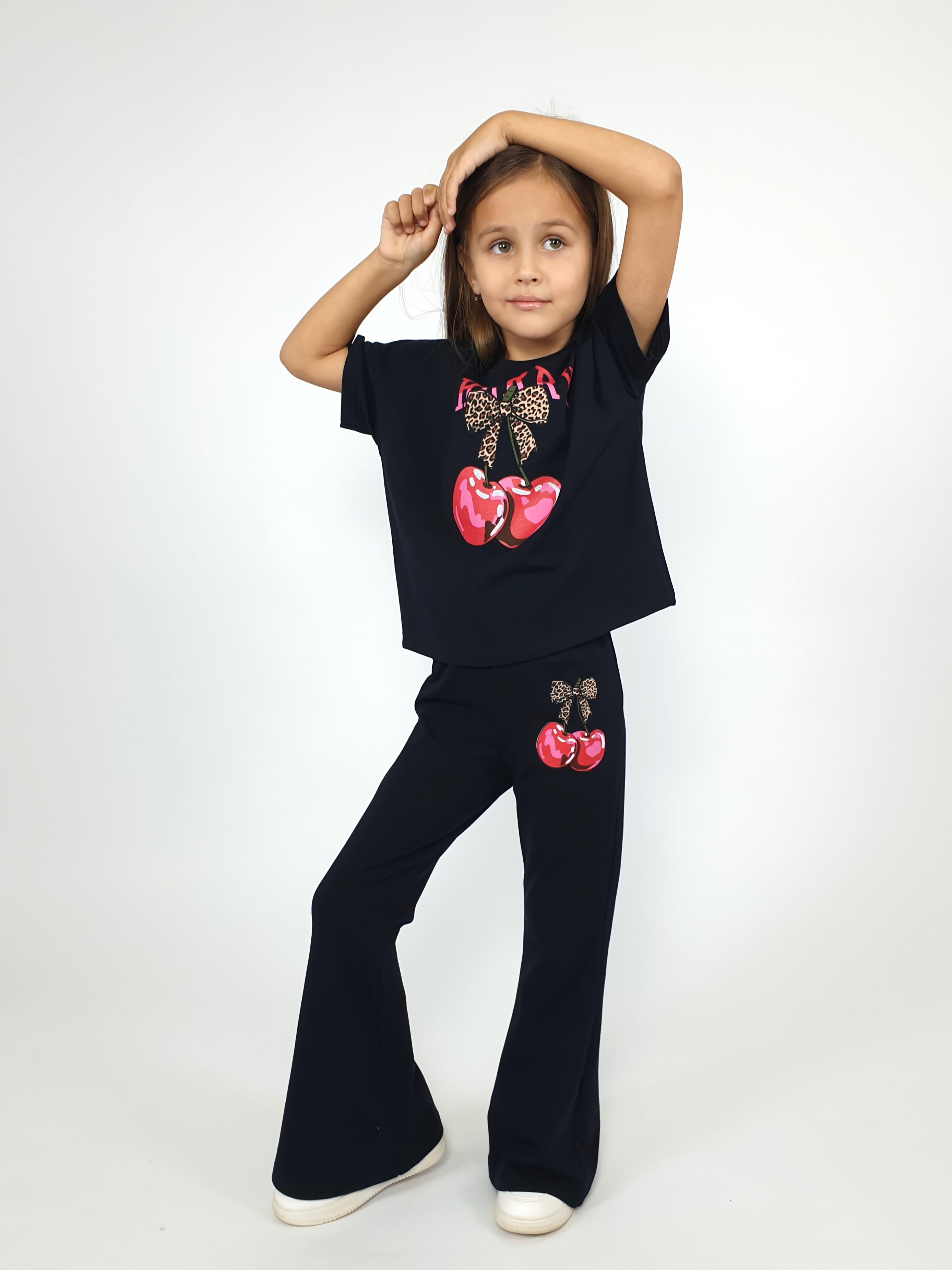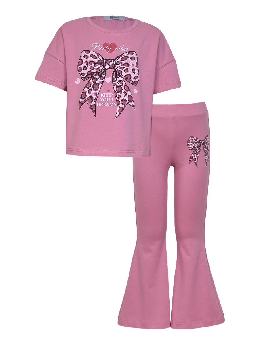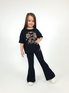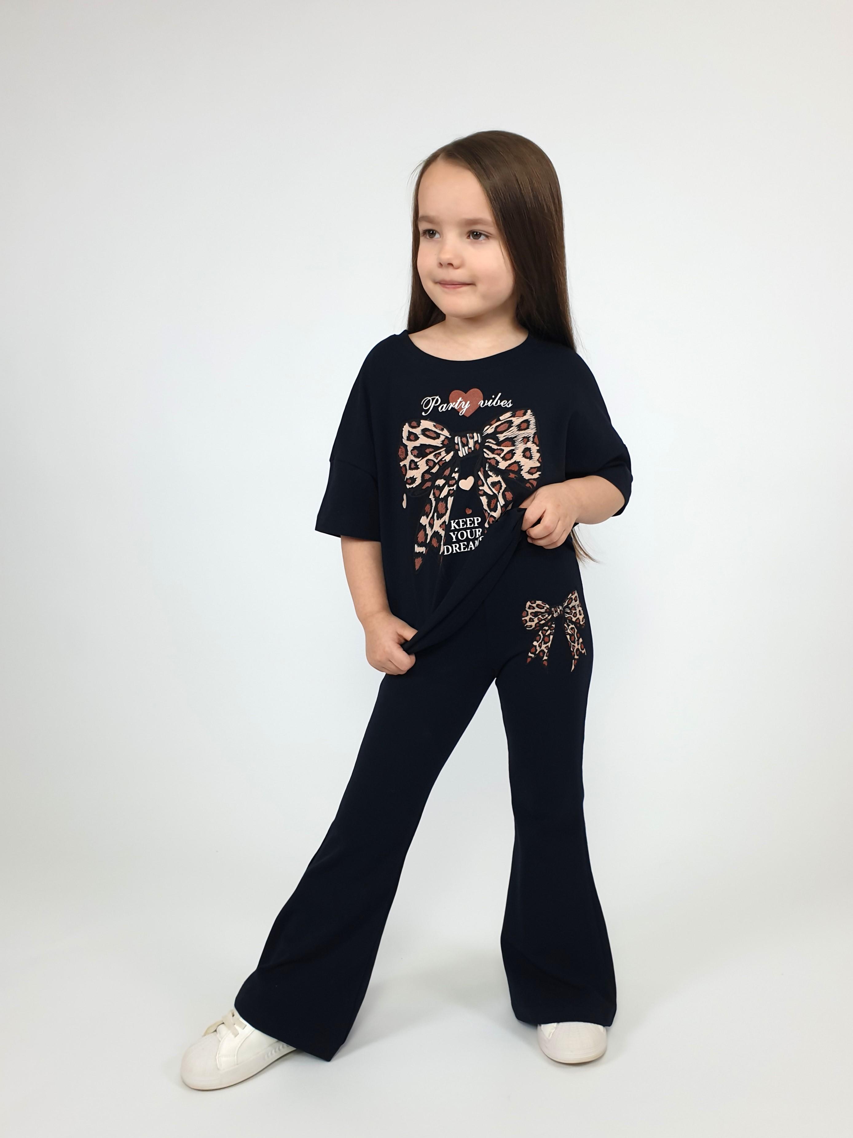 Кулирное полотно:95% х/б,5% лайкра. Джемпер(оверсайз),спущенное плечо,короткий рукав.Горловина обработана планкой.Печать на переде. Брюки-на поясе с резинкой,расширены к низу.Печать слева,вверху.