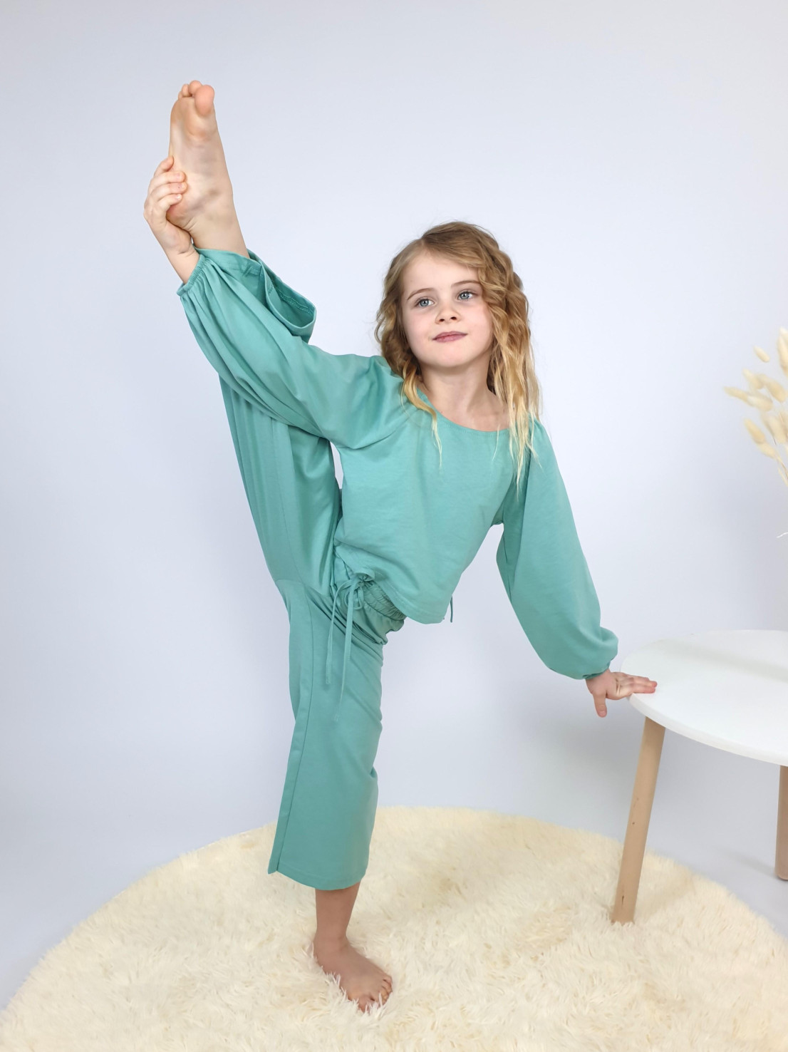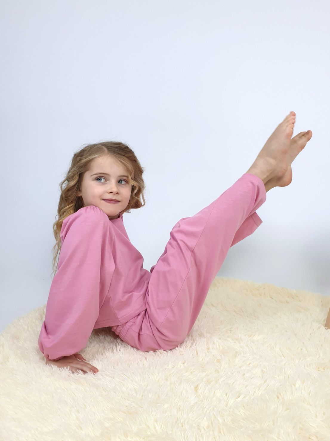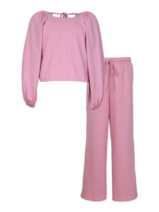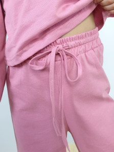Кулирное полотно:100% х/б. Джемпер-прямой,рукав реглан,длинный,внизу на резинке.Горловина по переду и спинке подшита,в области плеча собрана на резинку.На спинке вырез завязан на бант. Брюки-длинные,свободные на поясе с резинкой и шнуром.