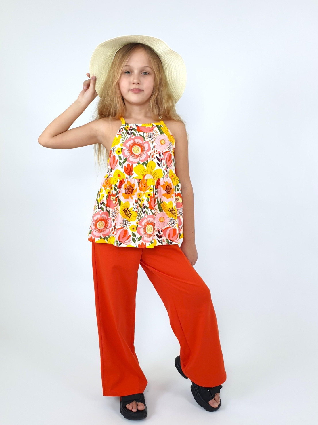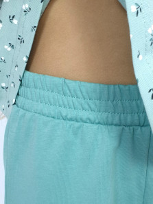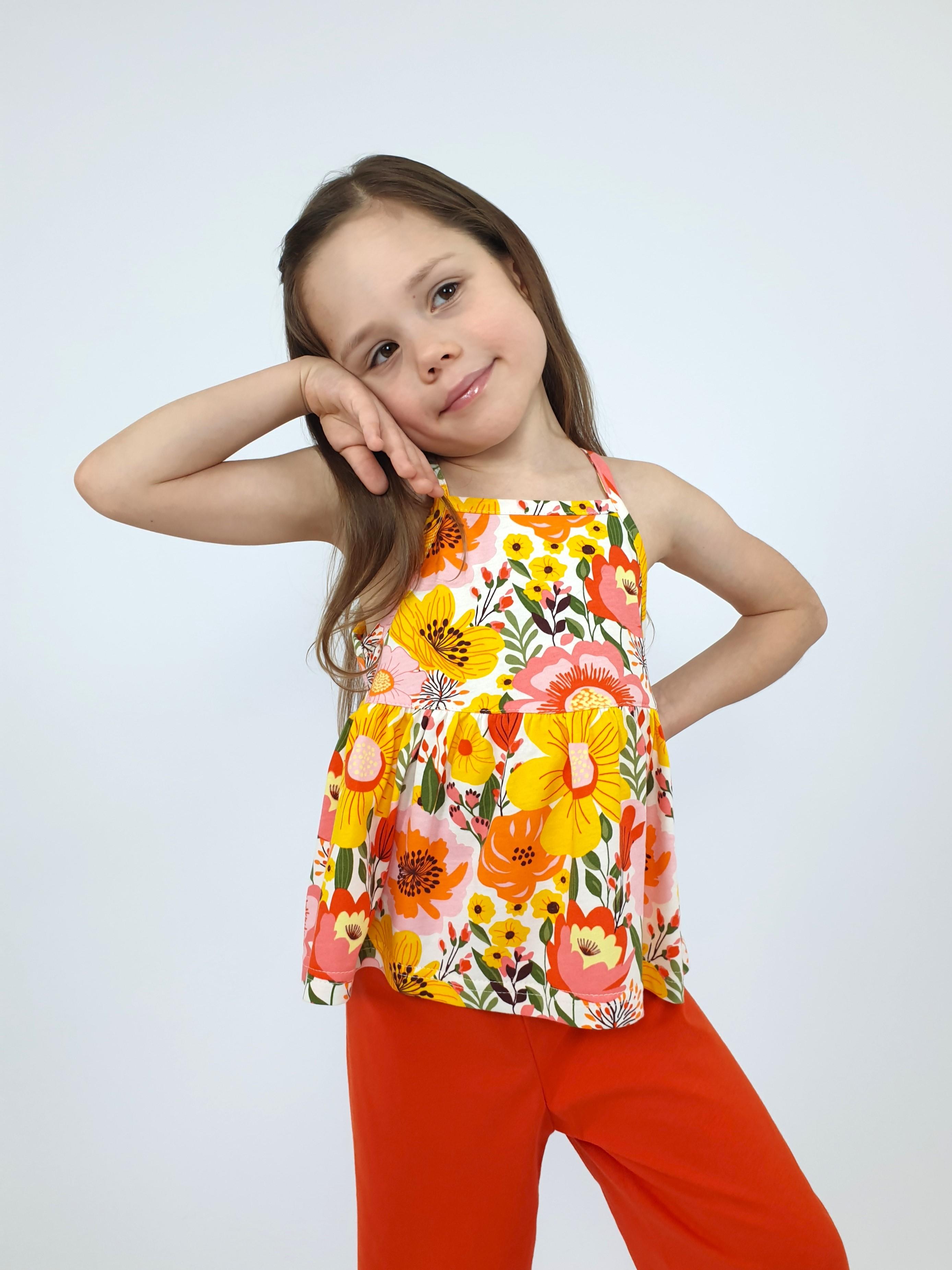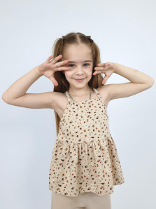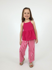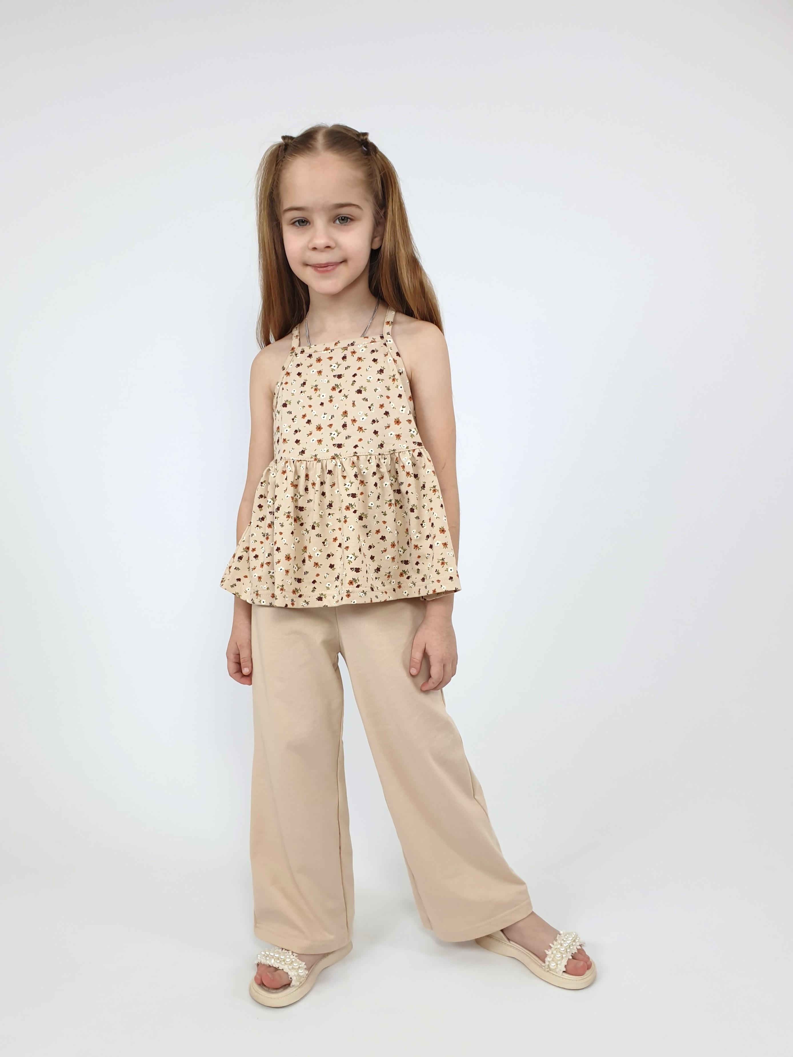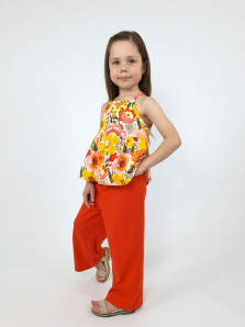Кулирное полотно(гладь+набивка):100% х/б. Джемпер-силуэт трапеция на кокетке с воланом,на лямках,без рукава.Горловина,пройма-окантованы. Брюки-длинные,свободные.На поясе с резинкой.