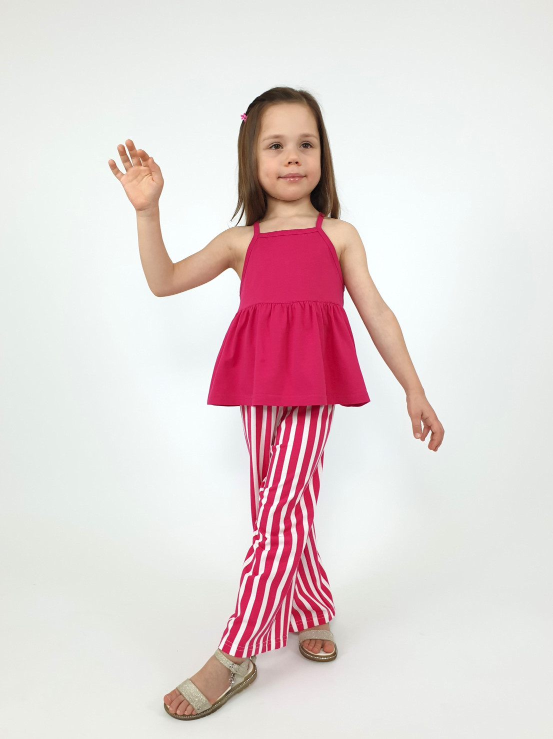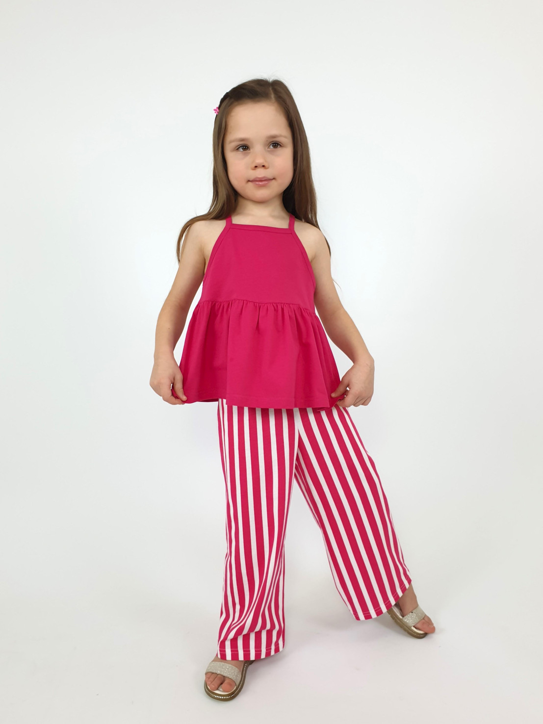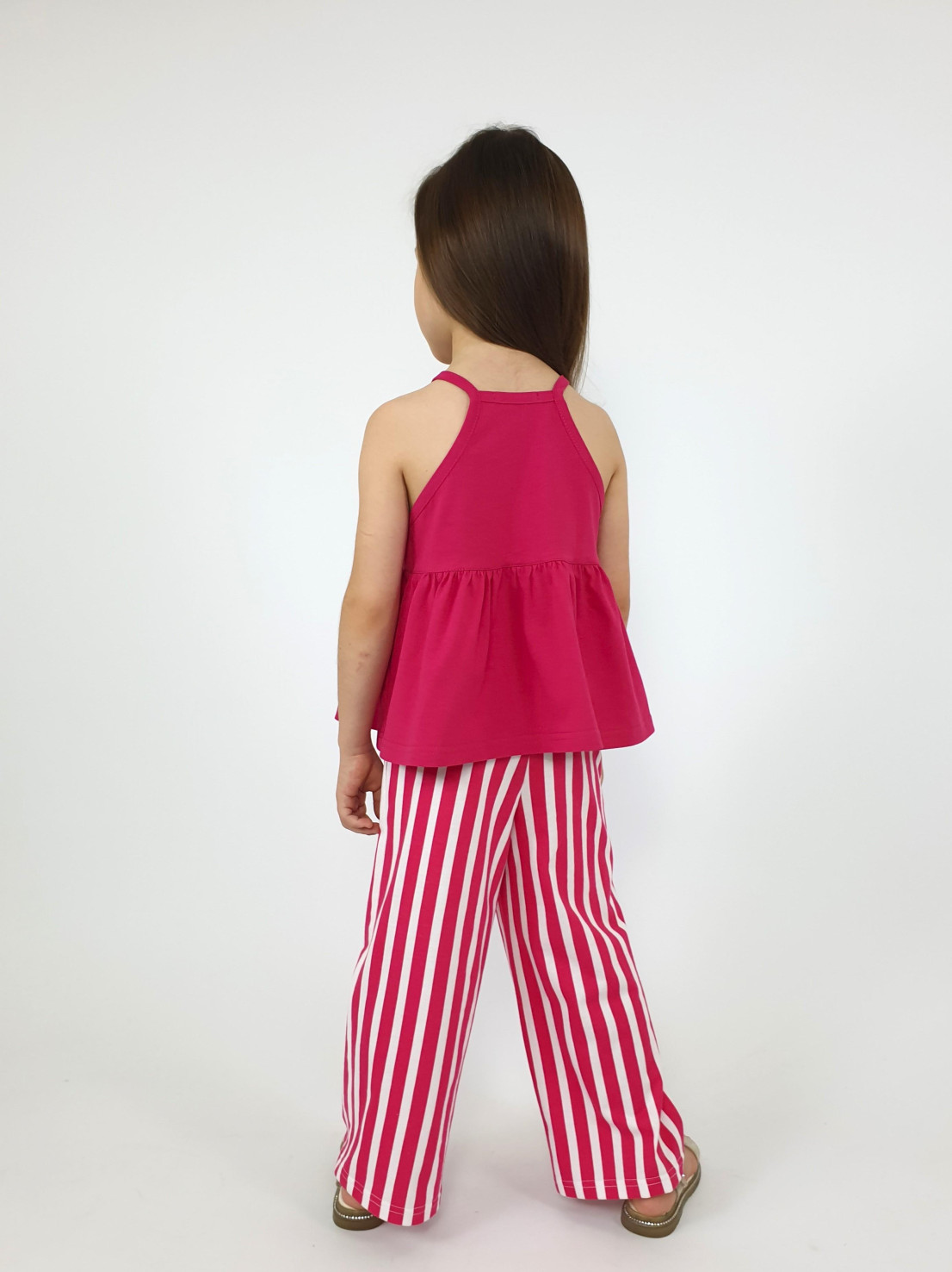 Кулирное полотно(гладь+набивка):100% х/б. Джемпер-силуэт трапеция на кокетке с воланом,на лямках,без рукава.Горловина,пройма-окантованы. Брюки-длинные,свободные.На поясе с резинкой.