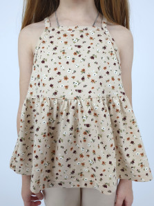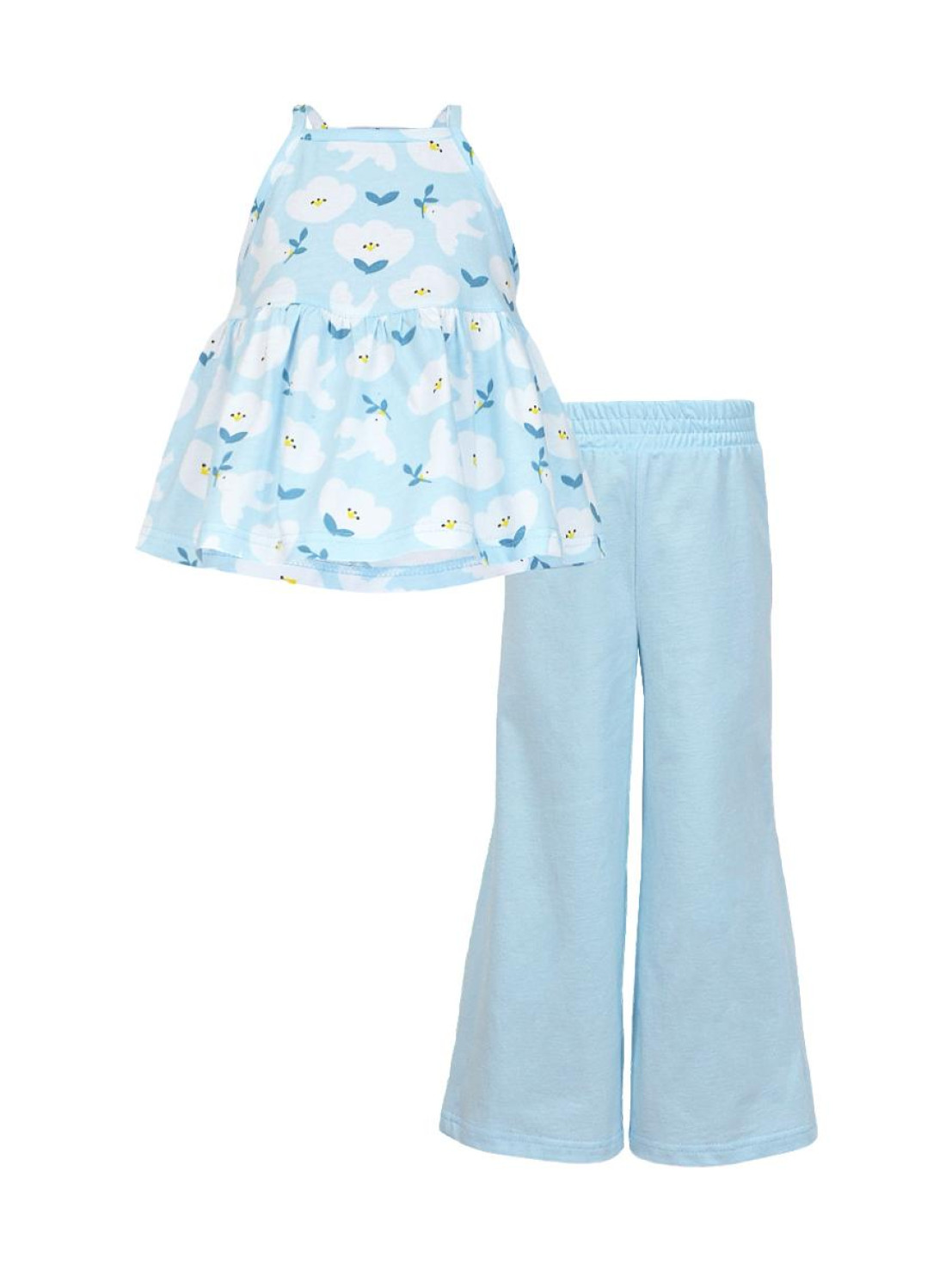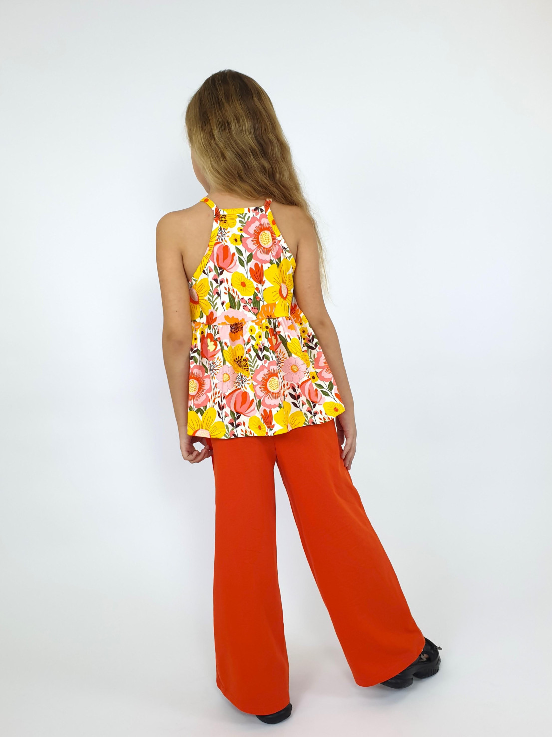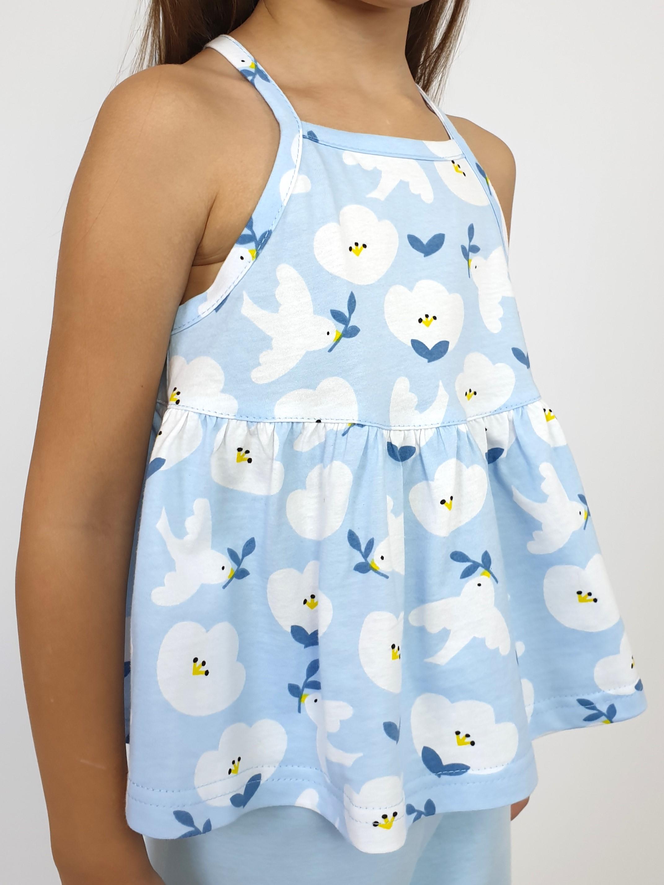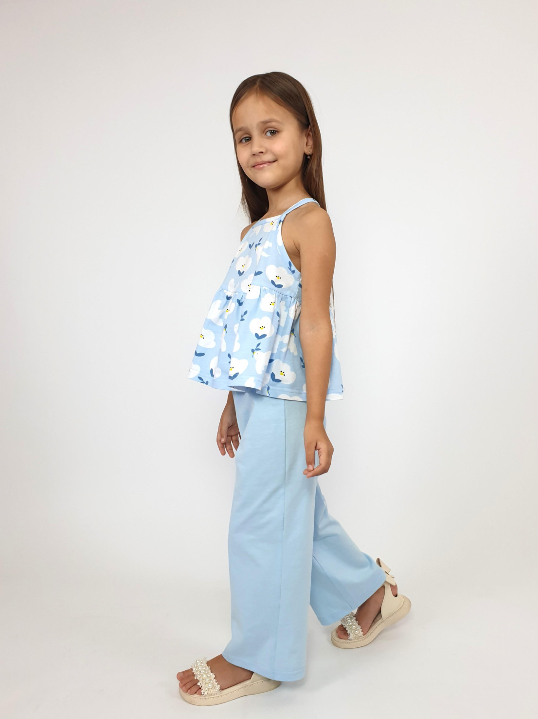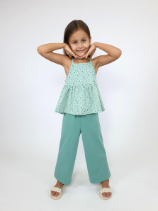 Кулирное полотно(гладь+набивка):100% х/б. Джемпер-силуэт трапеция на кокетке с воланом,на лямках,без рукава.Горловина,пройма-окантованы. Брюки-длинные,свободные.На поясе с резинкой.