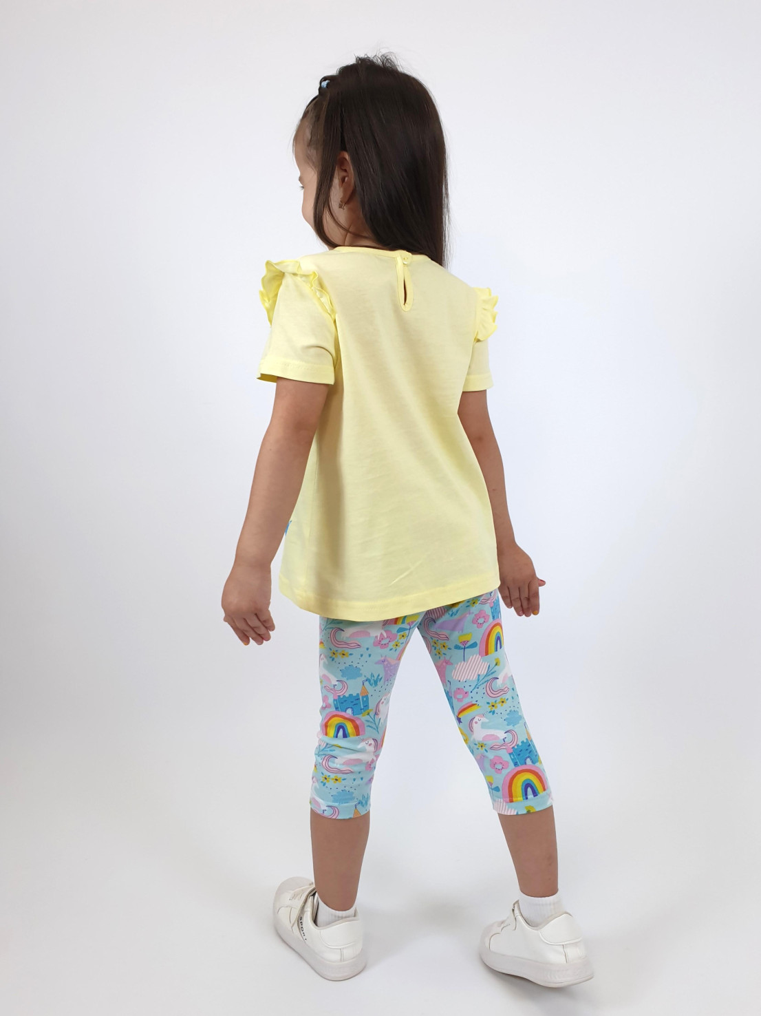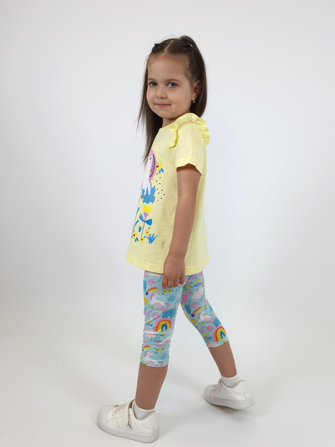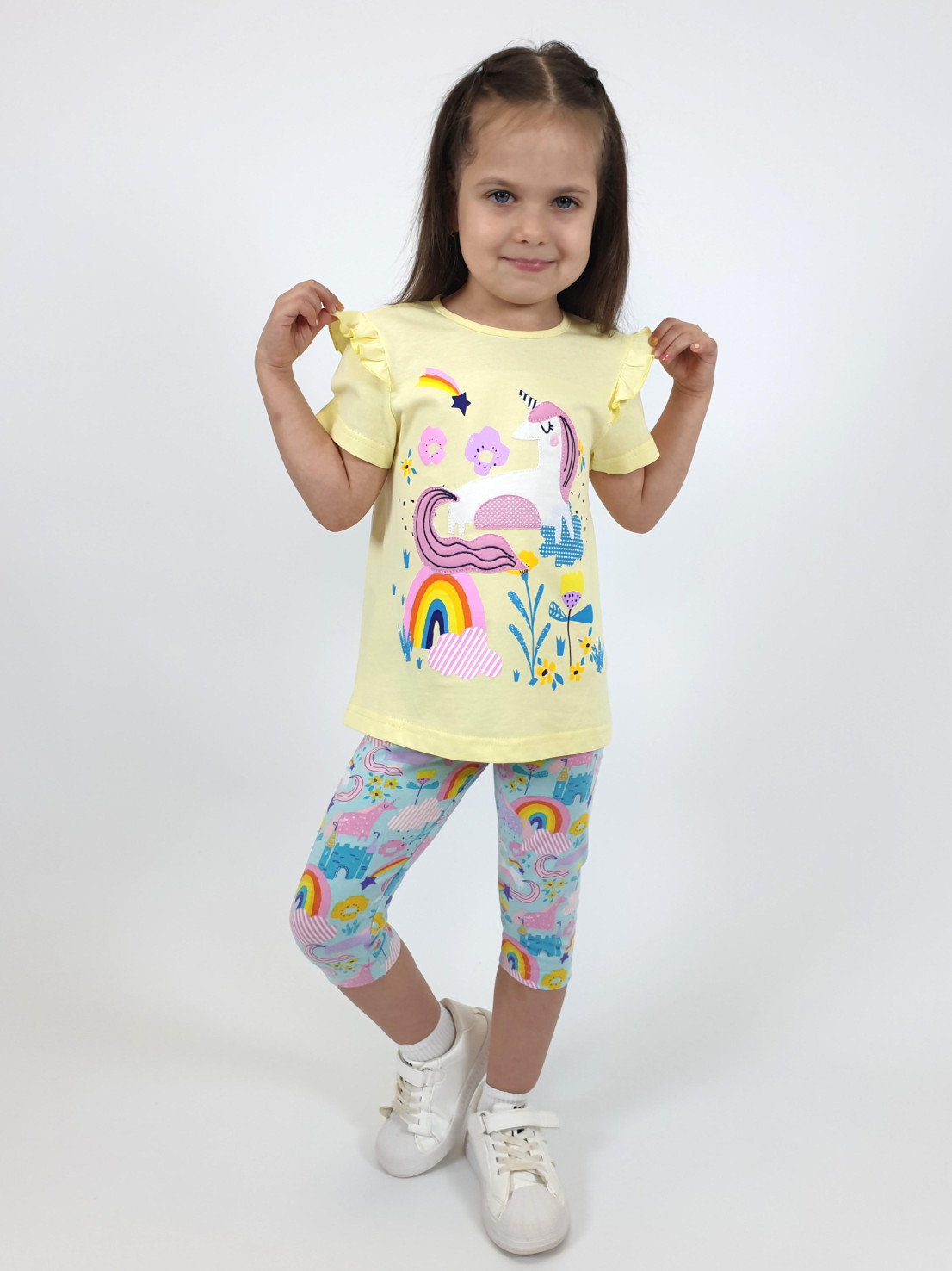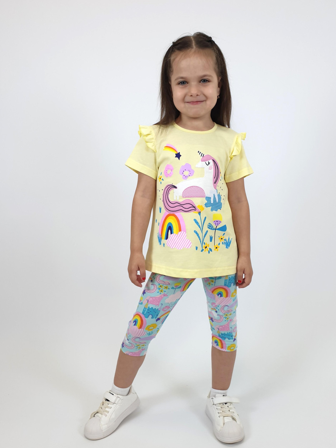 Кулирное полотно:100%х/б;95% х/б,5 % лайкра. Джемпер-силуэт трапеция,короткий втачной рукав,в пройме рюша.Горловина окантована,застежка на пуговицу по спинке.Печать и вышивка на переде. Лосины-укороченные, вверху на резинке.