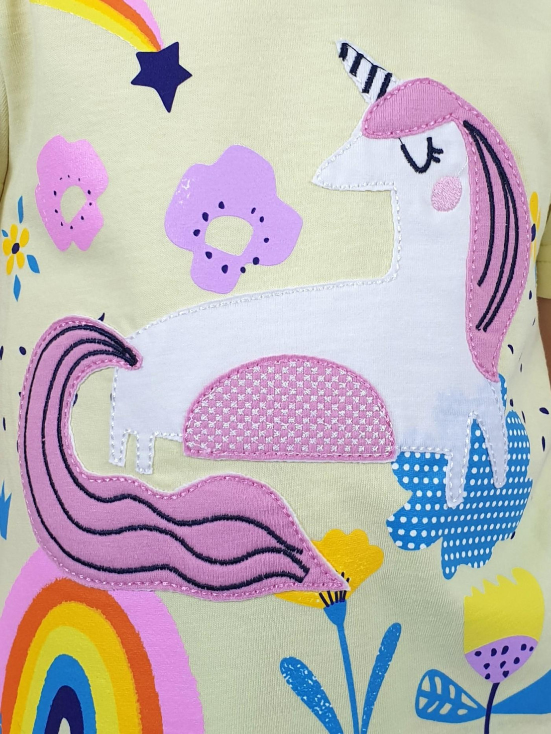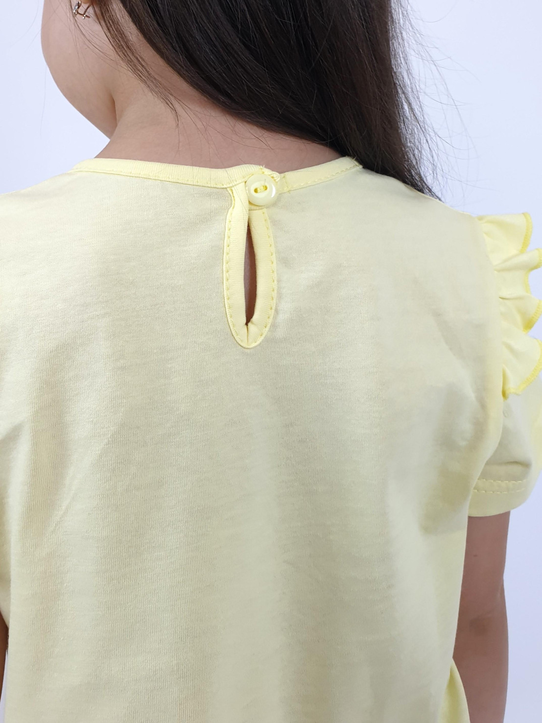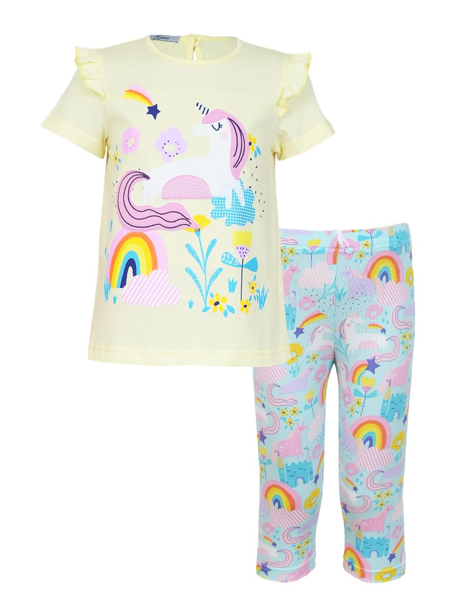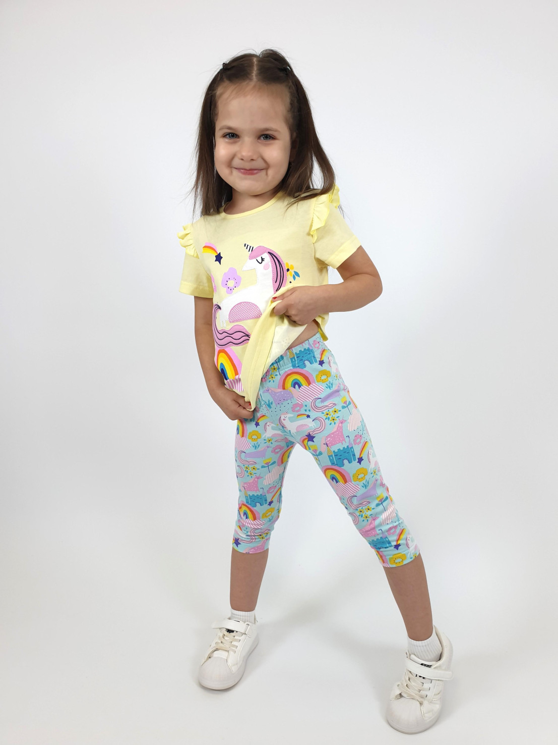 Кулирное полотно:100%х/б;95% х/б,5 % лайкра. Джемпер-силуэт трапеция,короткий втачной рукав,в пройме рюша.Горловина окантована,застежка на пуговицу по спинке.Печать и вышивка на переде. Лосины-укороченные, вверху на резинке.