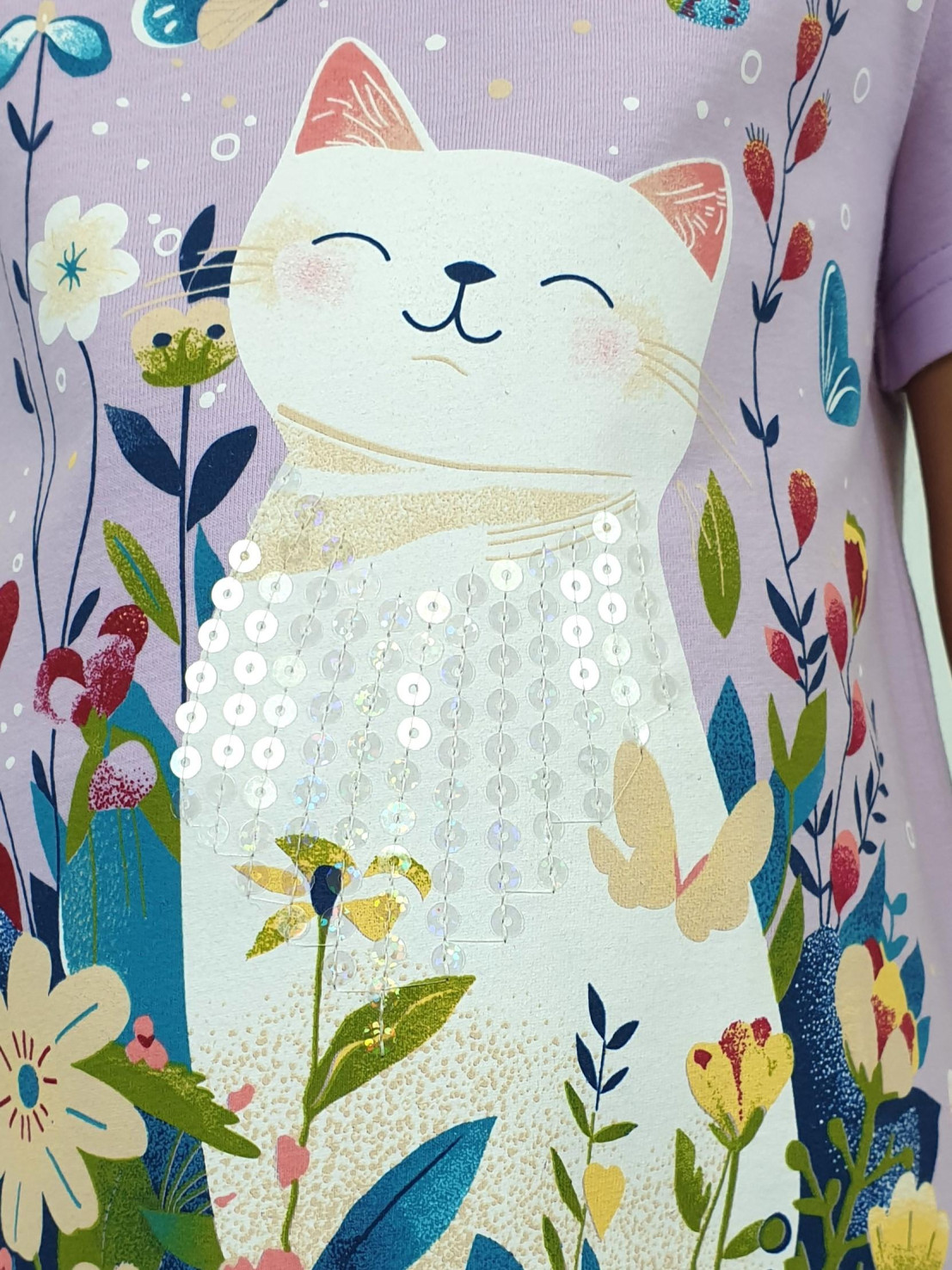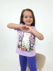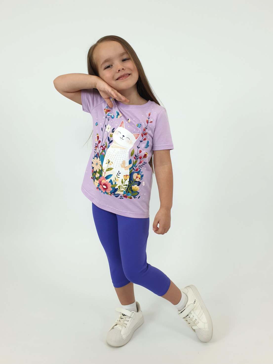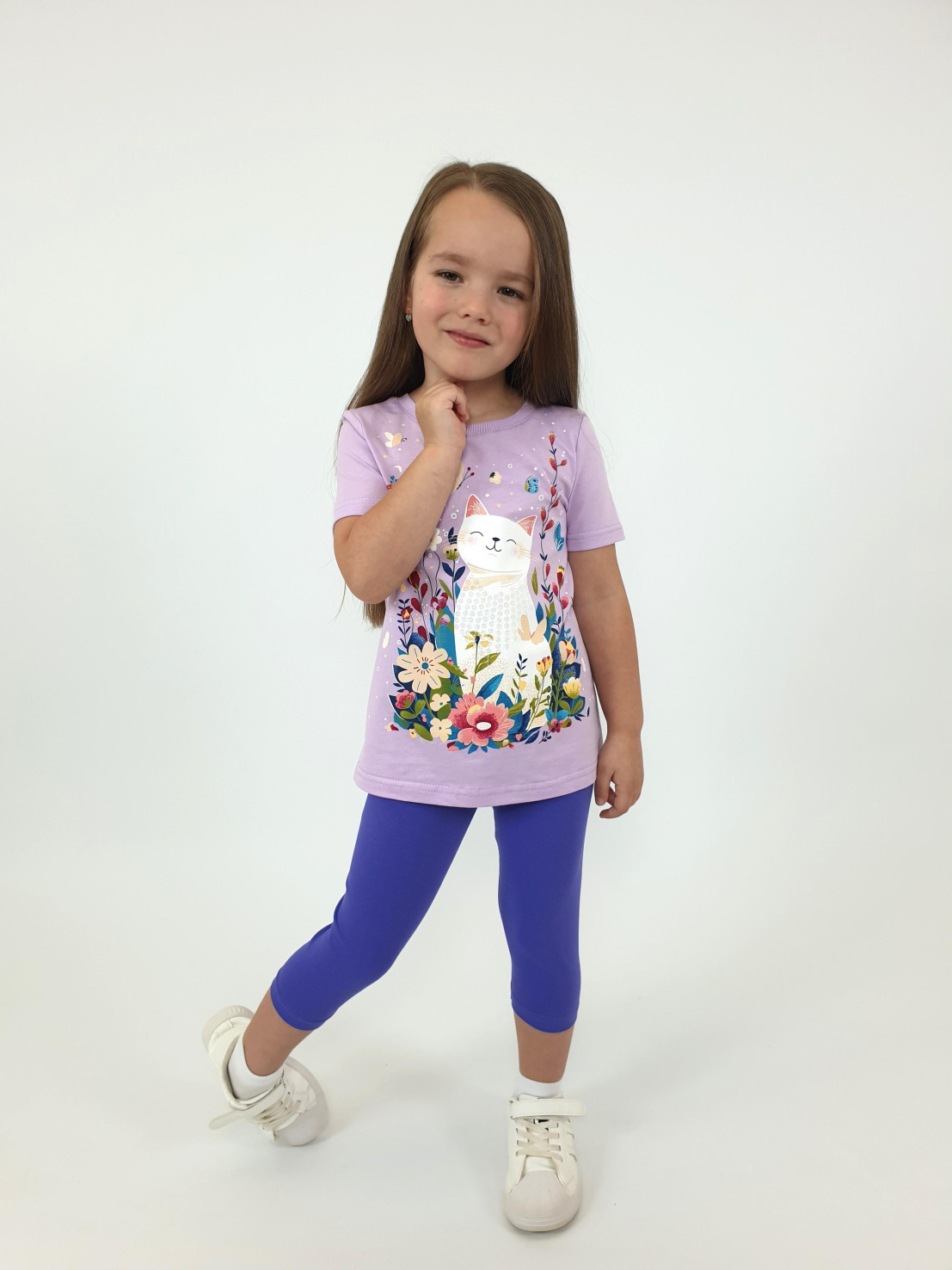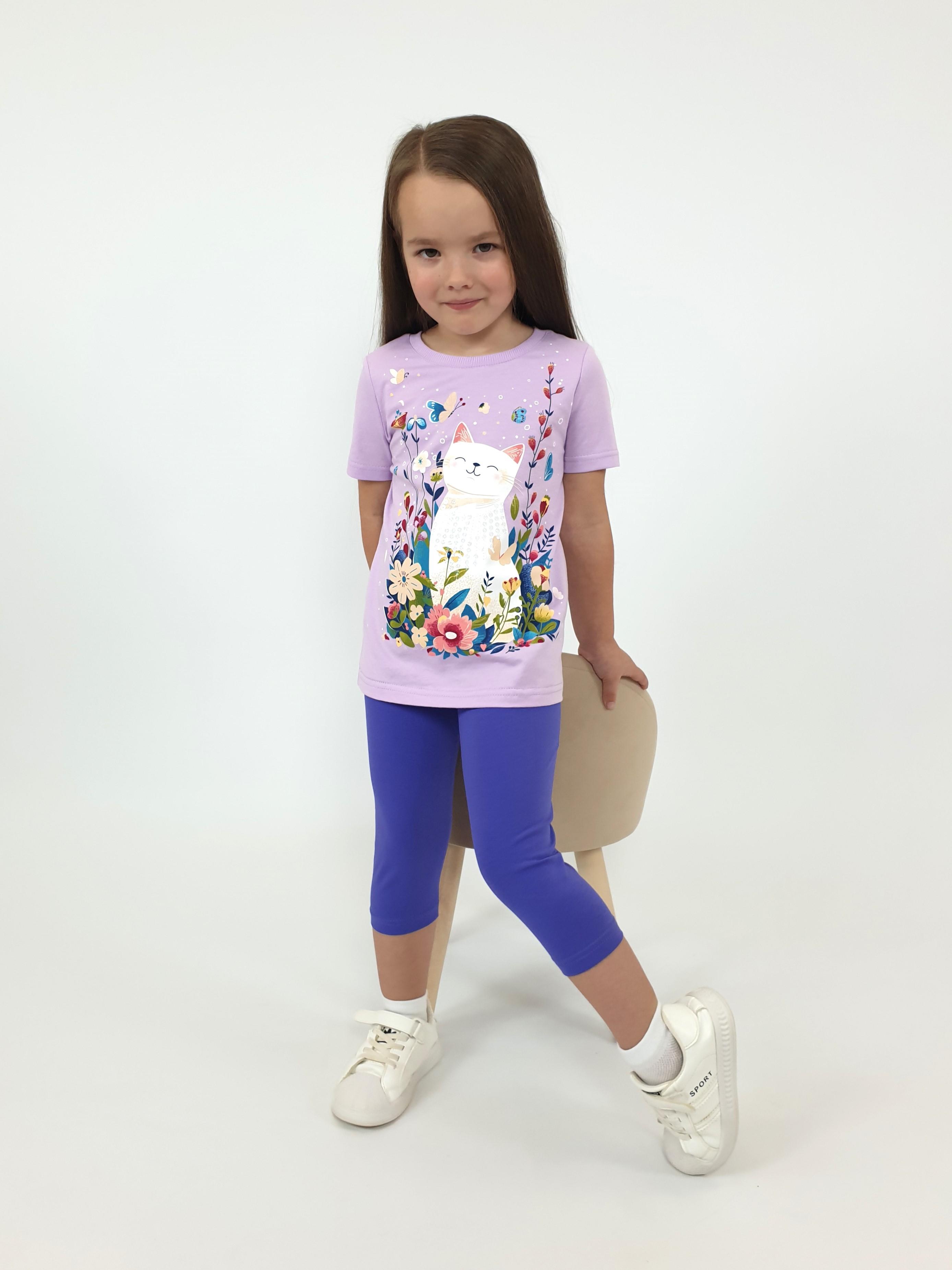 Кулирное полотно:100% х/б.-джемпер,95% х/б,5% лайкра-лосины. Джемпер-прямой силуэт,печать и вышивка(пайетки)на переде.Короткий,втачной рукав.Низ рукава и джемпера подшит.Горловина обработана ластиком. Лосины-укороченные,вверху на резинке.