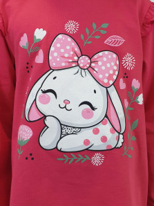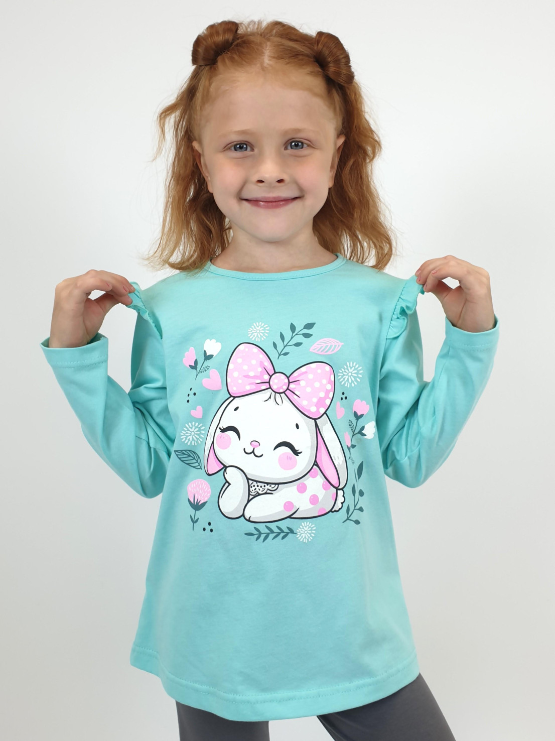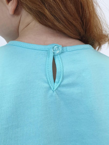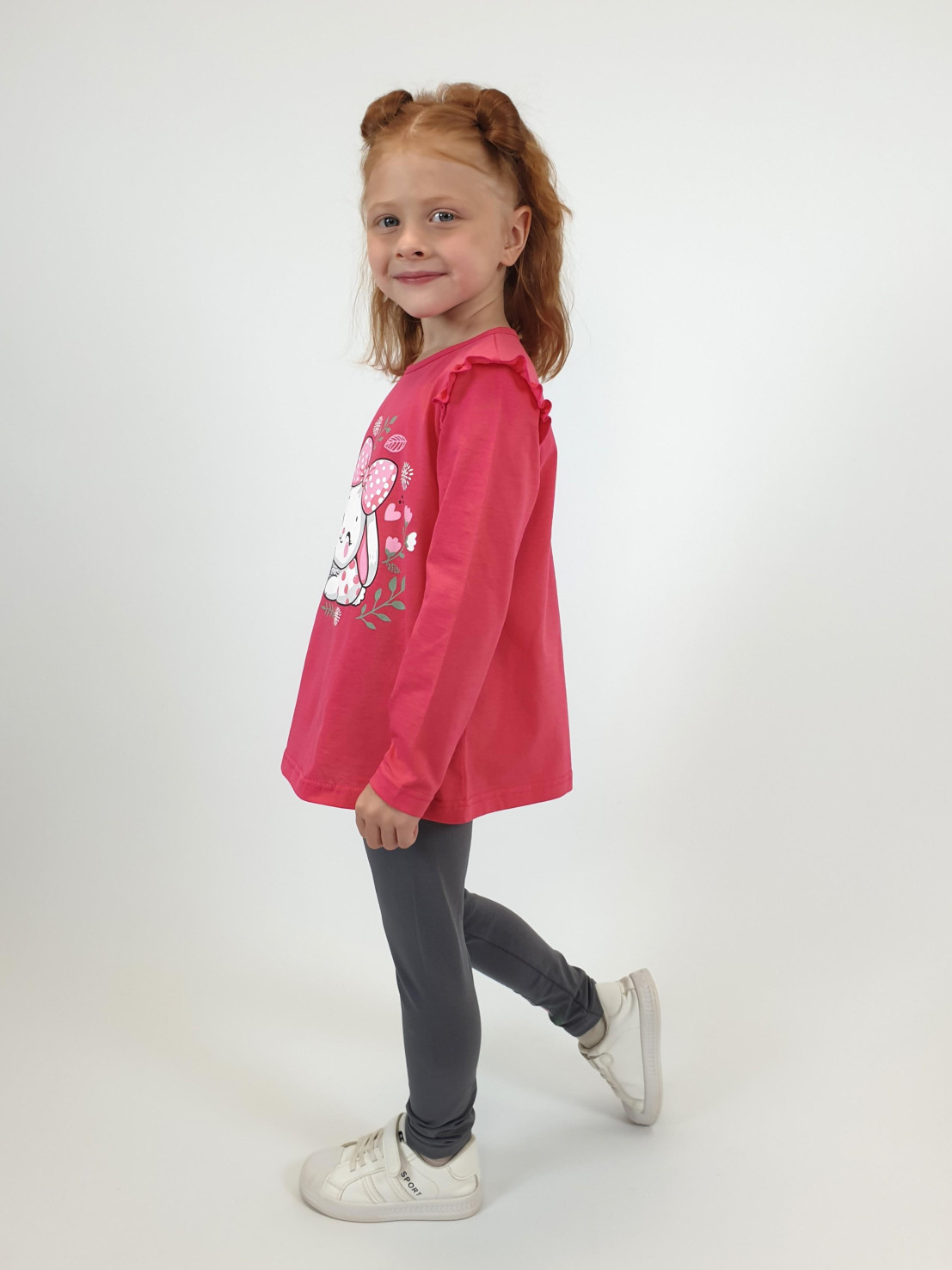 Кулирное полотно:100% х/б.,95% х/б,5% лайкра. Джемпер-силуэт трапеция,длинный втачной рукав,в пройме рюша.Горловина окантована,застежка на пуговицу по спинке.Печать на переде. Лосины-длинные.вверху на резинке.Печать-справа внизу.