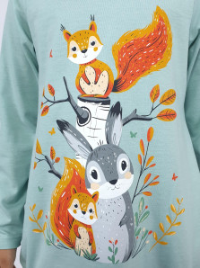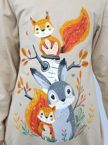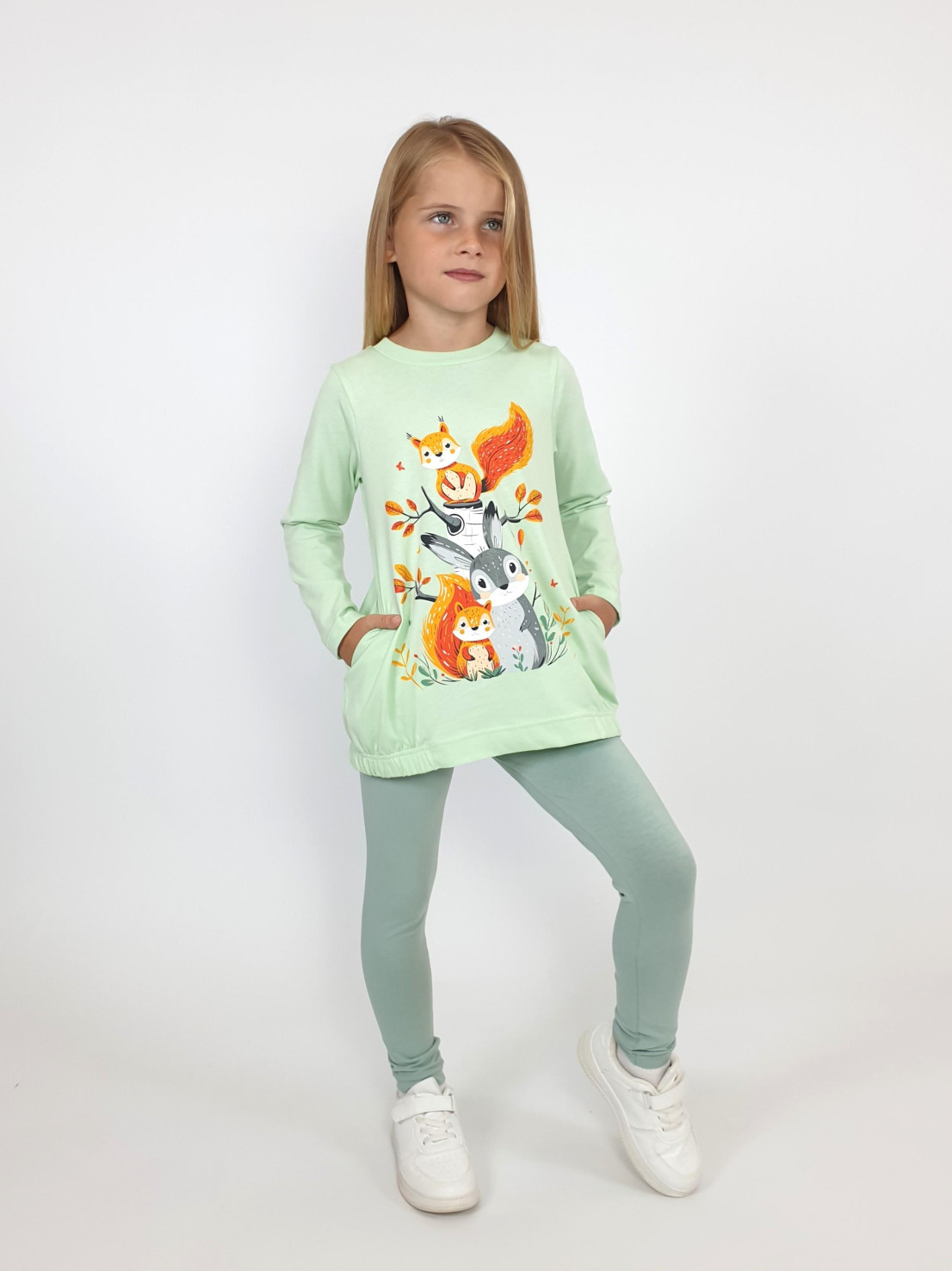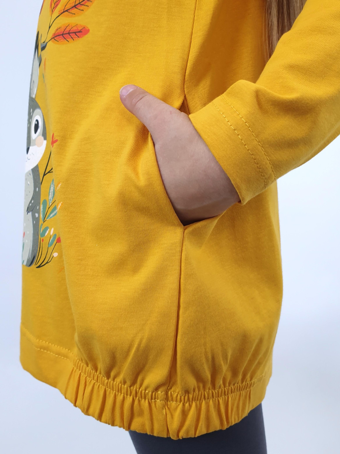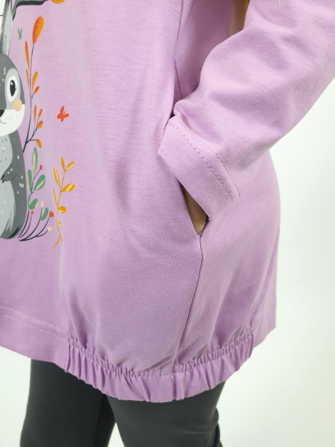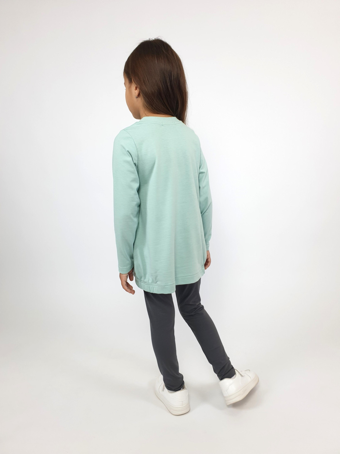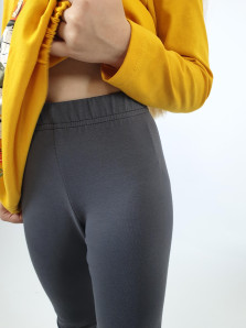Кулирное полотно:100% х/б.,95% х/б,5% лайкра. Джемпер-свободный,с печатью по переду и двумя карманами в боковых швах.Рукав втачной,длинный.Низ изделия подшит с резинкой по боковым швам.Горловина обработана ластиком. Лосины-длинные на резинке,без боковых швов.