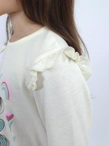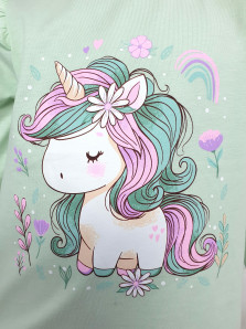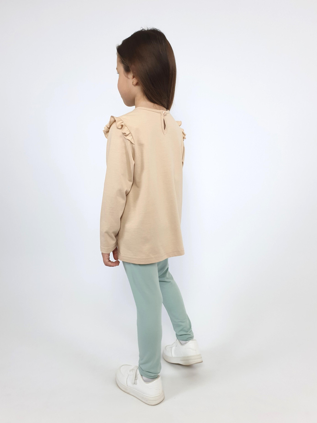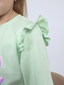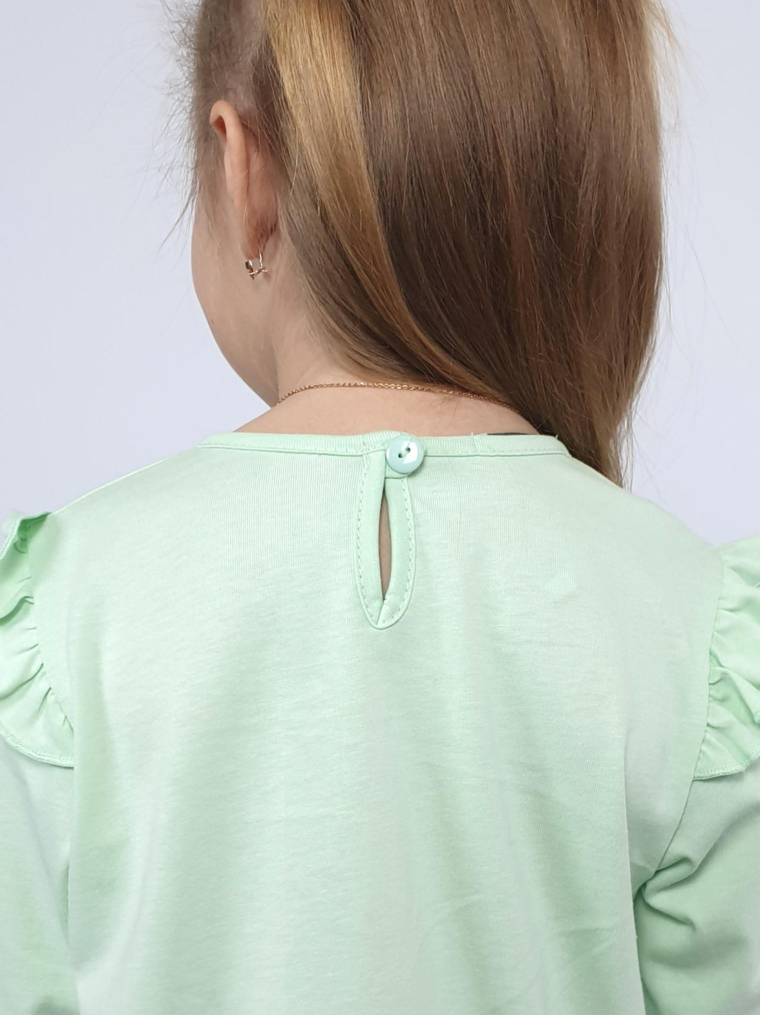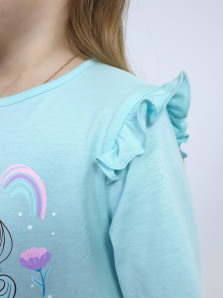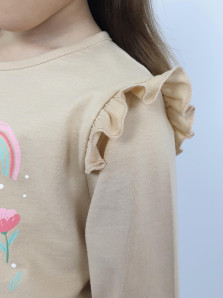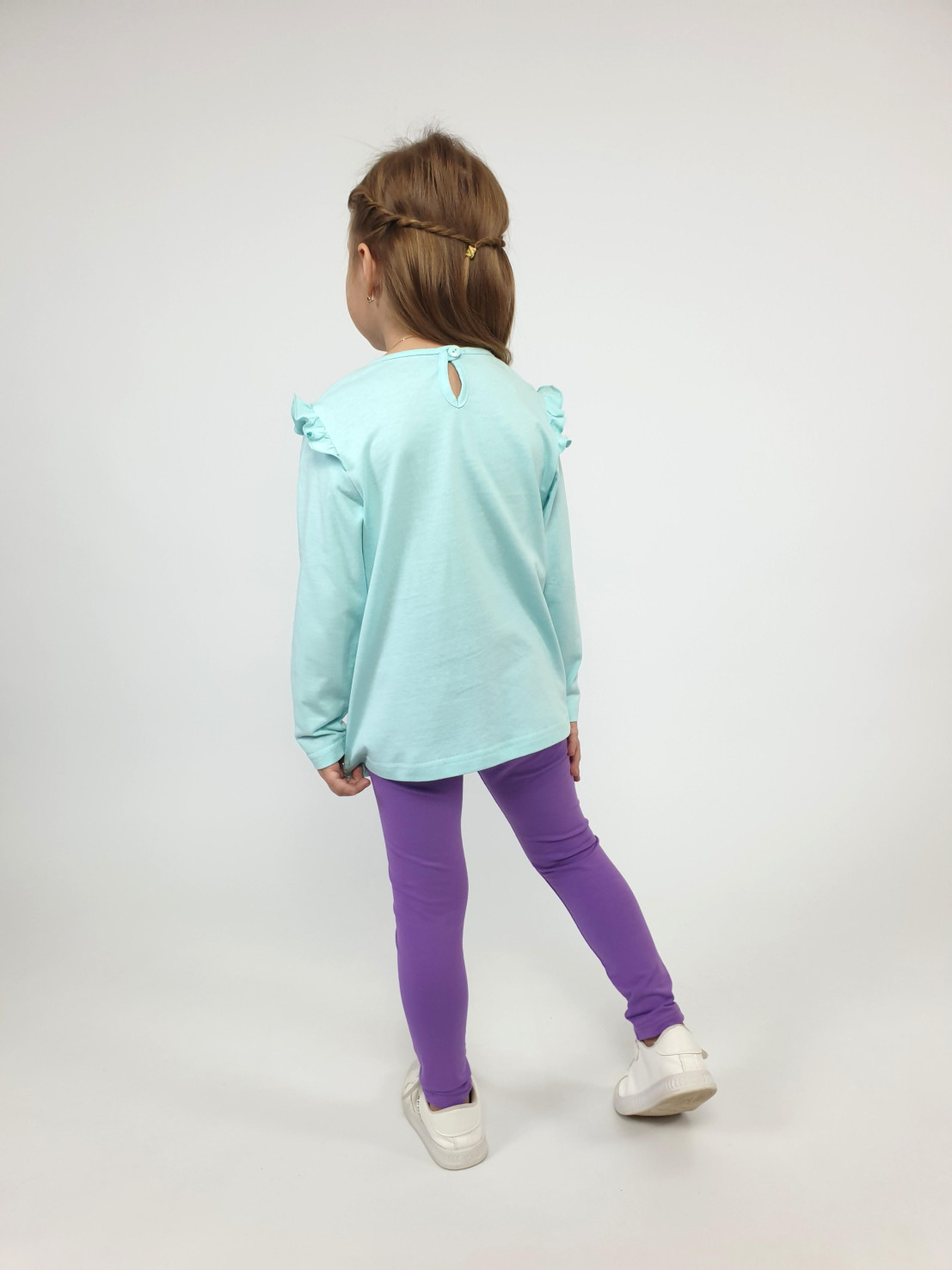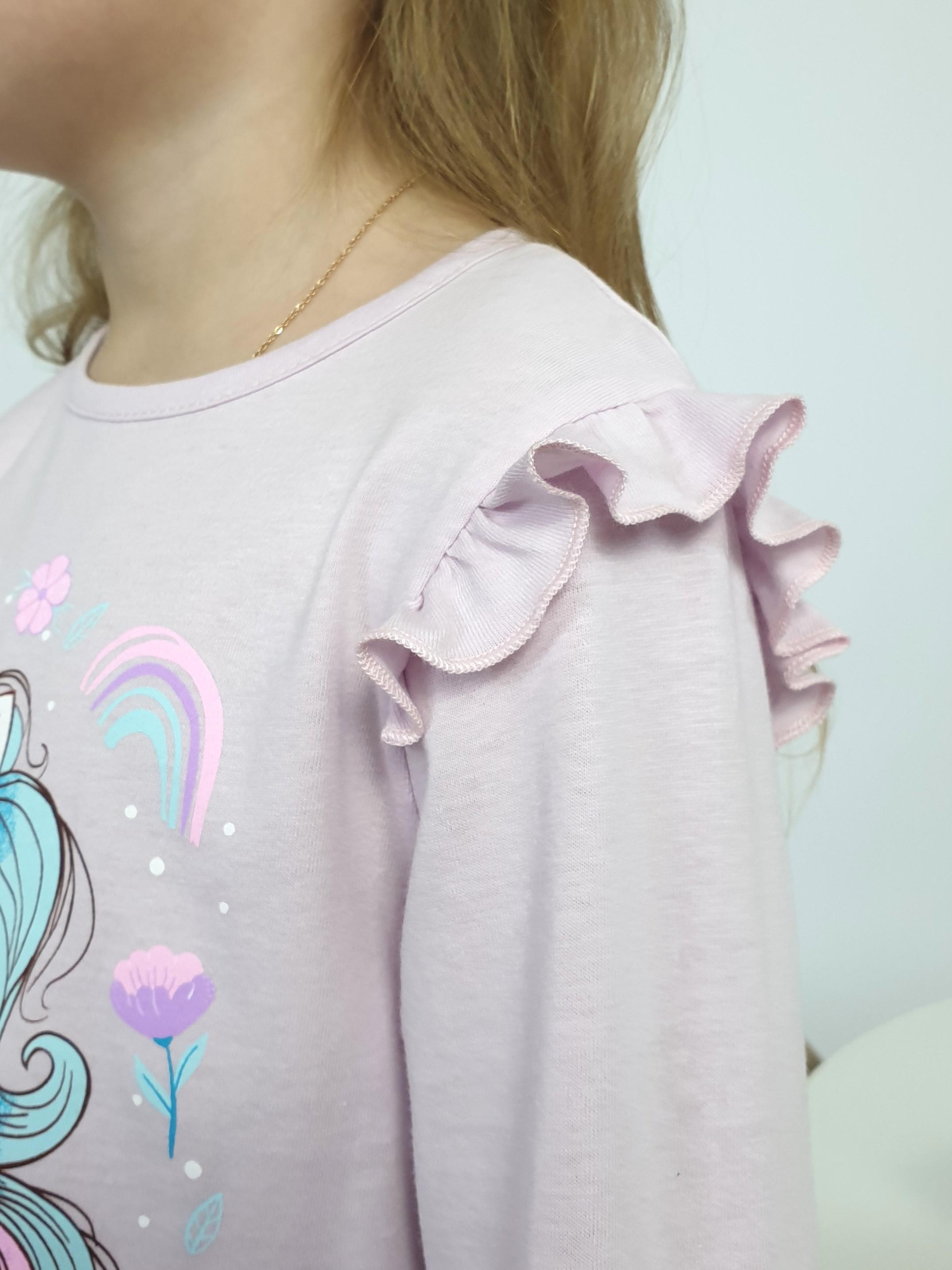 Кулирное полотно: 100% х/б.-джемпер;95% х/б,5% лайкра-лосины. Джемпер-силуэт трапеция,короткий втачной рукав,в пройме рюша.Горловина окантована,застежка на пуговицу по спинке.Печать на переде. Лосины-длинные вверху на резинке.