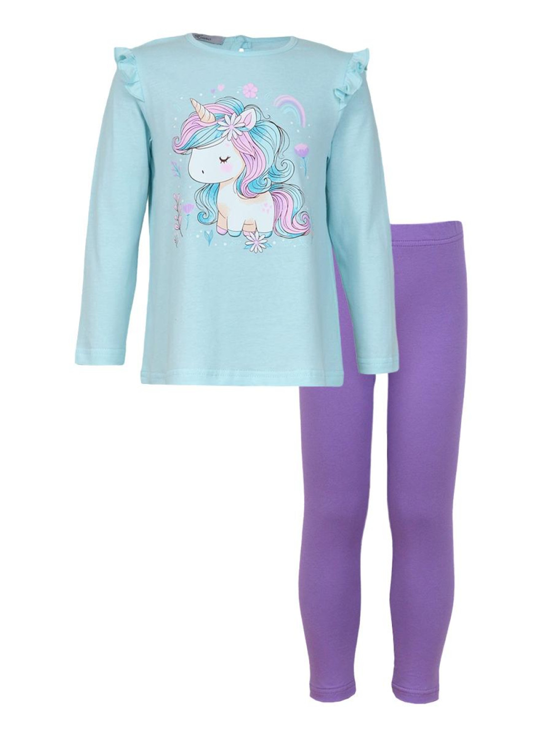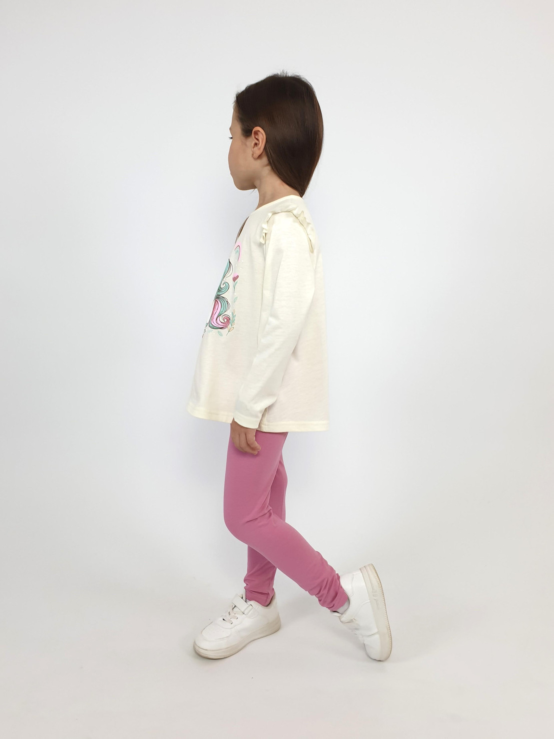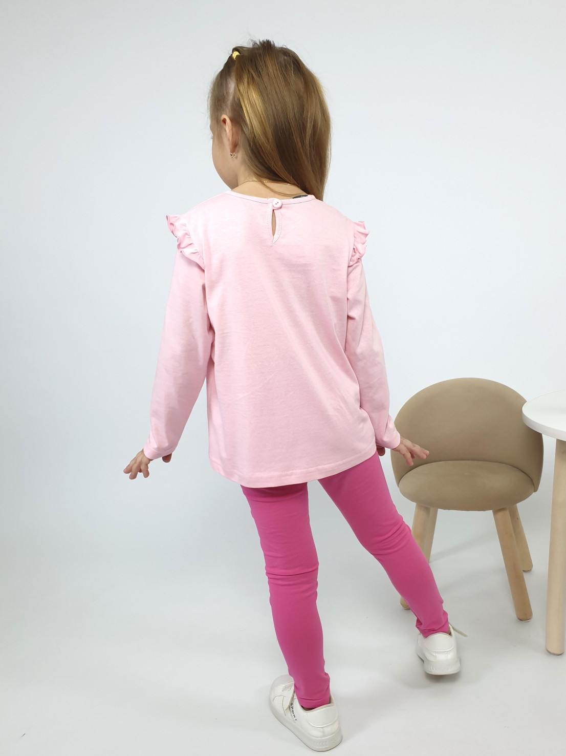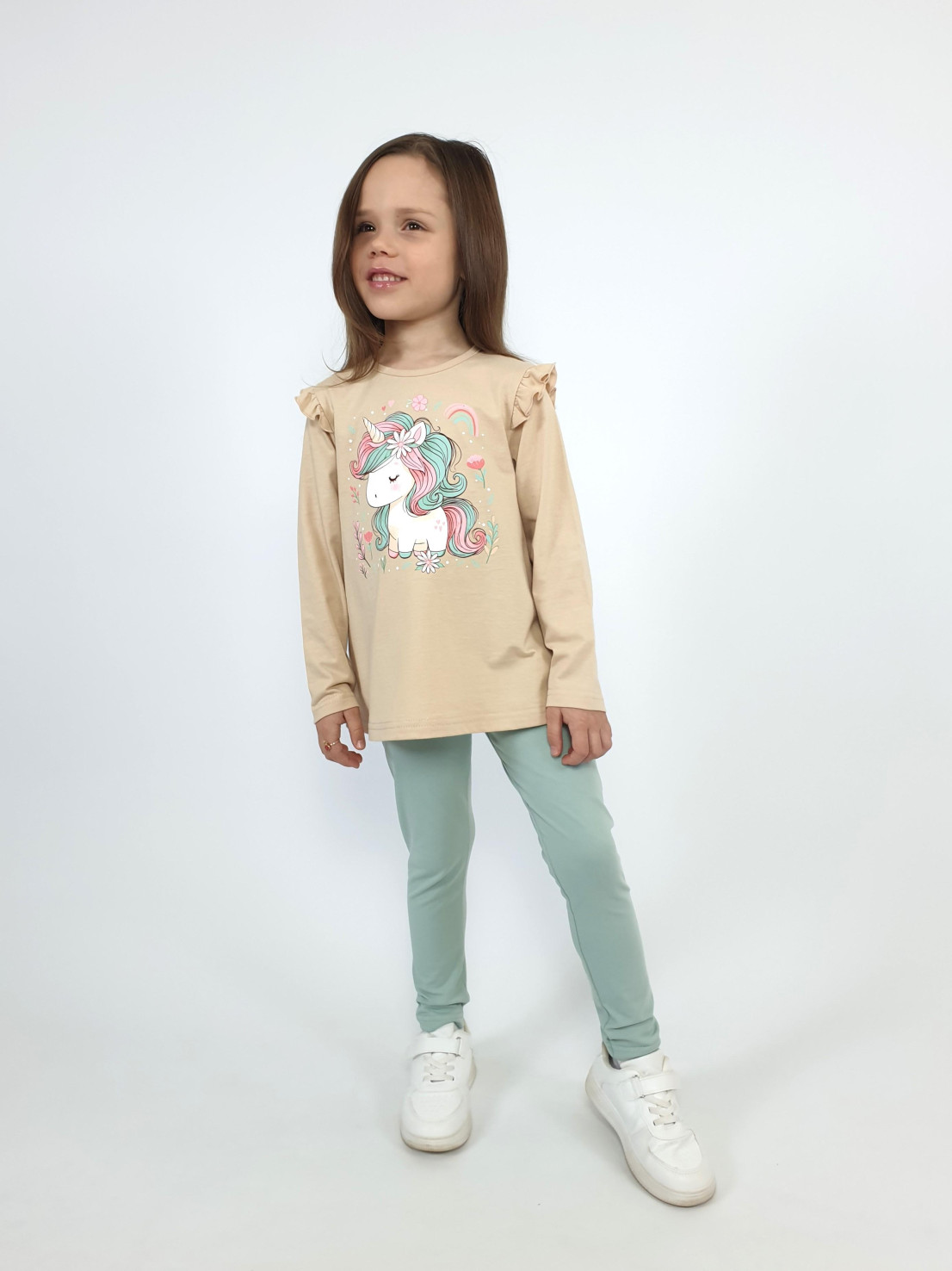 Кулирное полотно: 100% х/б.-джемпер;95% х/б,5% лайкра-лосины. Джемпер-силуэт трапеция,короткий втачной рукав,в пройме рюша.Горловина окантована,застежка на пуговицу по спинке.Печать на переде. Лосины-длинные вверху на резинке.