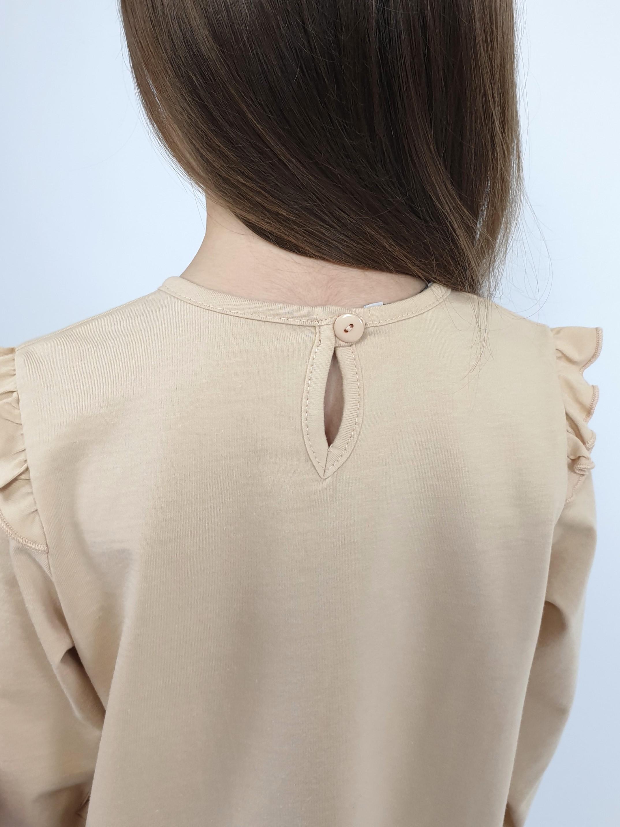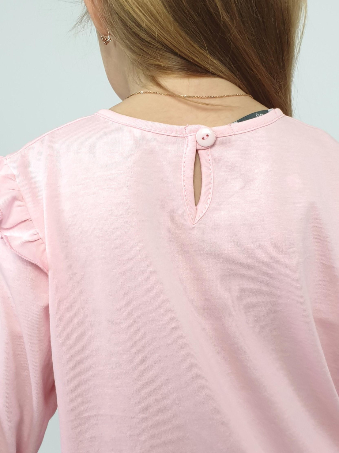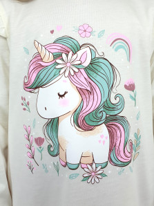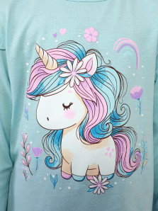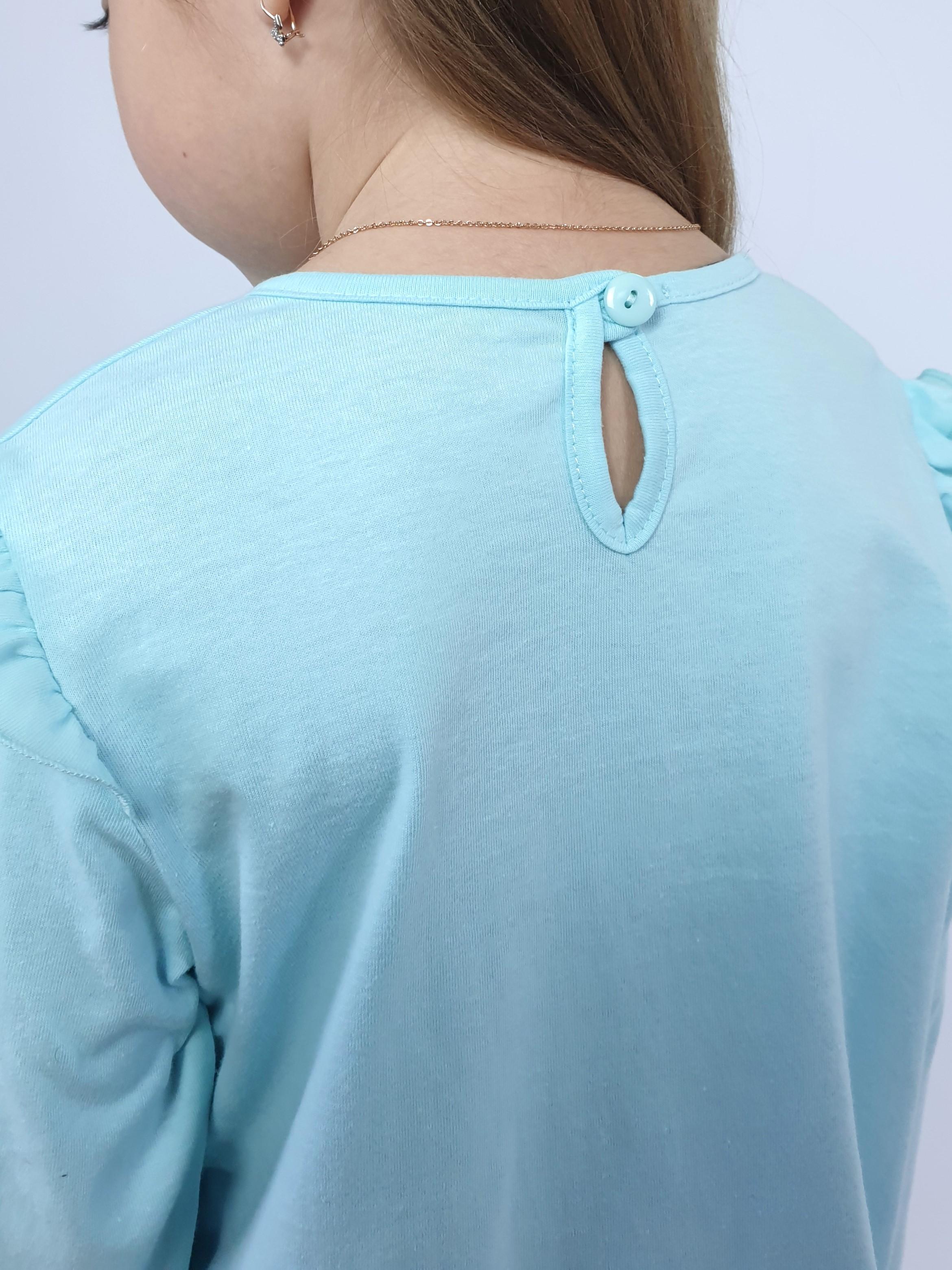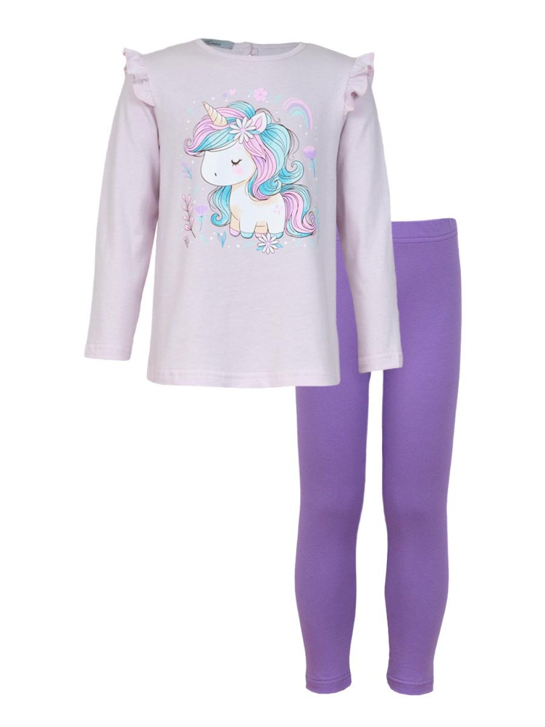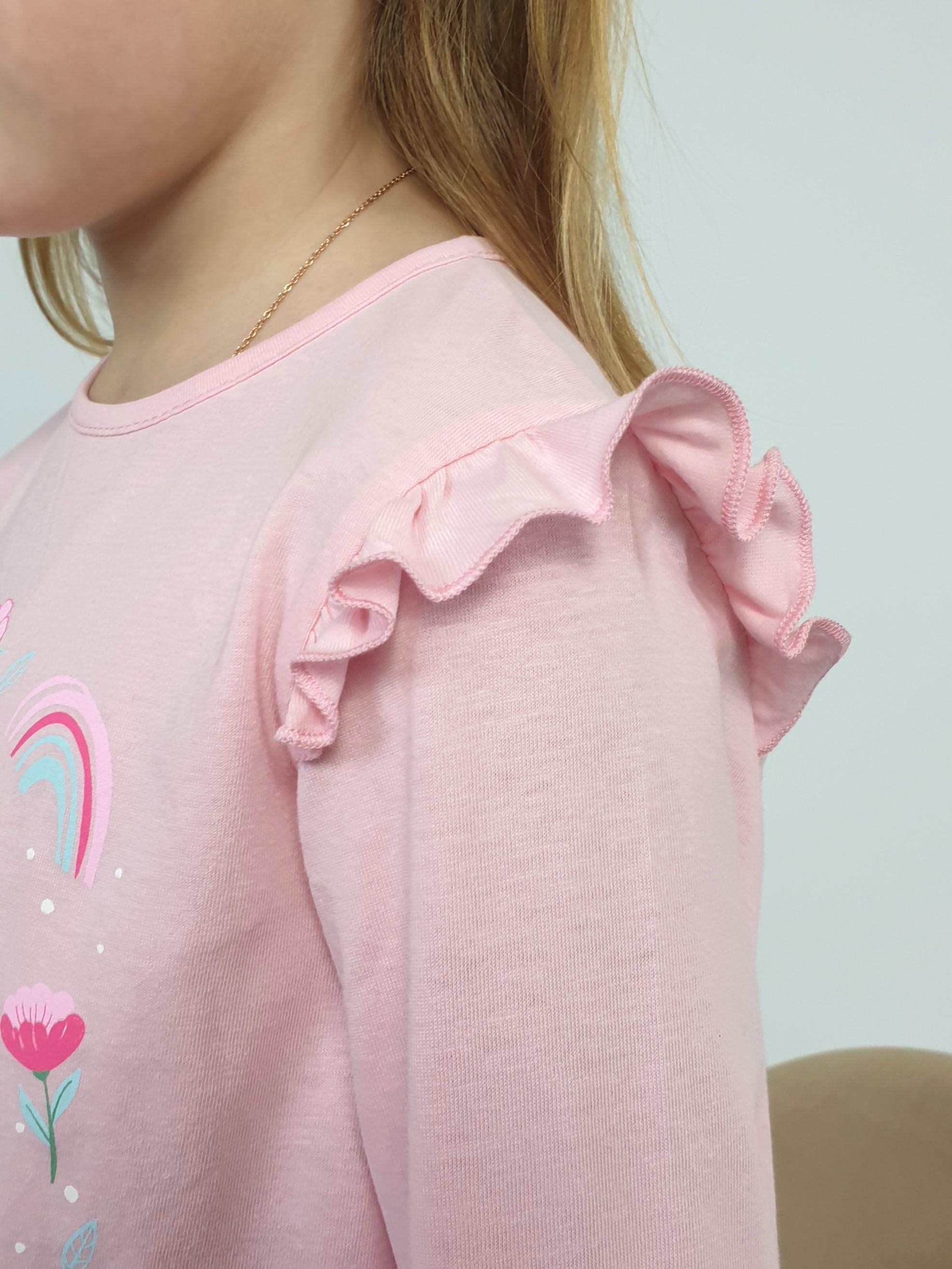 Кулирное полотно: 100% х/б.-джемпер;95% х/б,5% лайкра-лосины. Джемпер-силуэт трапеция,короткий втачной рукав,в пройме рюша.Горловина окантована,застежка на пуговицу по спинке.Печать на переде. Лосины-длинные вверху на резинке.