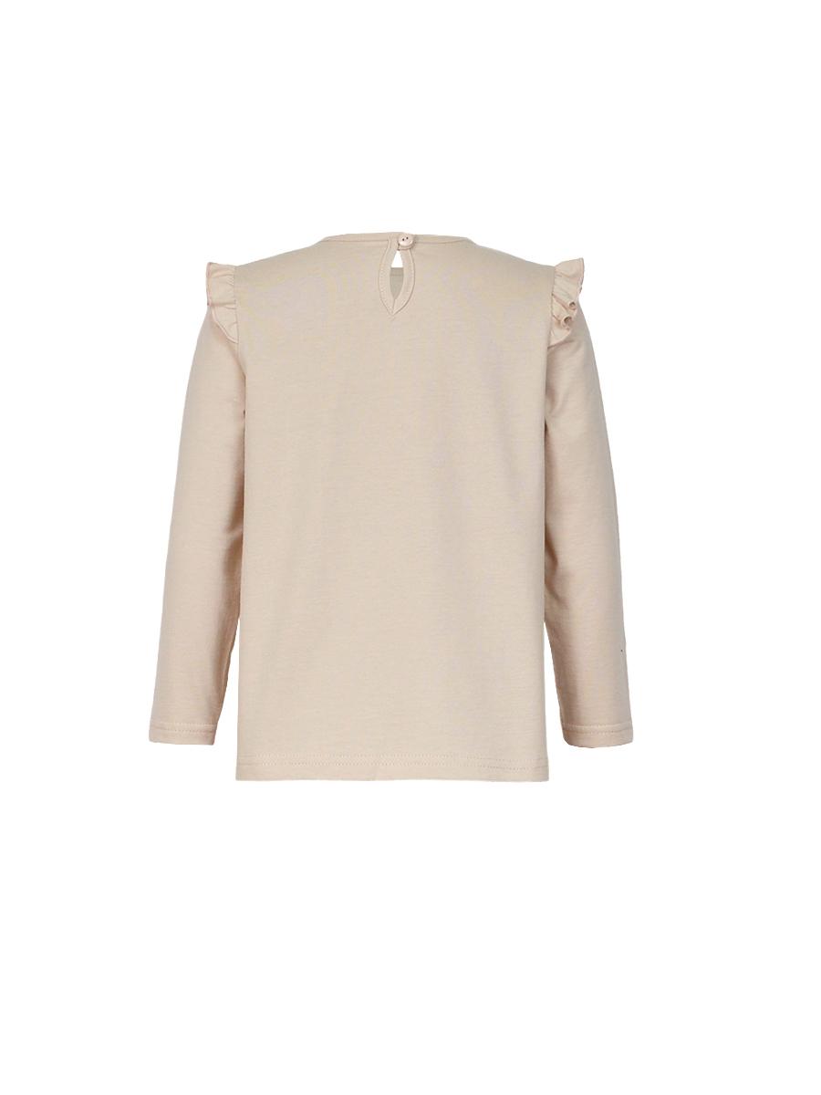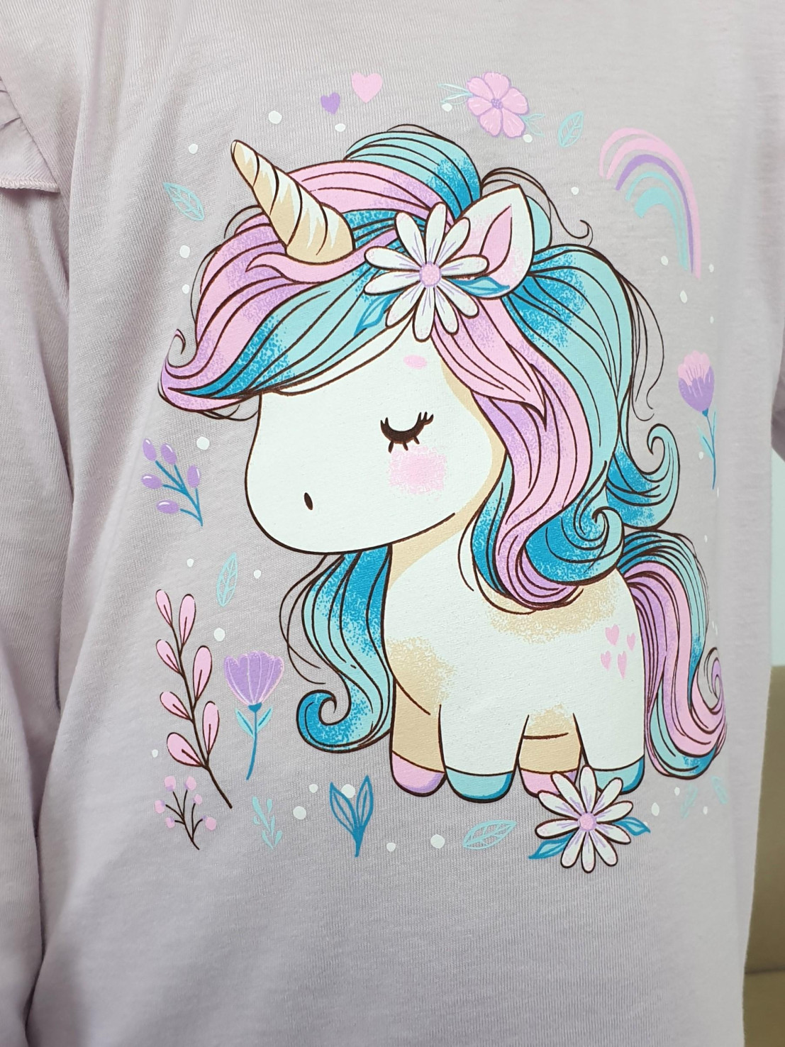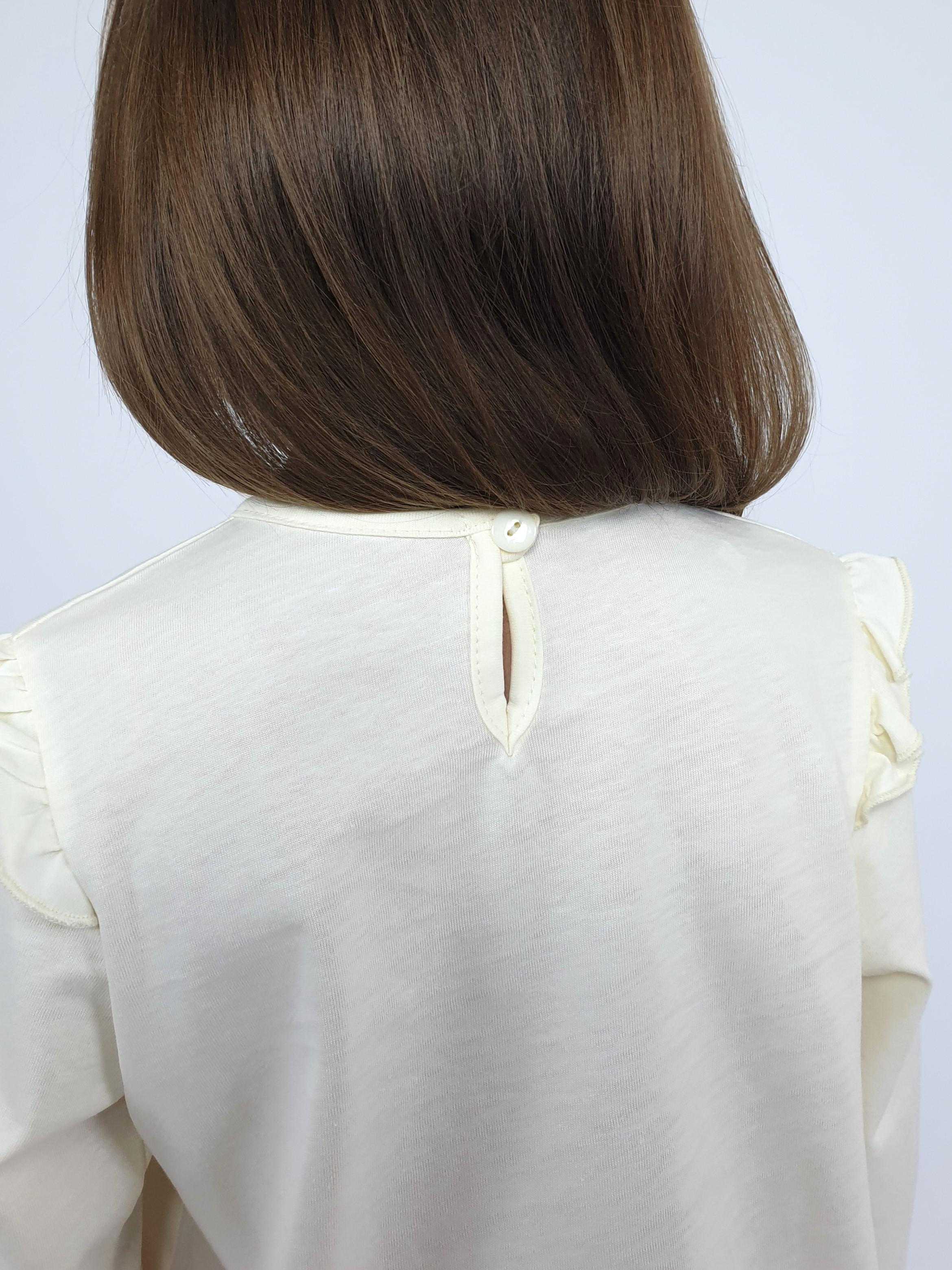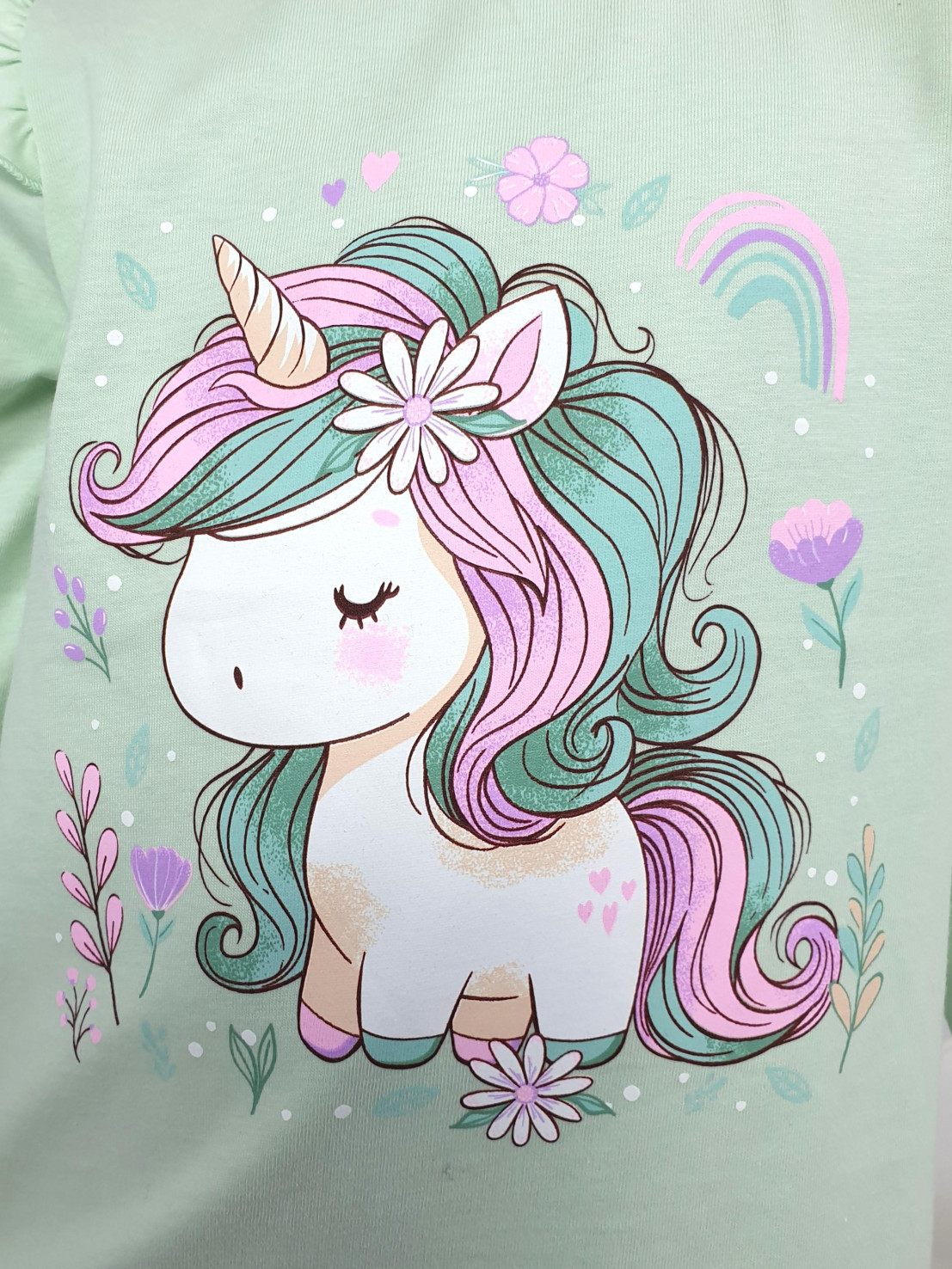 Кулирное полотно: 100% х/б.-джемпер;95% х/б,5% лайкра-лосины. Джемпер-силуэт трапеция,короткий втачной рукав,в пройме рюша.Горловина окантована,застежка на пуговицу по спинке.Печать на переде. Лосины-длинные вверху на резинке.