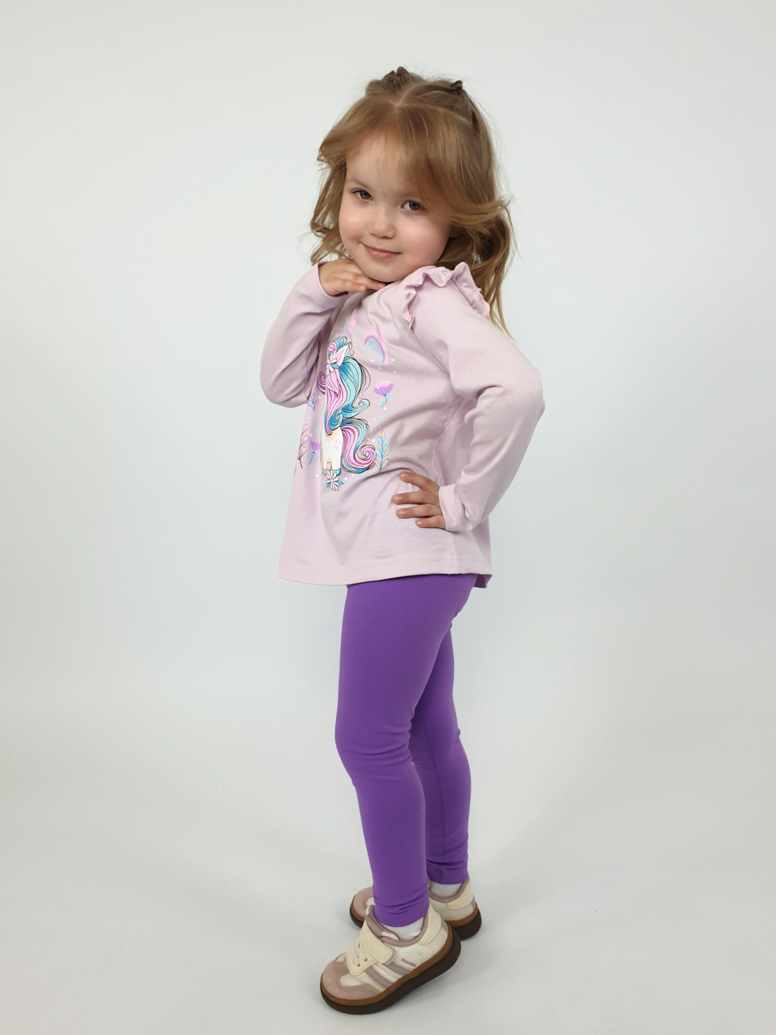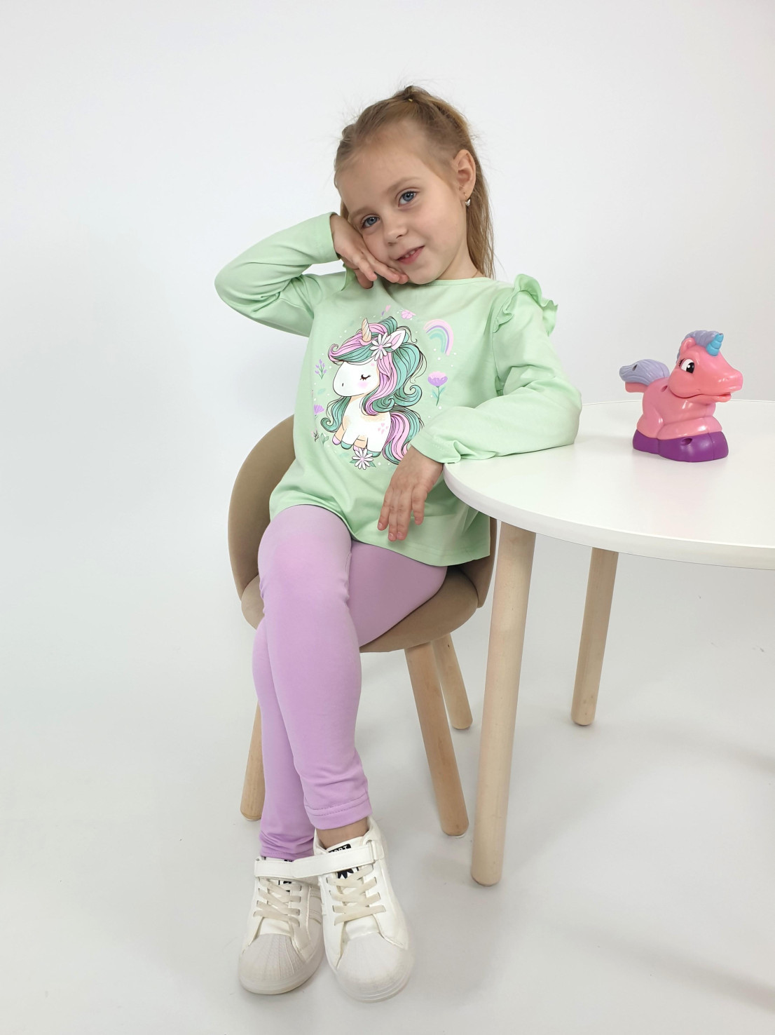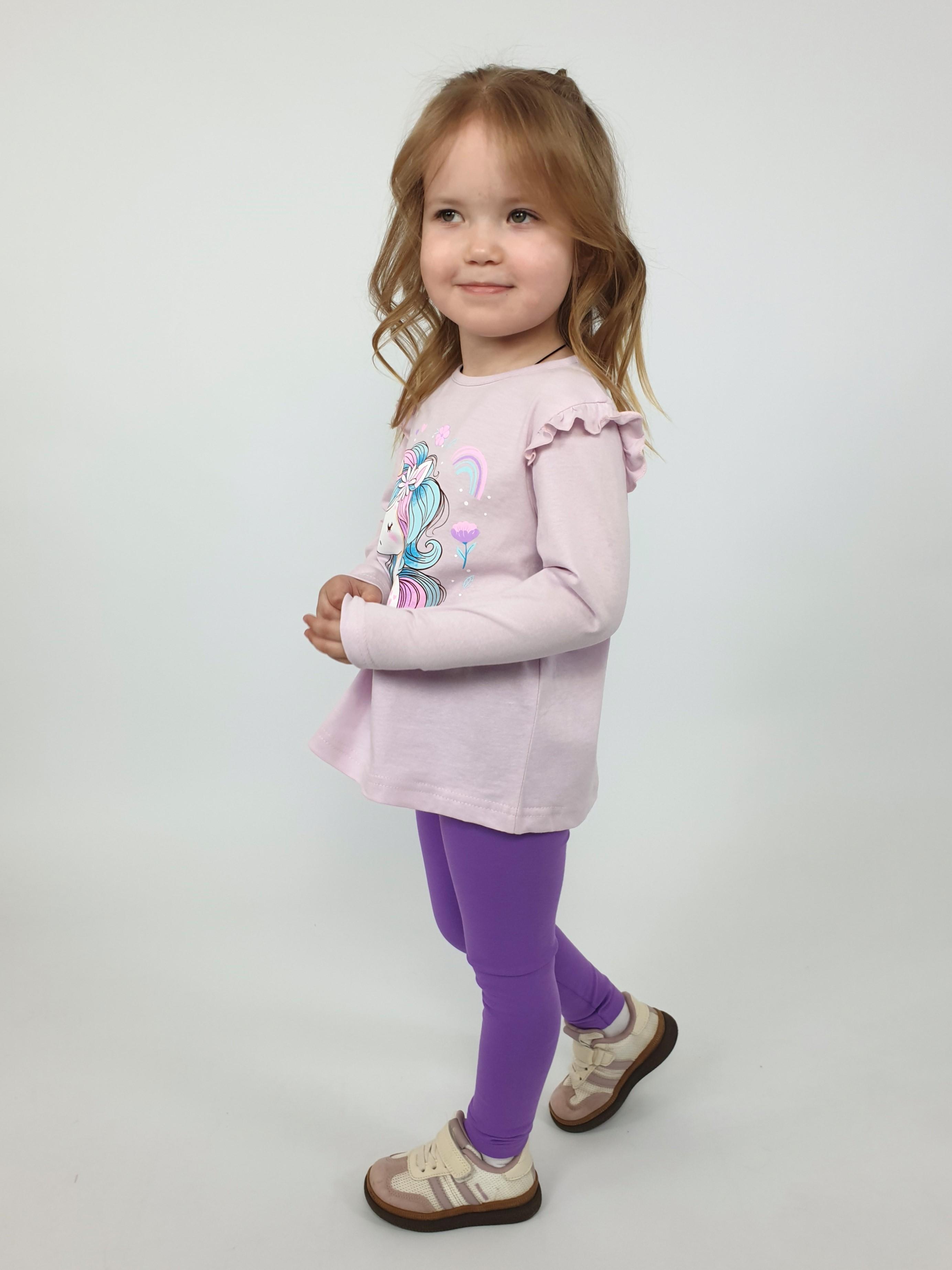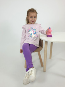 Кулирное полотно: 100% х/б.-джемпер;95% х/б,5% лайкра-лосины. Джемпер-силуэт трапеция,короткий втачной рукав,в пройме рюша.Горловина окантована,застежка на пуговицу по спинке.Печать на переде. Лосины-длинные вверху на резинке.