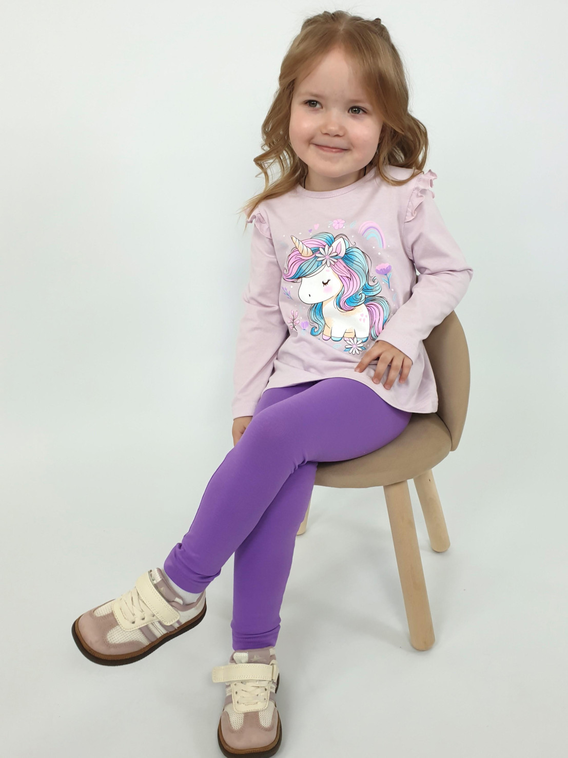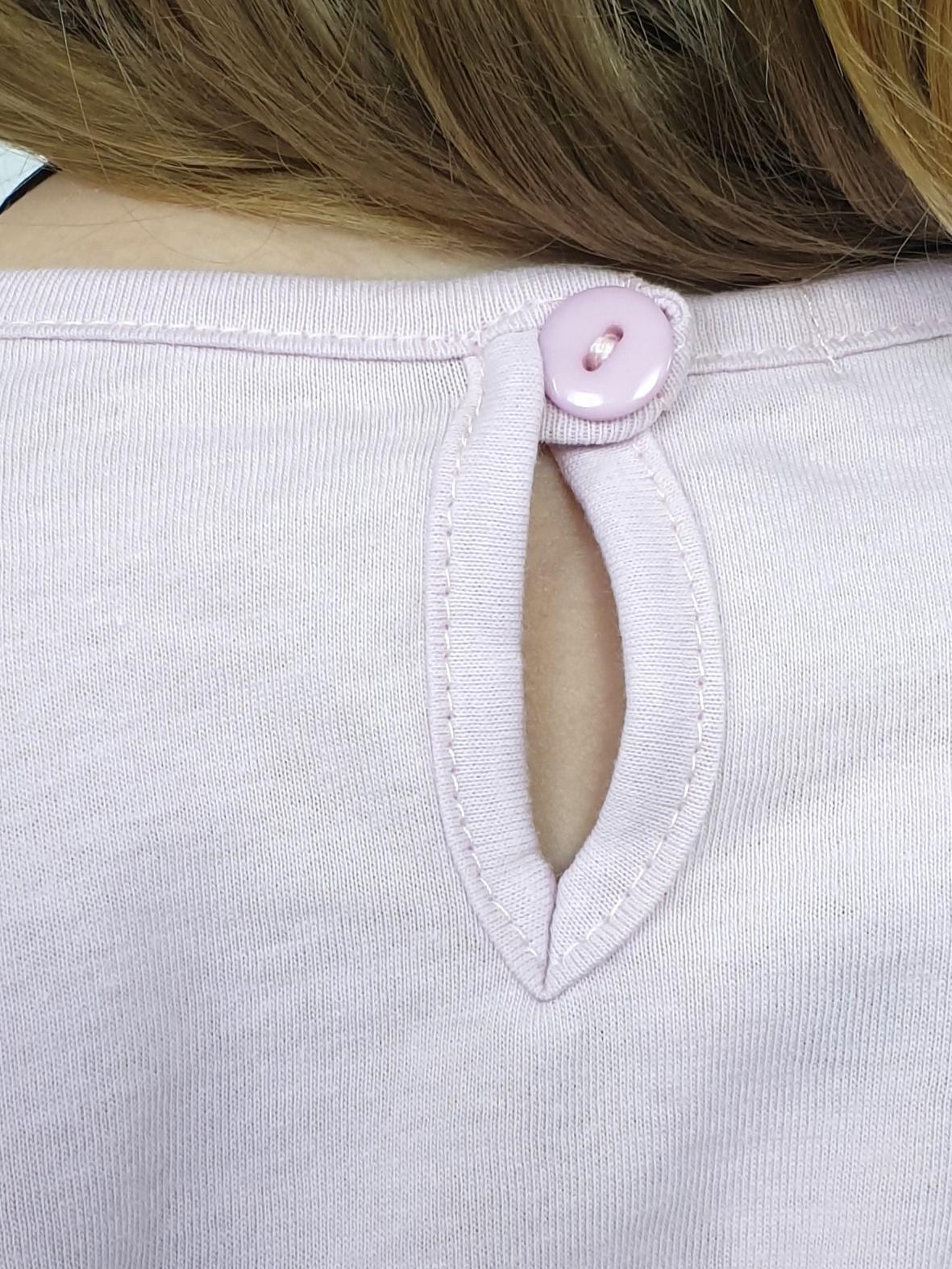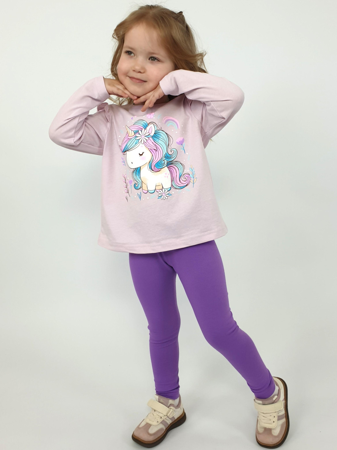 Кулирное полотно: 100% х/б.-джемпер;95% х/б,5% лайкра-лосины. Джемпер-силуэт трапеция,короткий втачной рукав,в пройме рюша.Горловина окантована,застежка на пуговицу по спинке.Печать на переде. Лосины-длинные вверху на резинке.