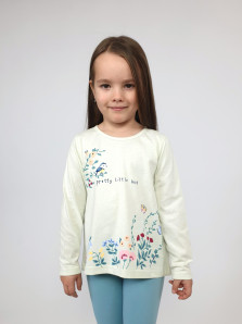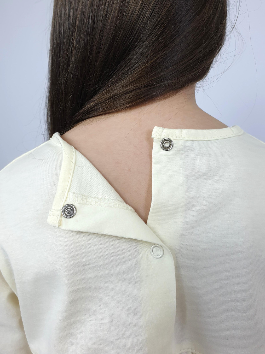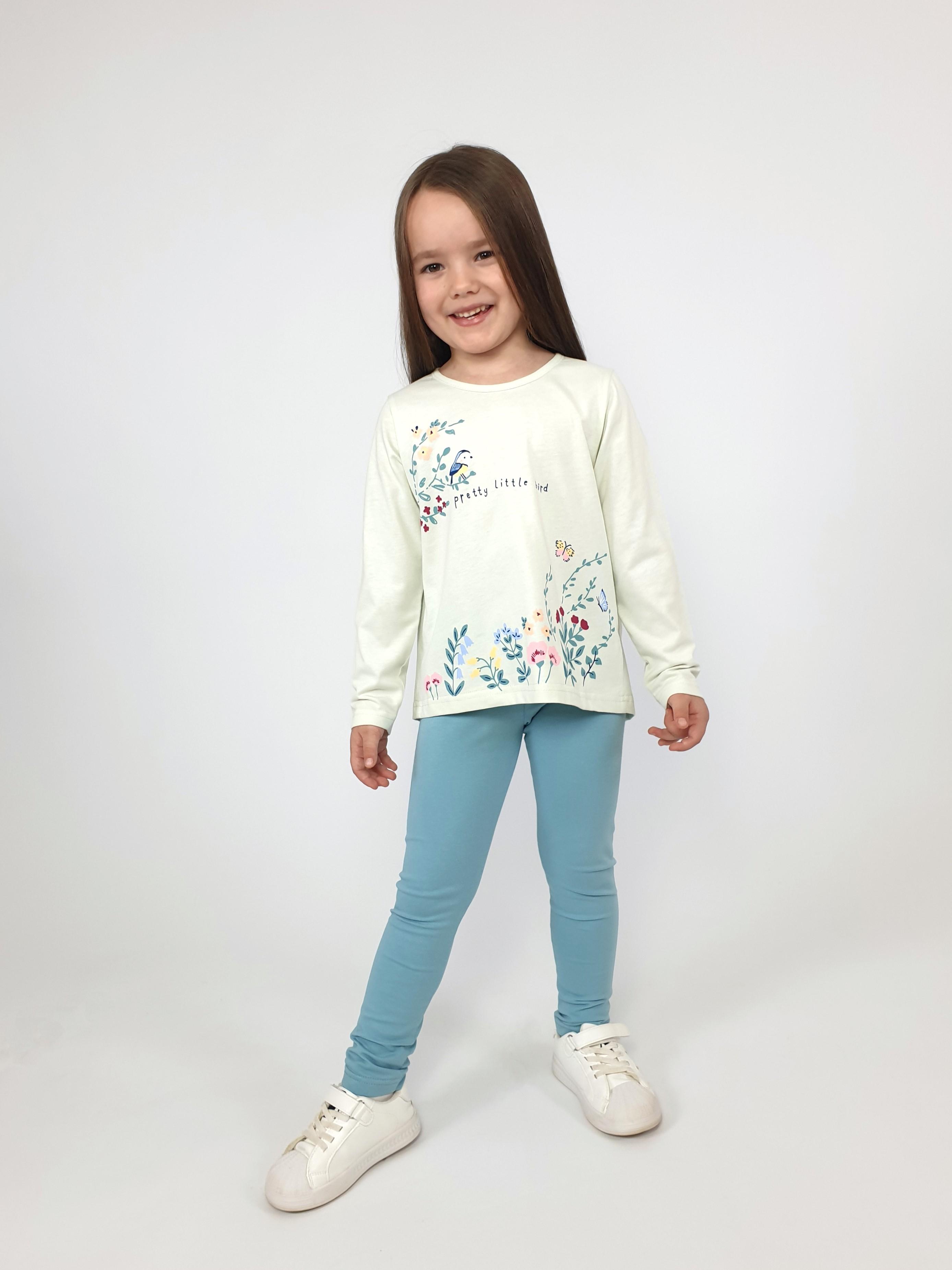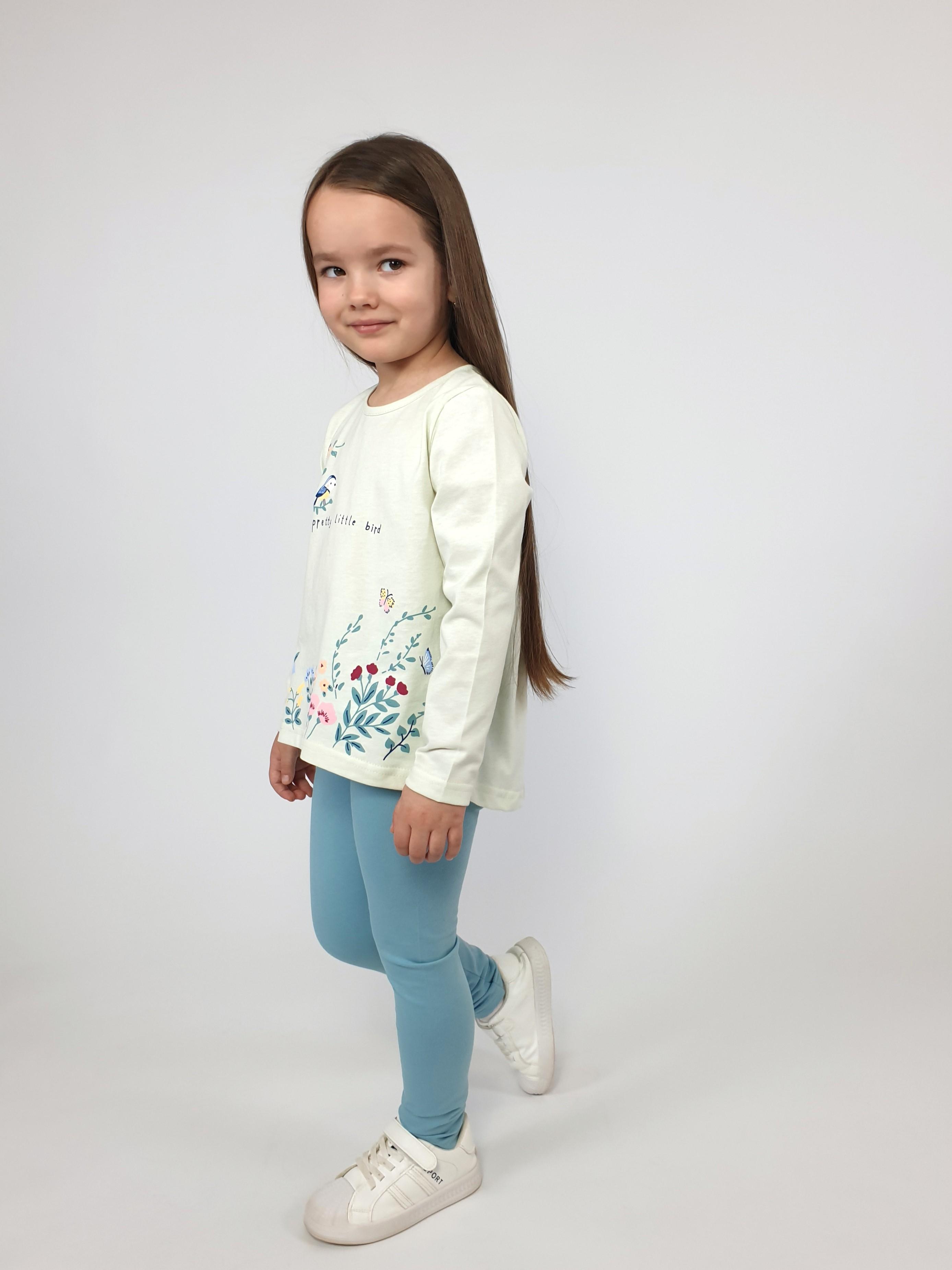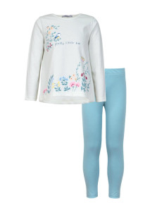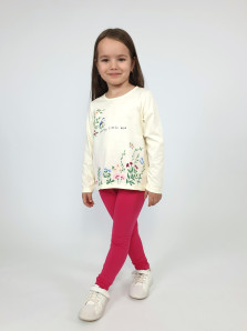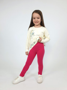 Кулирное полотно: 100% х/б.-джемпер;95% х/б,5% лайкра-лосины. Джемпер-силуэт трапеция,удлиненная спинка со сборкой из под кокетки.Рукав втачной,длинный.Перед с печатью.Горловина окантована,застежка по спинке на кнопки. Лосины-длинные,вверху на резинке.