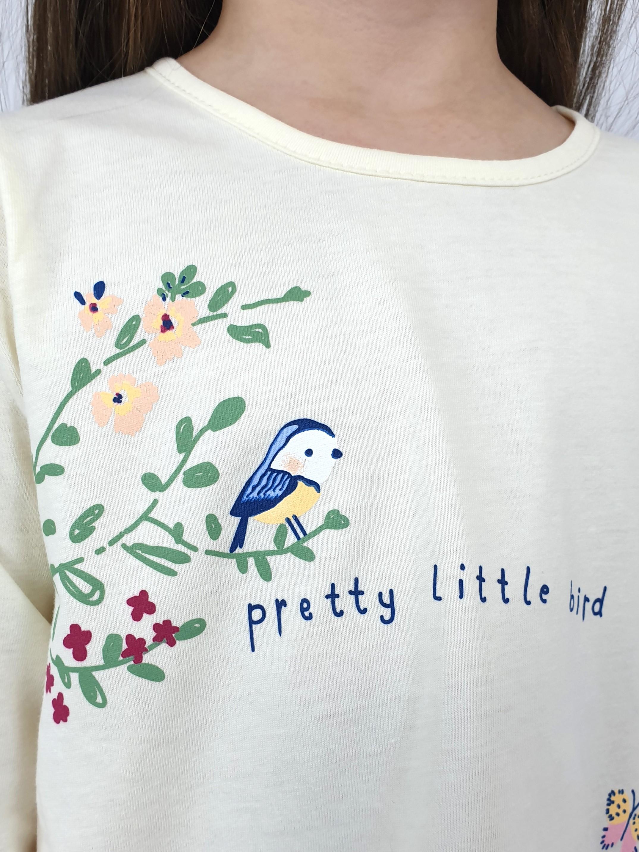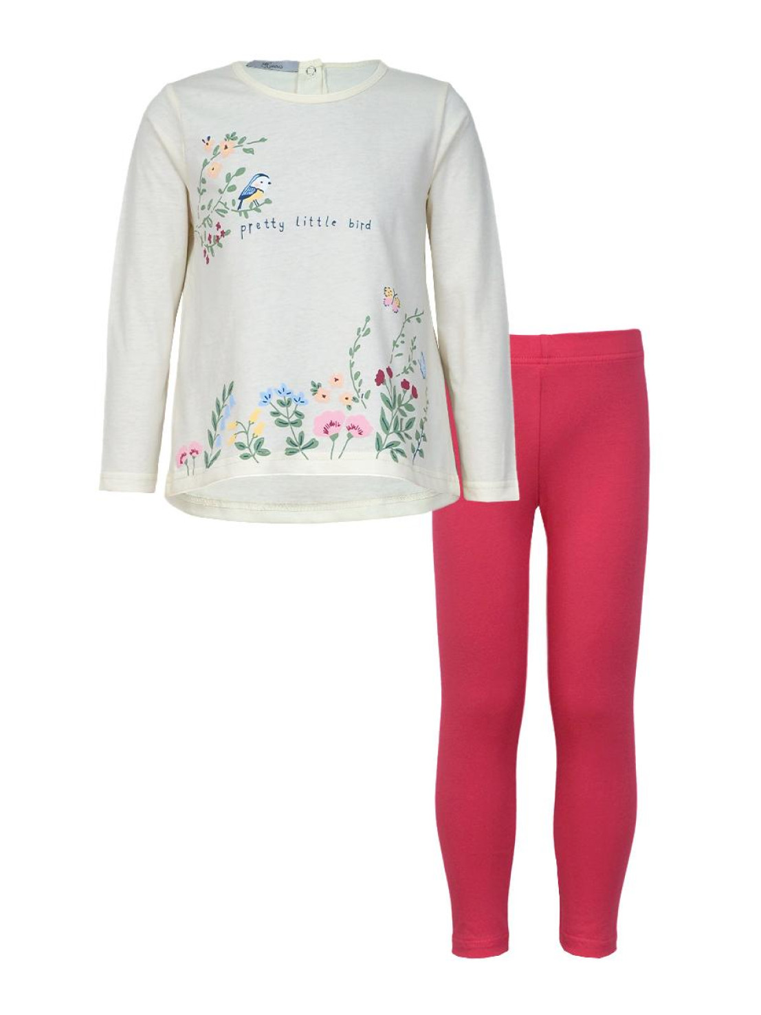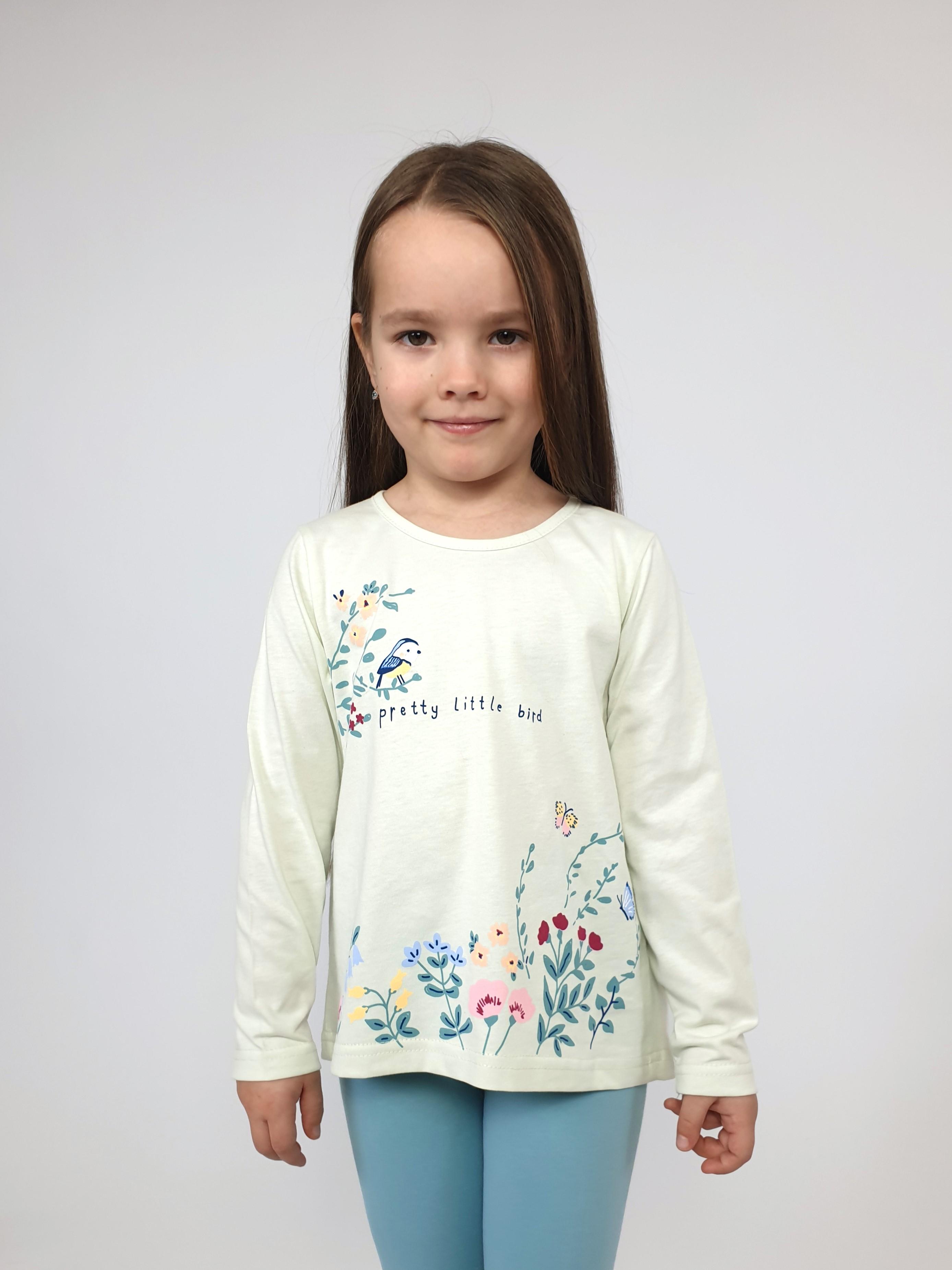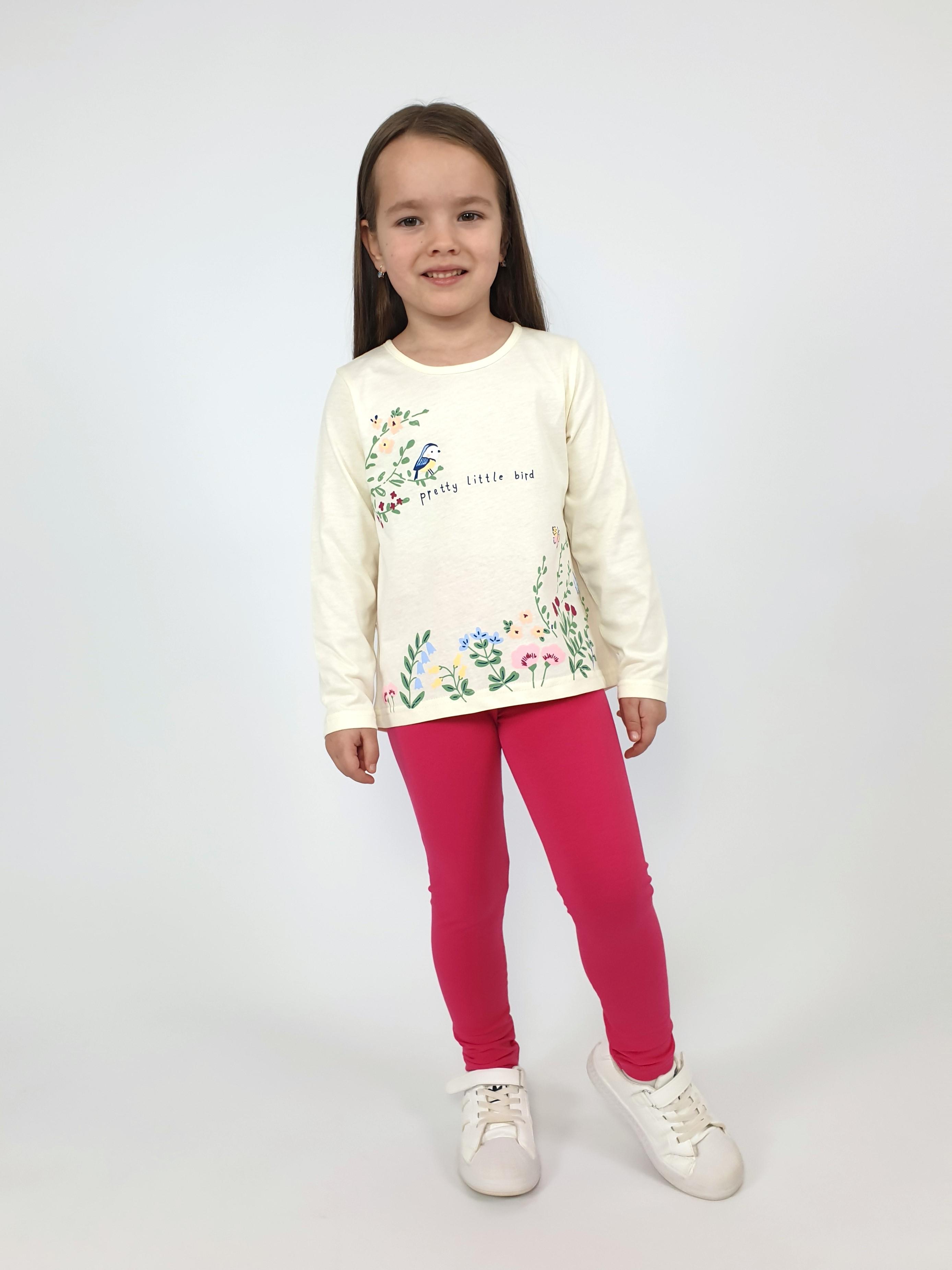 Кулирное полотно: 100% х/б.-джемпер;95% х/б,5% лайкра-лосины. Джемпер-силуэт трапеция,удлиненная спинка со сборкой из под кокетки.Рукав втачной,длинный.Перед с печатью.Горловина окантована,застежка по спинке на кнопки. Лосины-длинные,вверху на резинке.