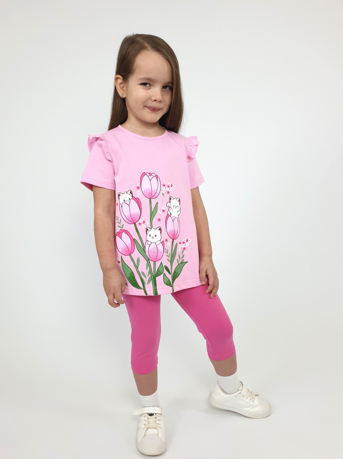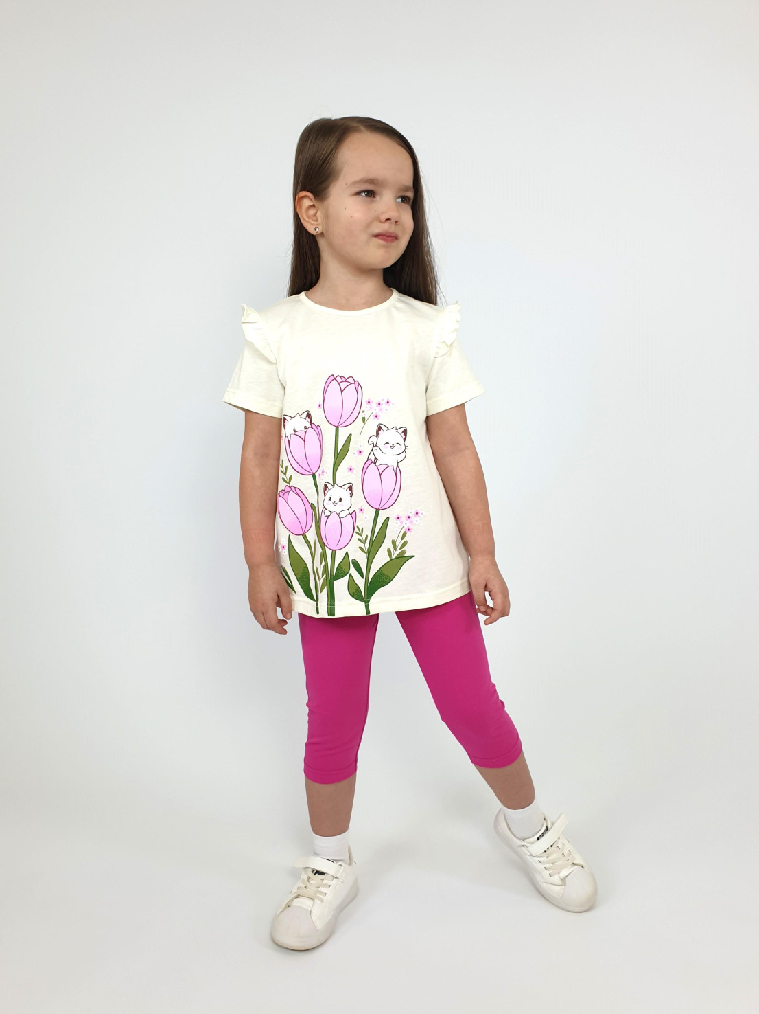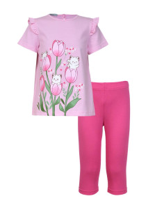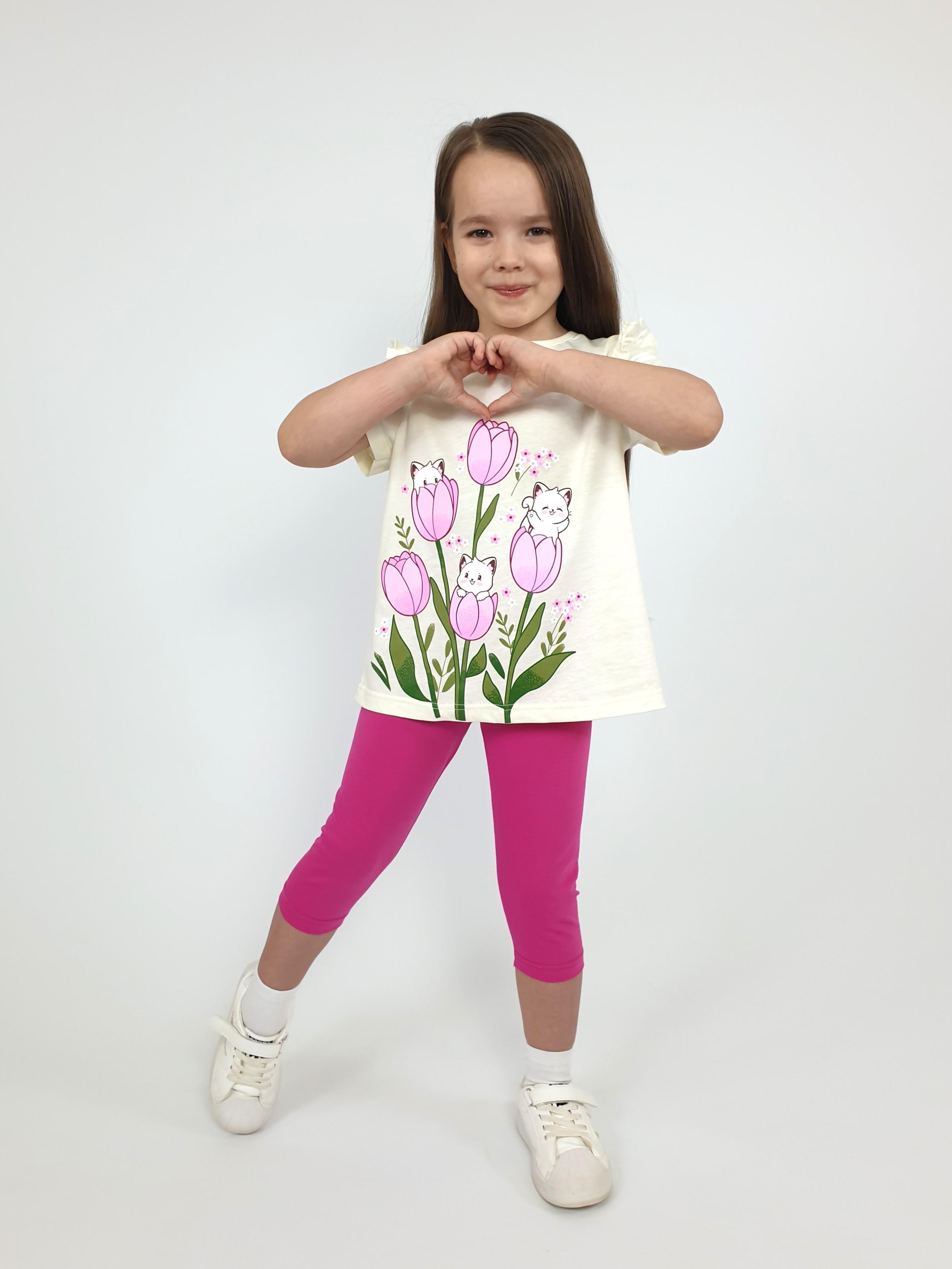 Кулирное полотно:100% х/б;95% х/б,5% лайкра. Джемпер-силуэт трапеция,короткий втачной рукав,в пройме рюша.Горловина окантована,застежка на пуговицу по спинке.Печать на переде. Лосины-укороченные вверху на резинке.