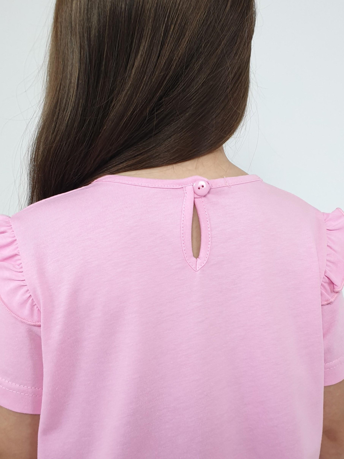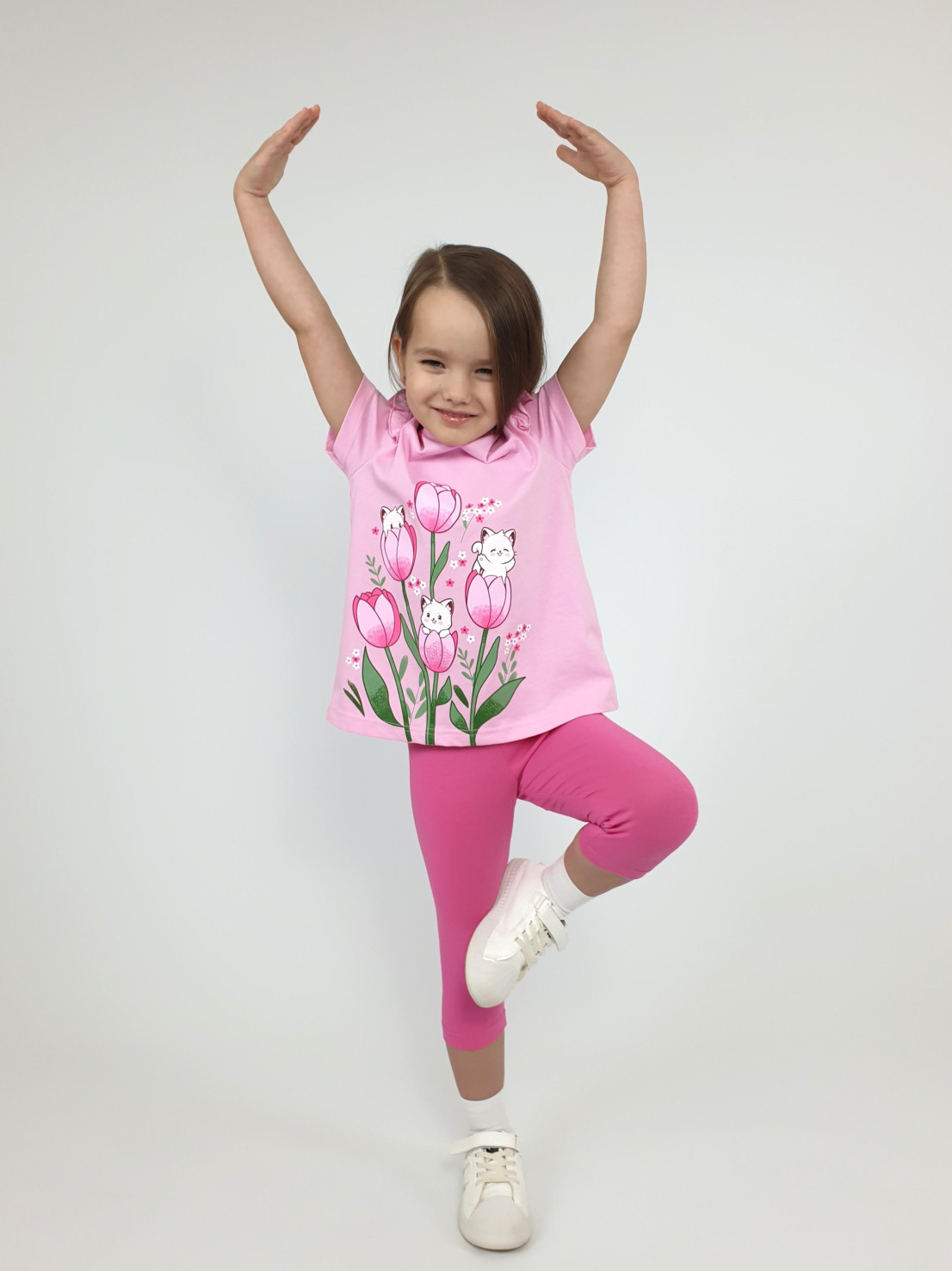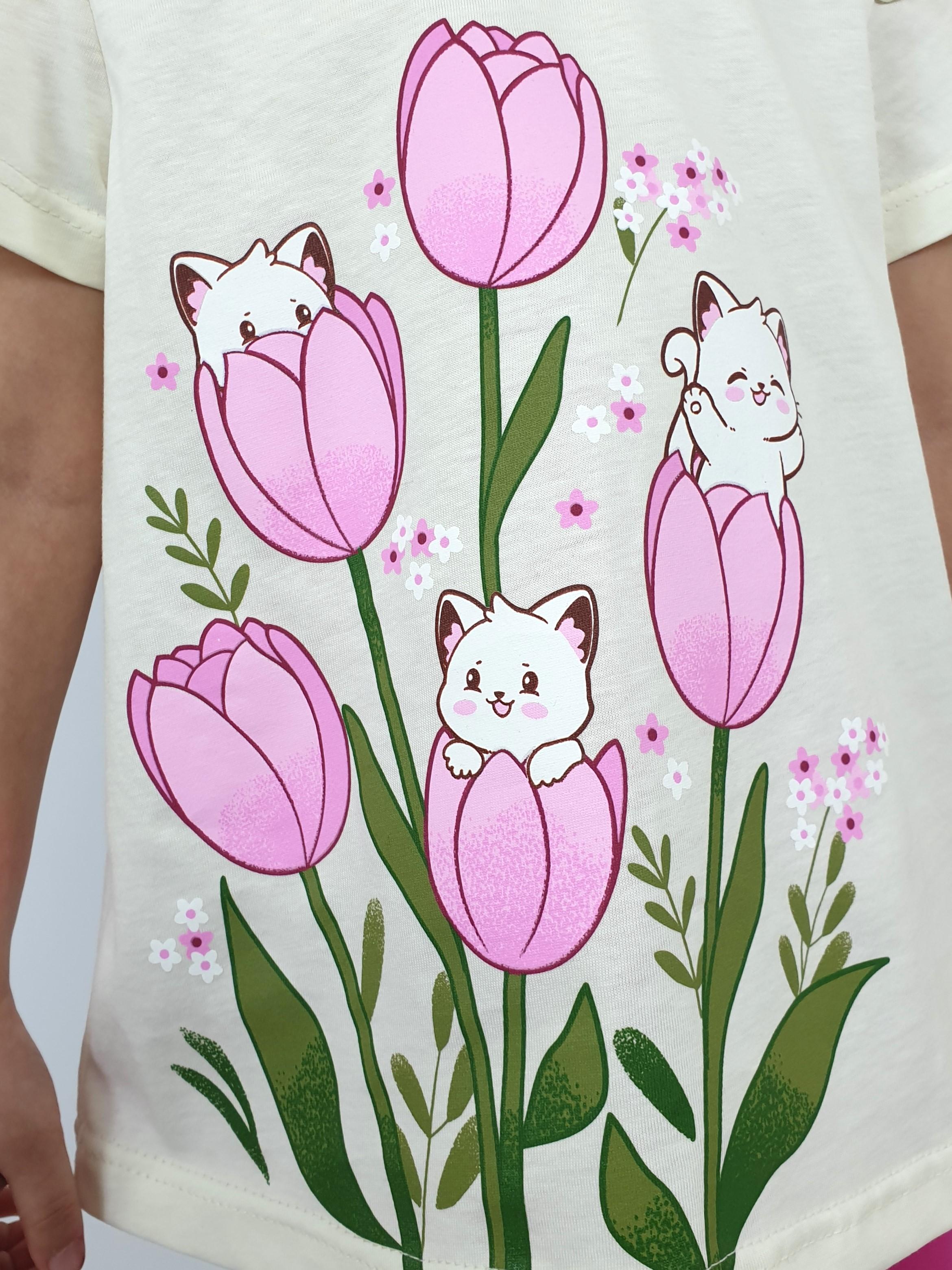 Кулирное полотно:100% х/б;95% х/б,5% лайкра. Джемпер-силуэт трапеция,короткий втачной рукав,в пройме рюша.Горловина окантована,застежка на пуговицу по спинке.Печать на переде. Лосины-укороченные вверху на резинке.