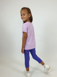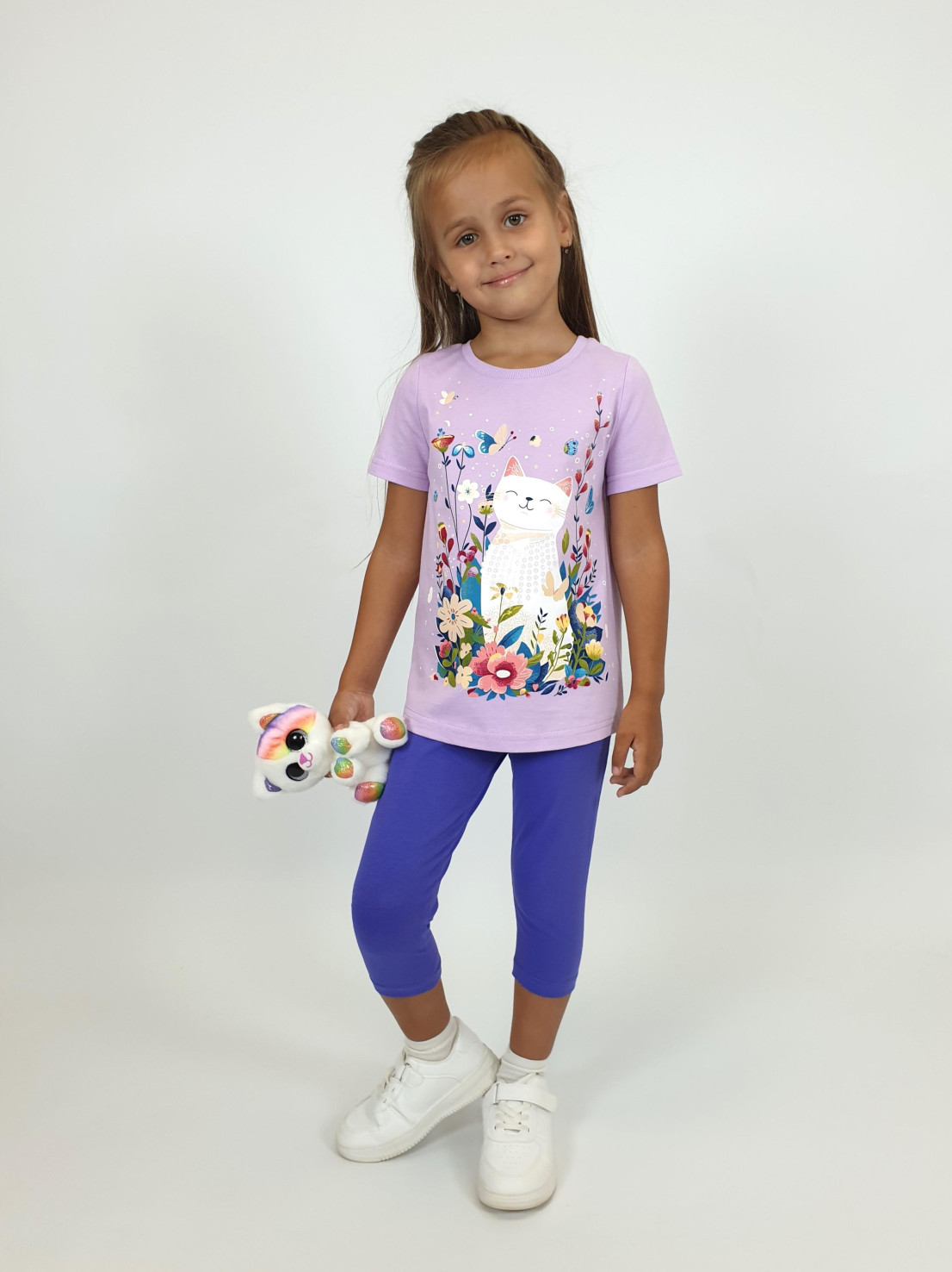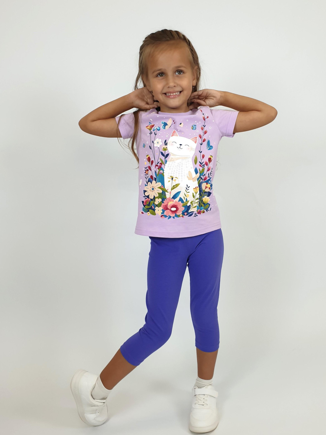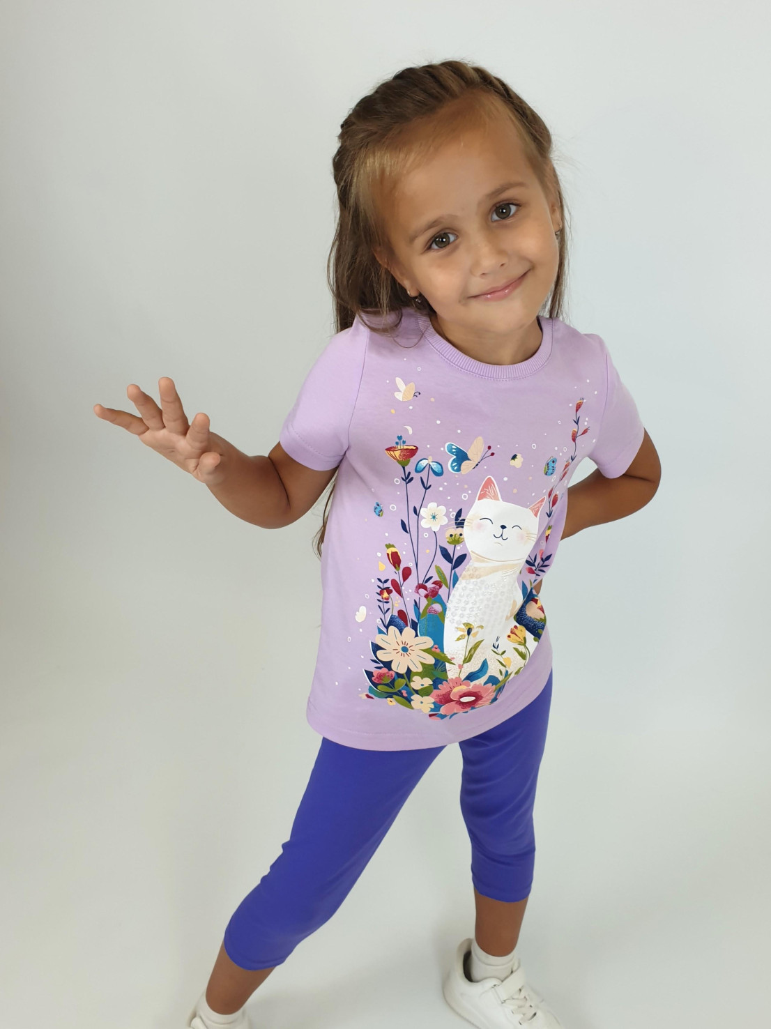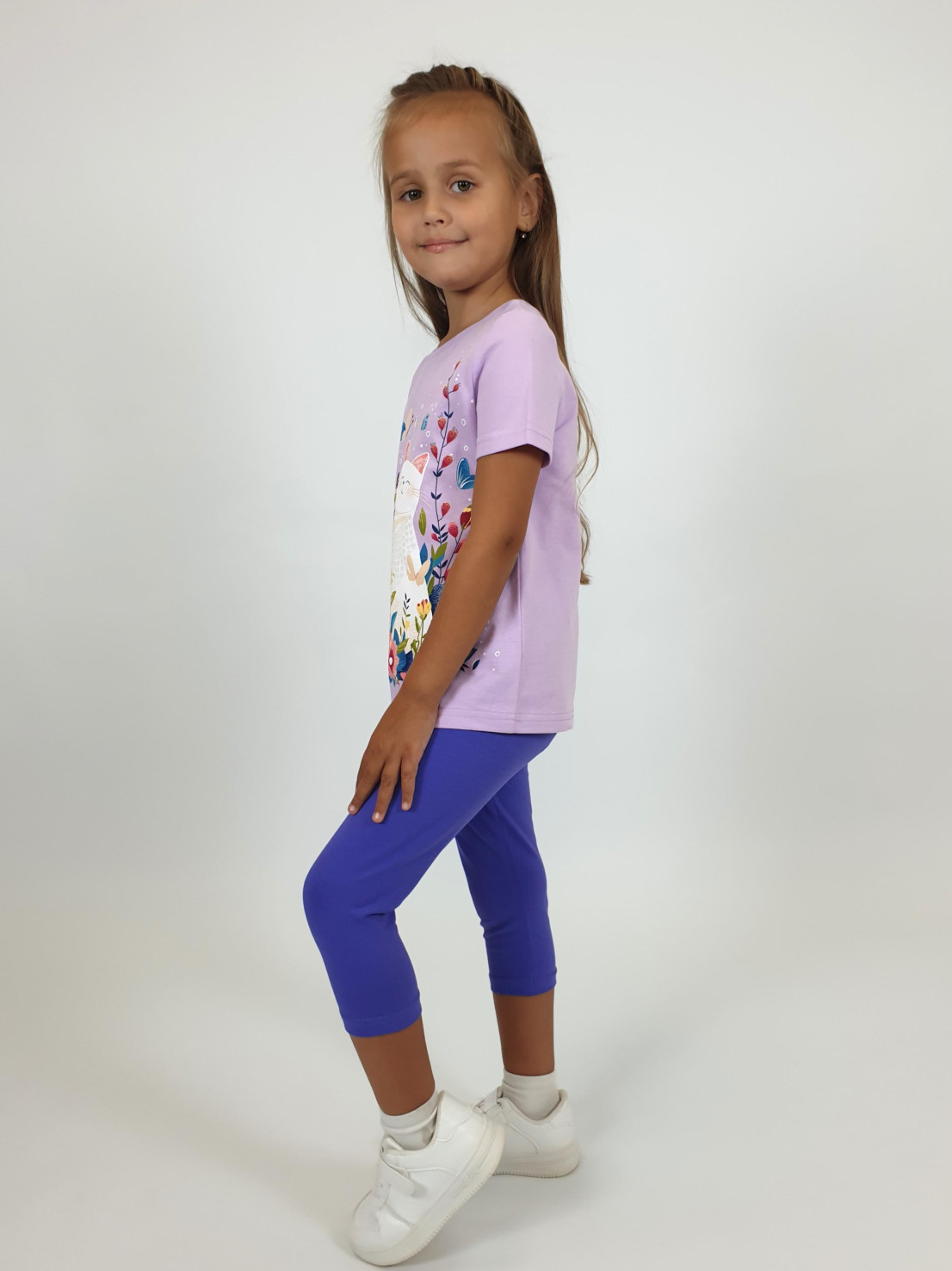 Кулирное полотно:100% х/б.-джемпер,95% х/б,5% лайкра-лосины. Джемпер-прямой силуэт,печать и вышивка(пайетки)на переде.Короткий,втачной рукав.Низ рукава и джемпера подшит.Горловина обработана ластиком. Лосины-укороченные,вверху на резинке.