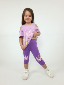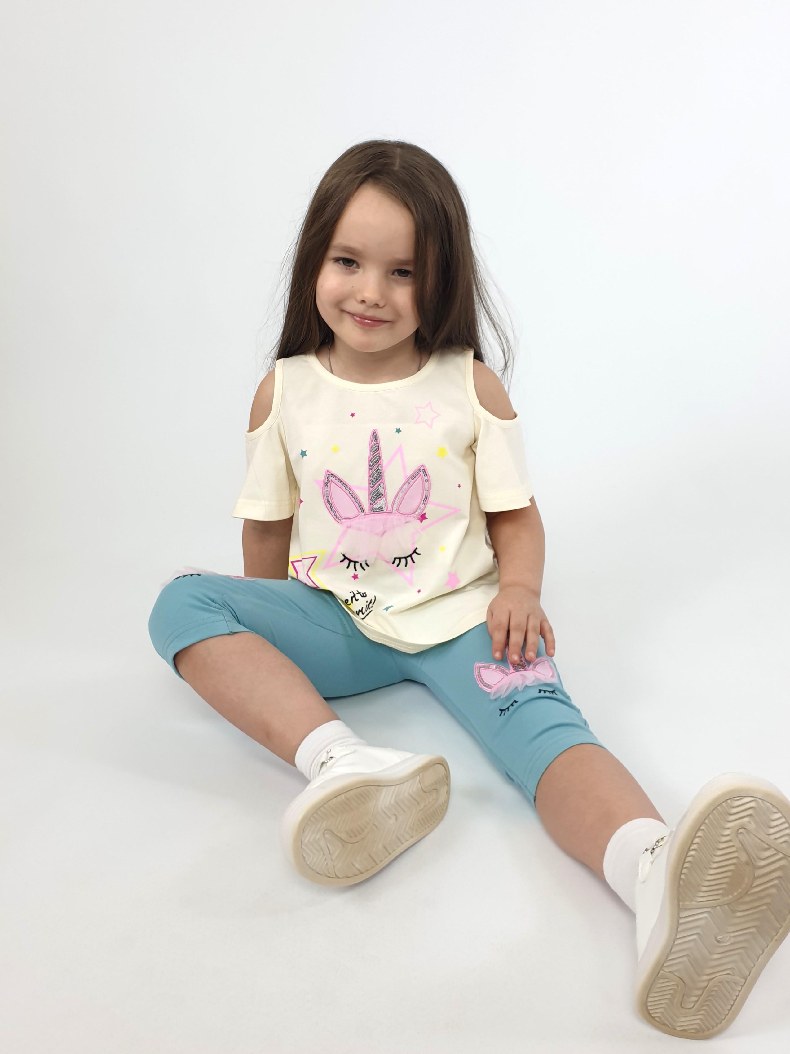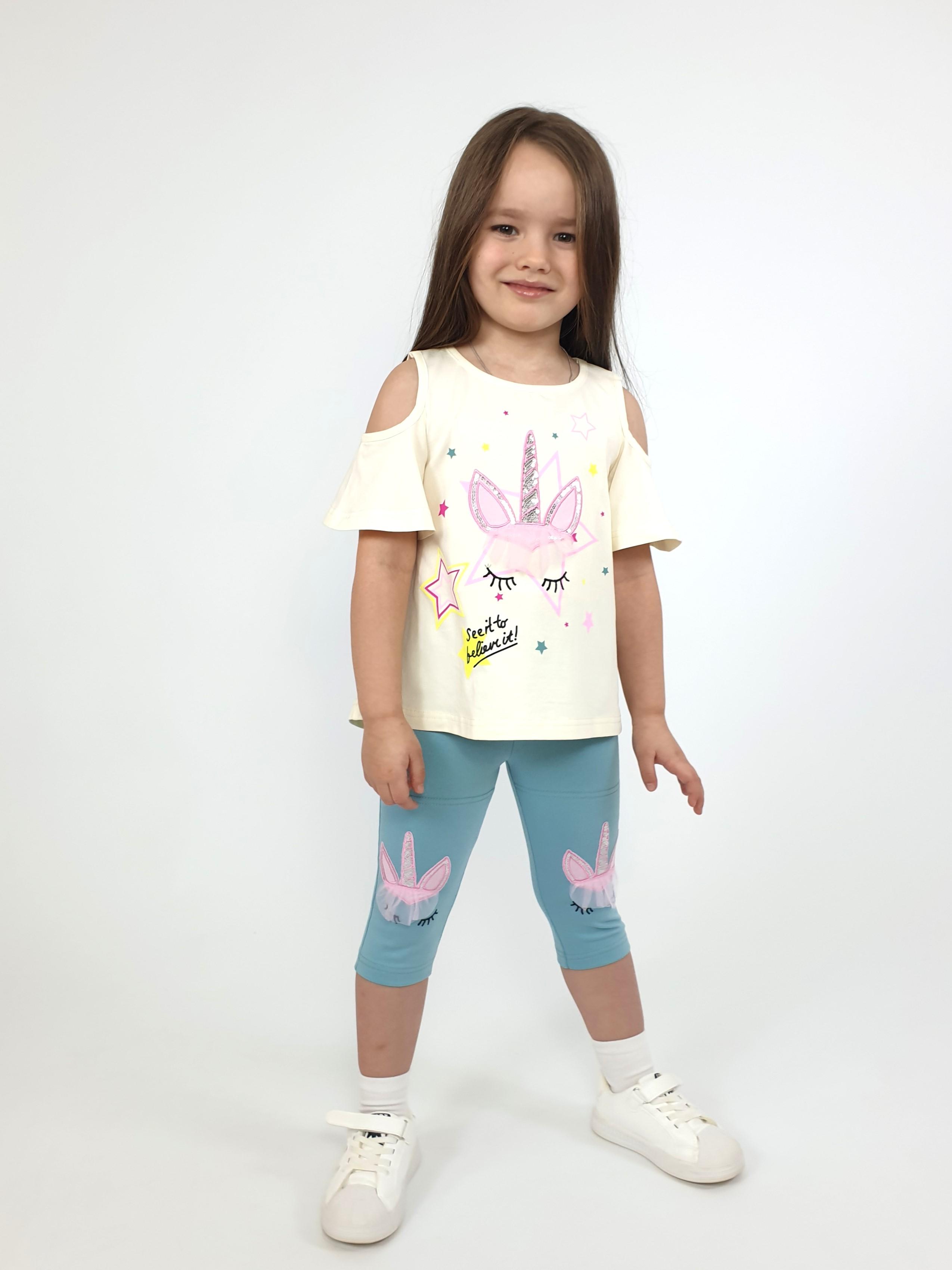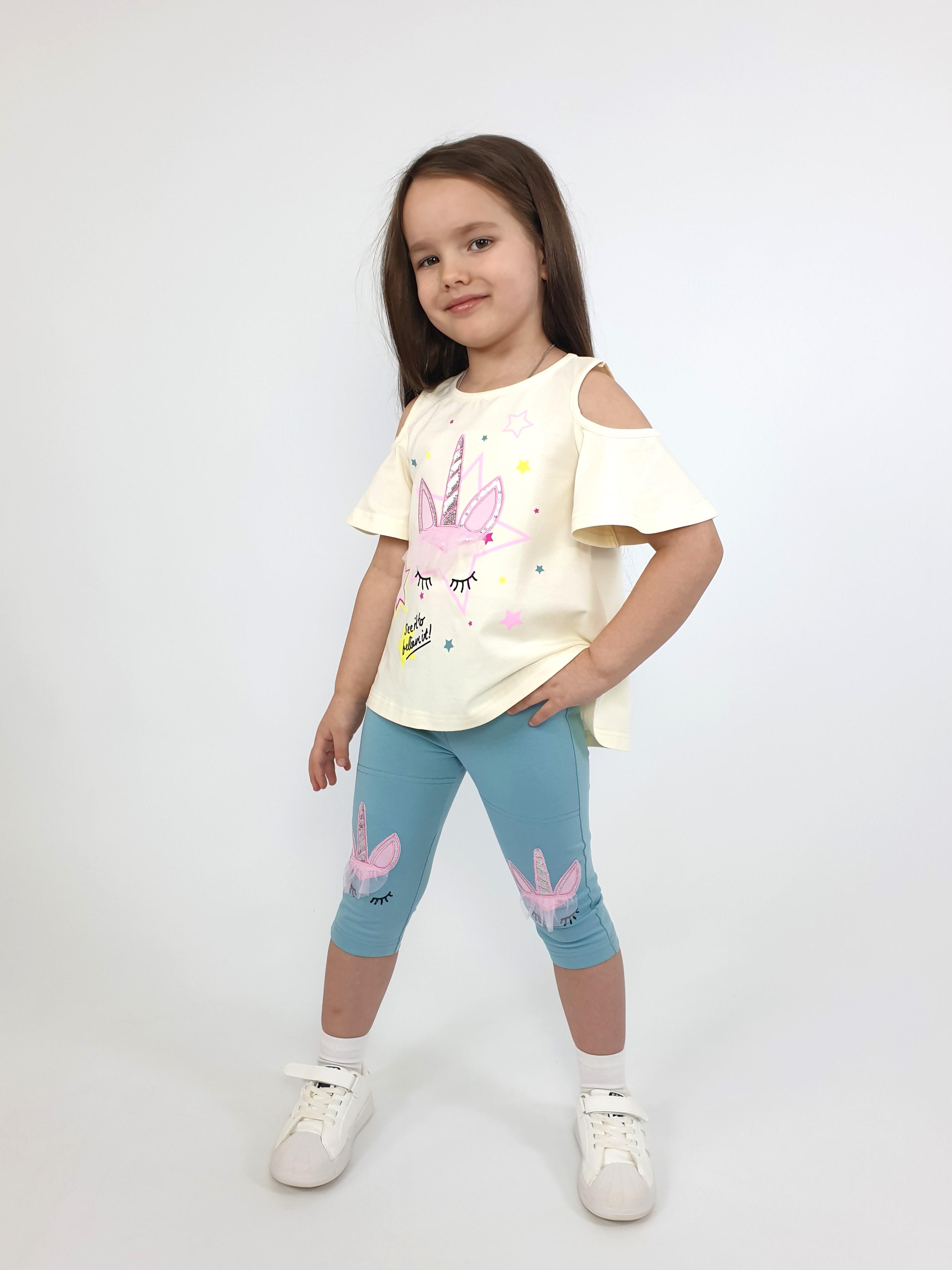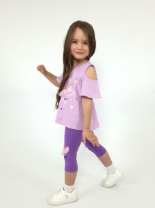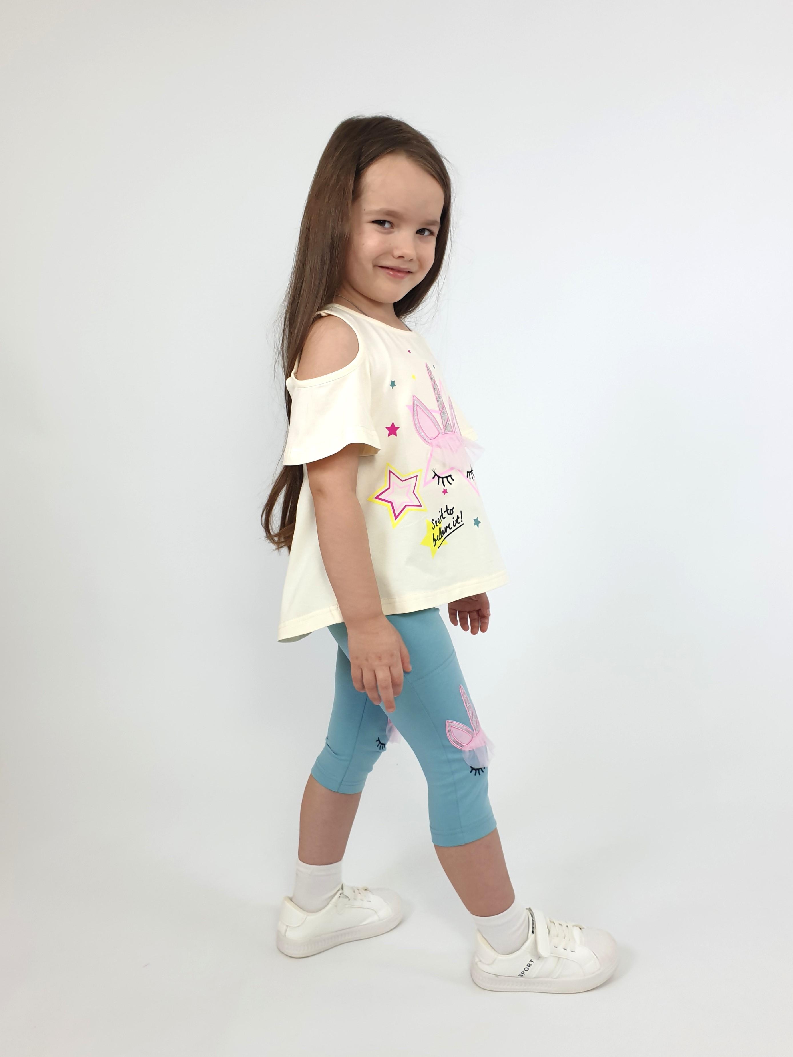 Кулирное полотно:95% х/б,5% лайкра. Джемпер-силуэт трапеция,печать и вышивка(аппликация) по переду.Рукав втачной с декоративным вырезом на плече.Горловина и вырез на плече окантованы. Лосины-укороченные с вышивкой-аппликацией и отделочным элементом из сетки.