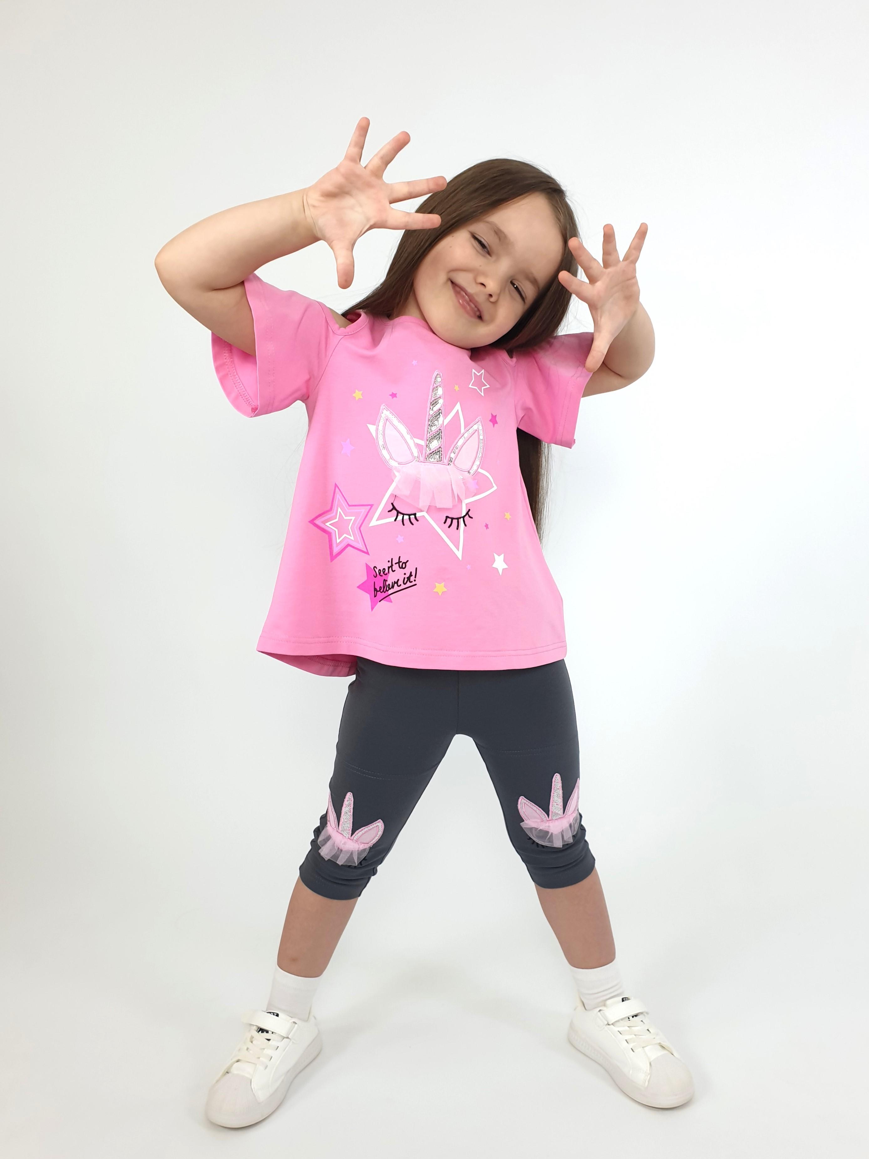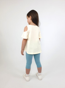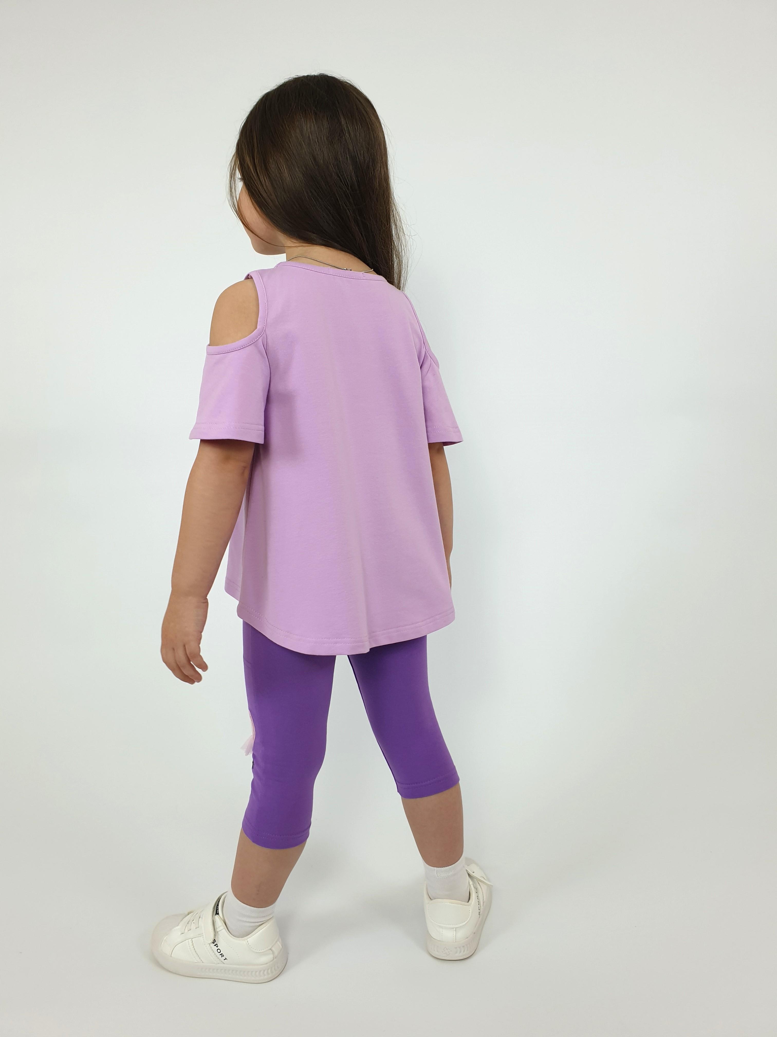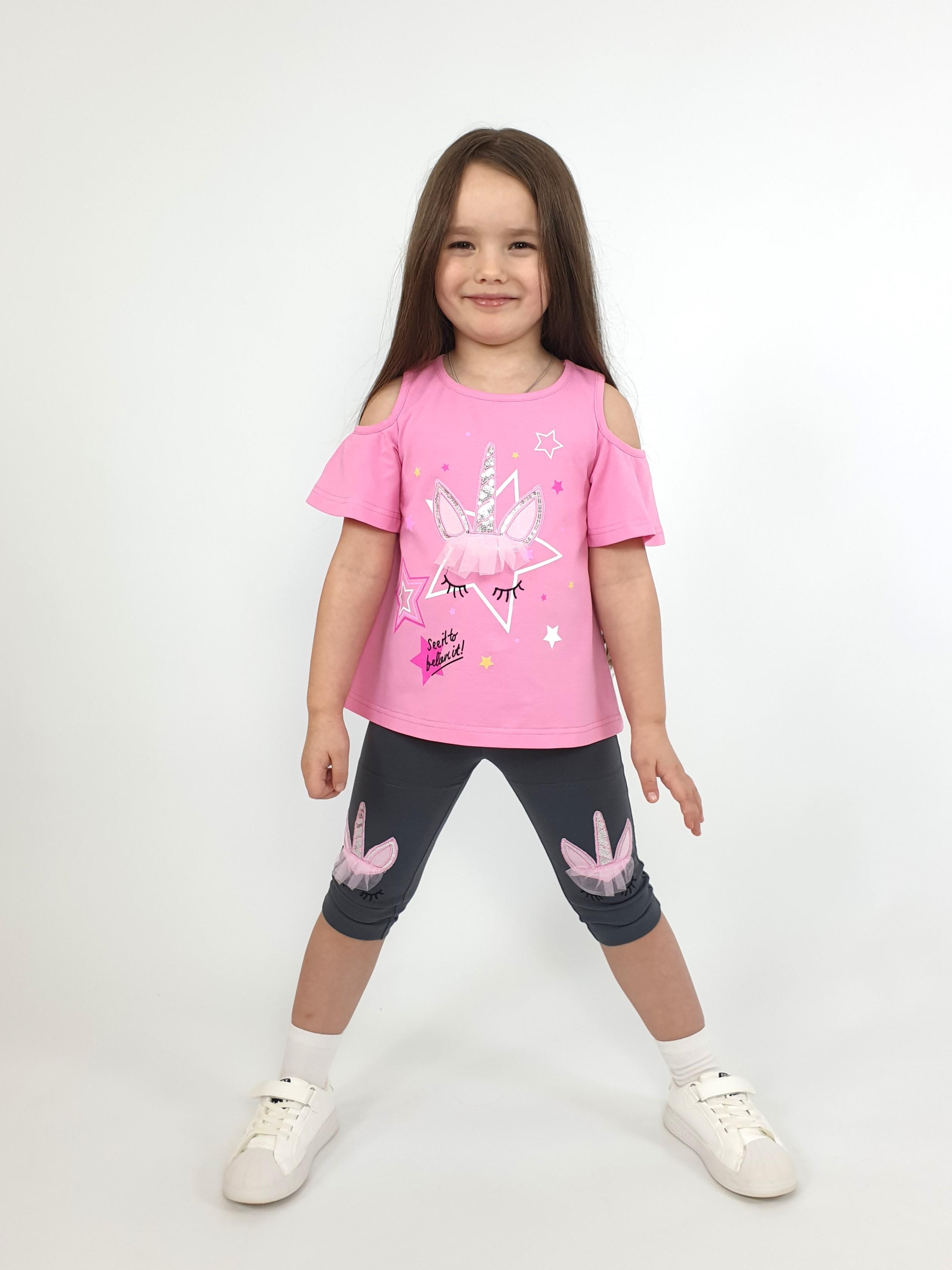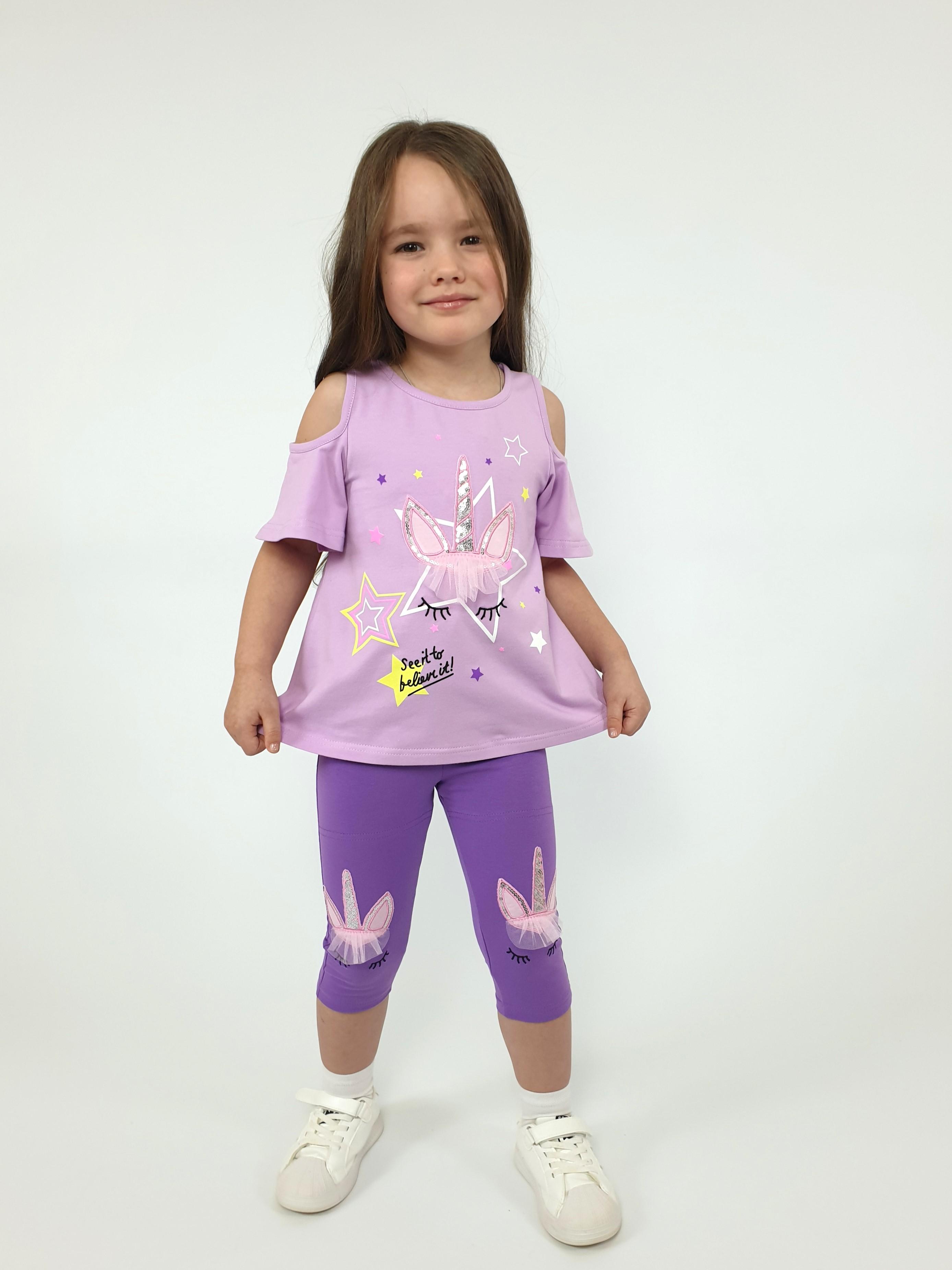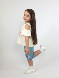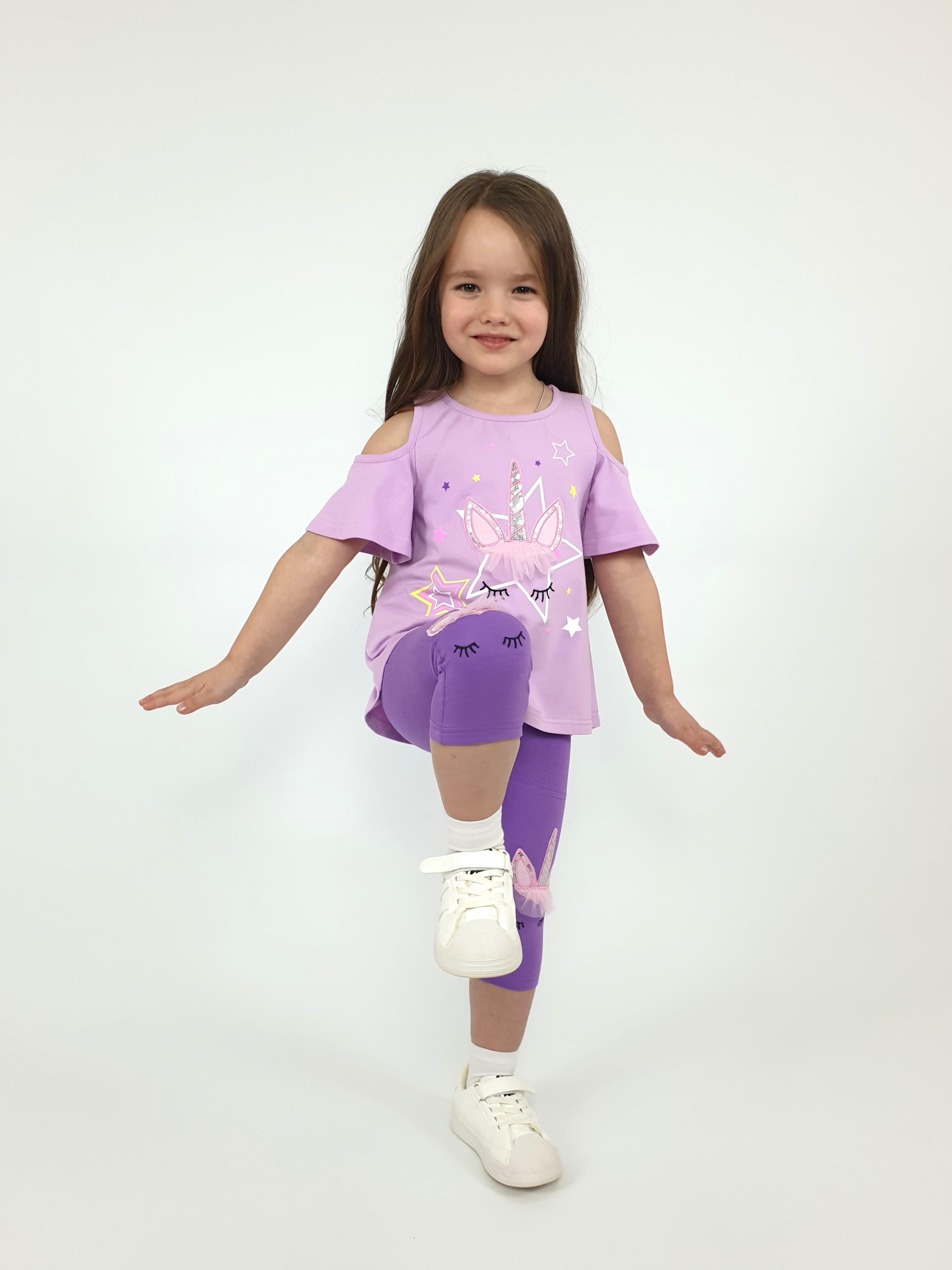 Кулирное полотно:95% х/б,5% лайкра. Джемпер-силуэт трапеция,печать и вышивка(аппликация) по переду.Рукав втачной с декоративным вырезом на плече.Горловина и вырез на плече окантованы. Лосины-укороченные с вышивкой-аппликацией и отделочным элементом из сетки.