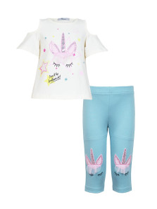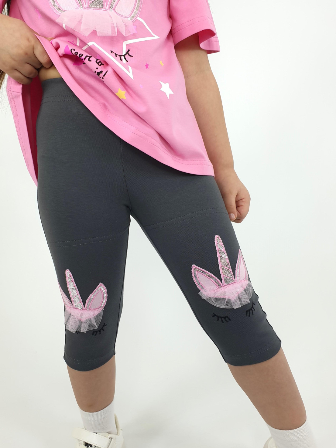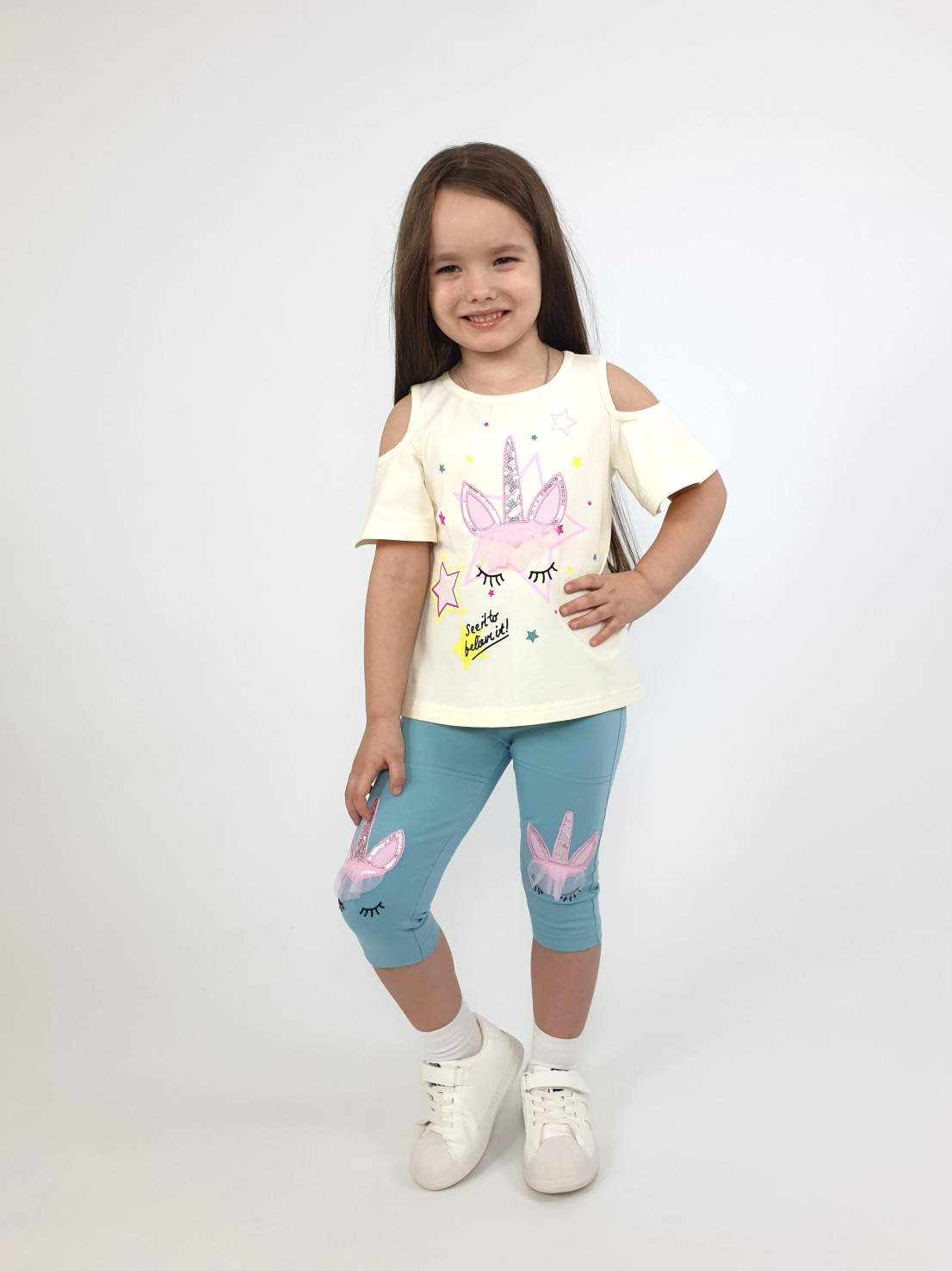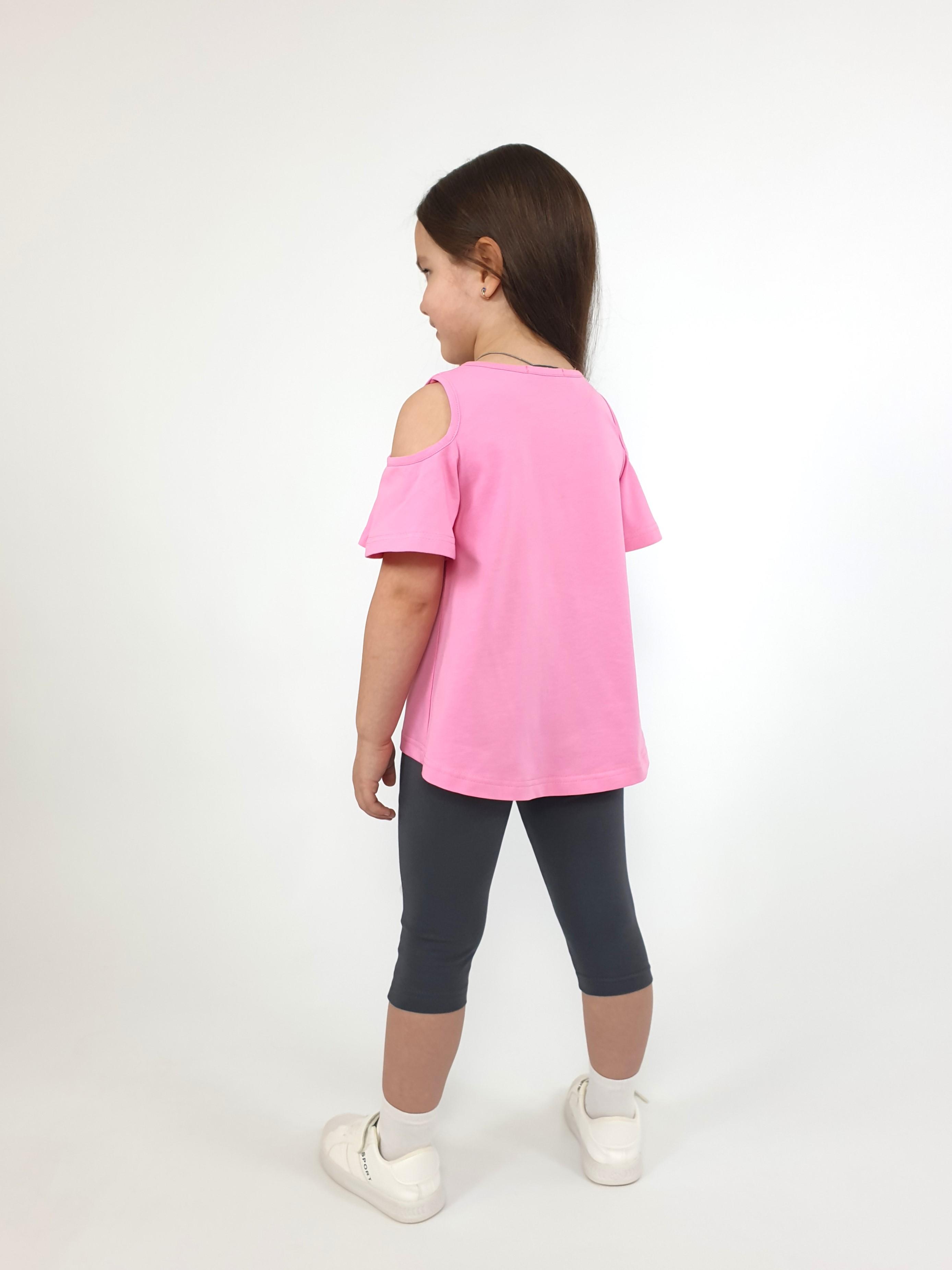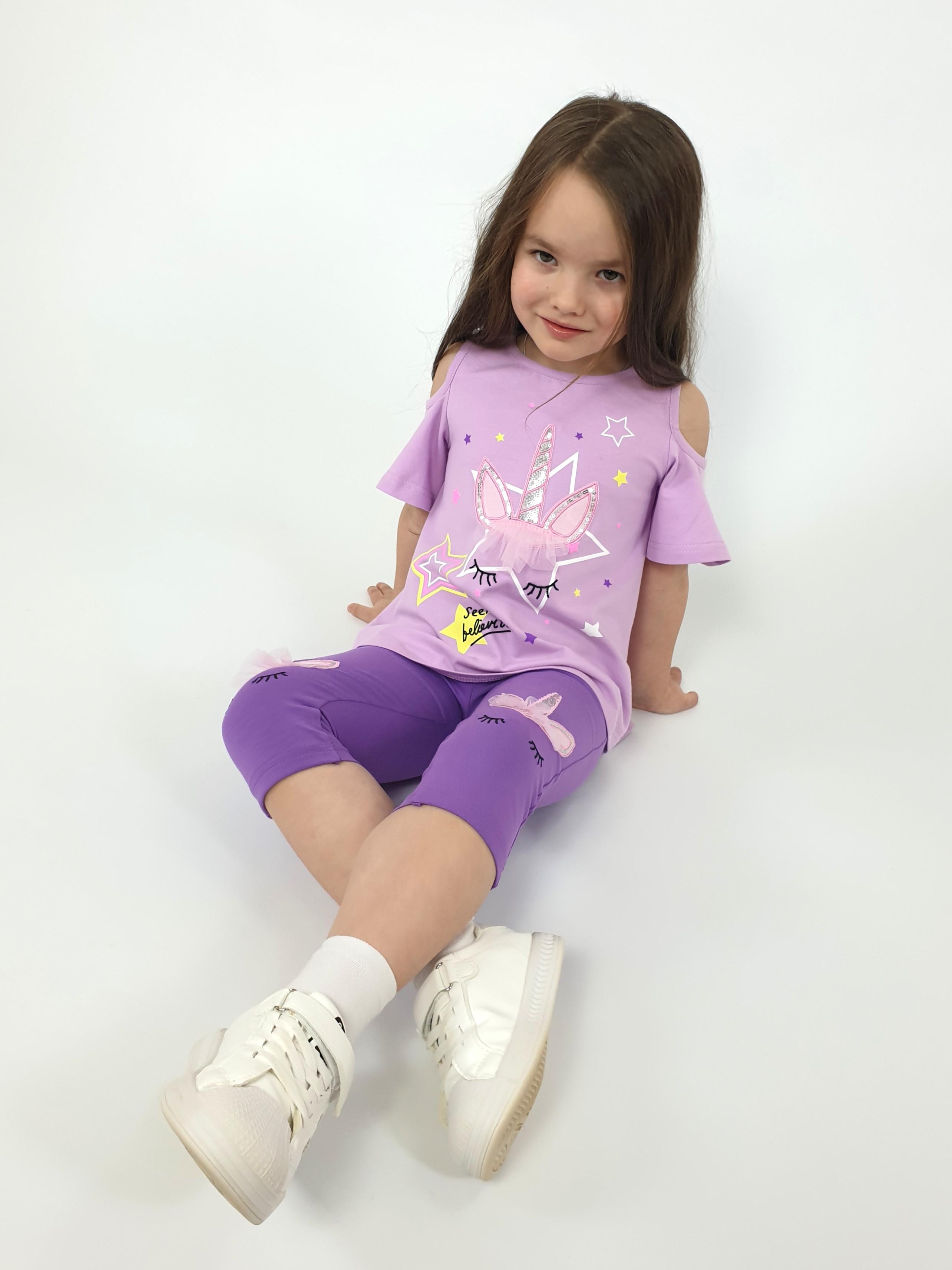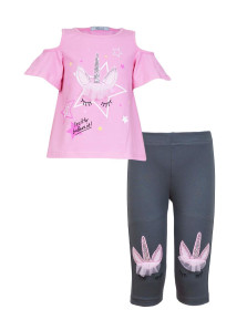 Кулирное полотно:95% х/б,5% лайкра. Джемпер-силуэт трапеция,печать и вышивка(аппликация) по переду.Рукав втачной с декоративным вырезом на плече.Горловина и вырез на плече окантованы. Лосины-укороченные с вышивкой-аппликацией и отделочным элементом из сетки.