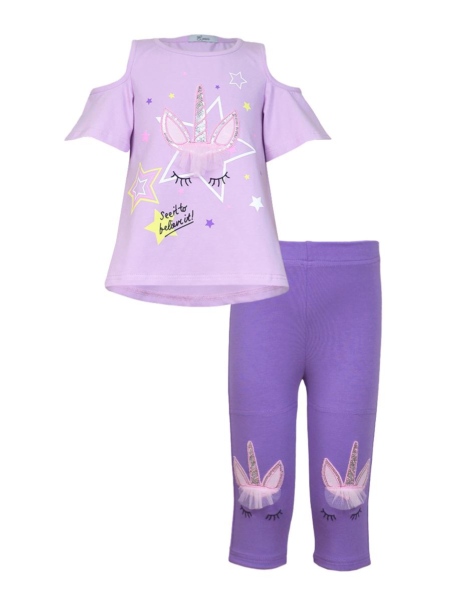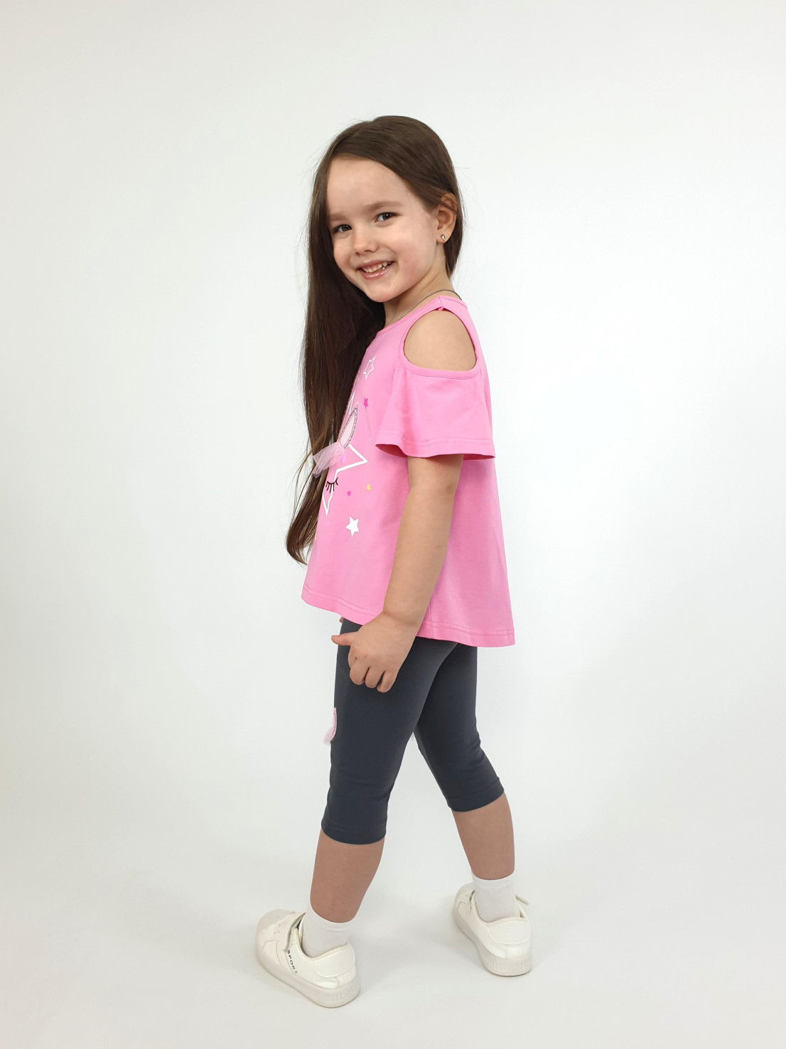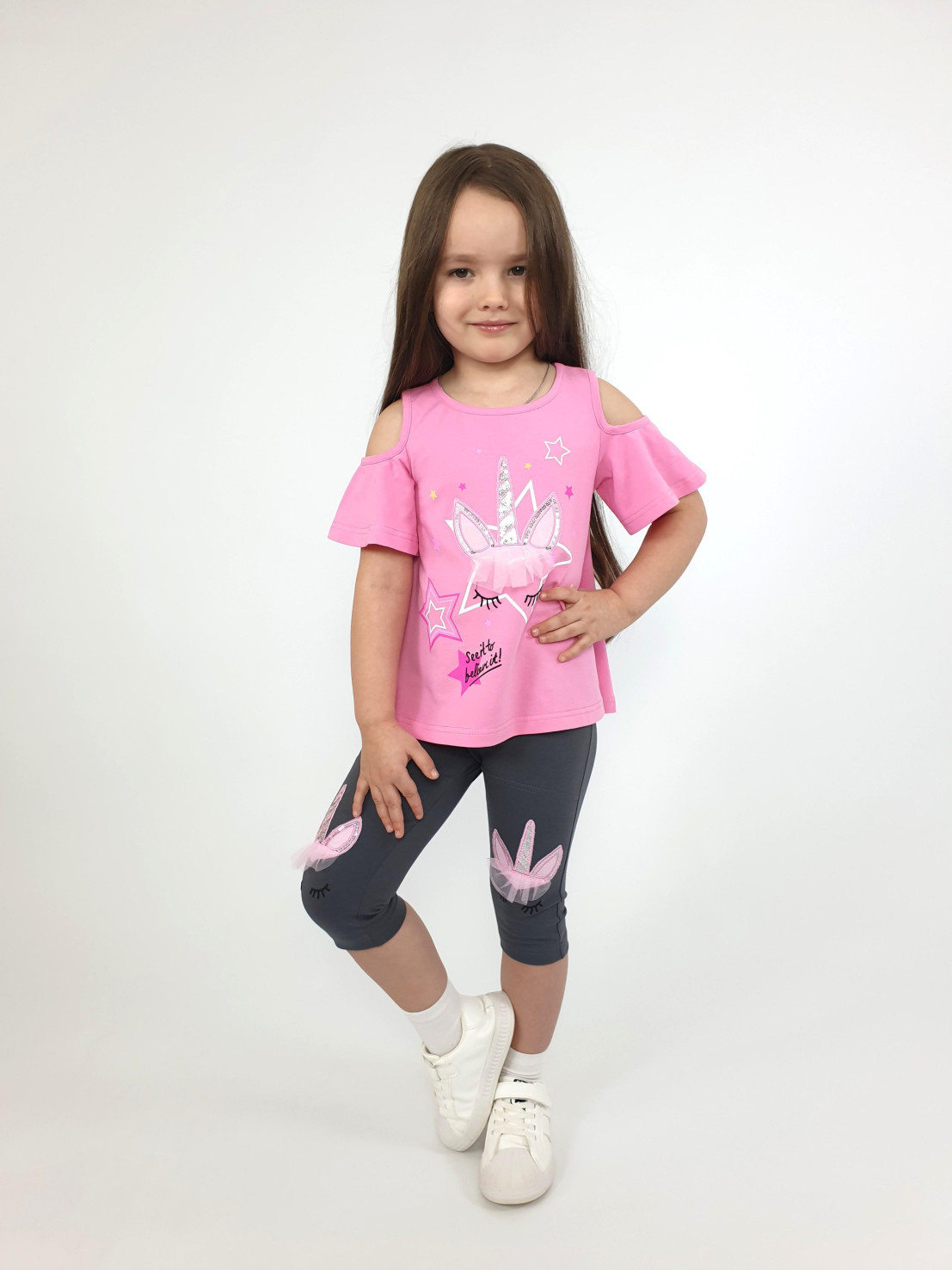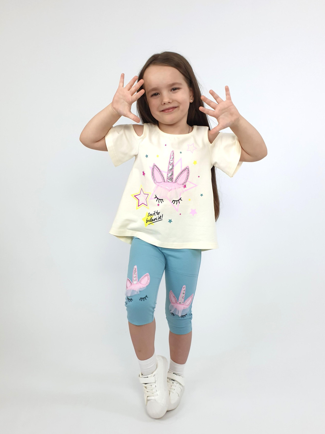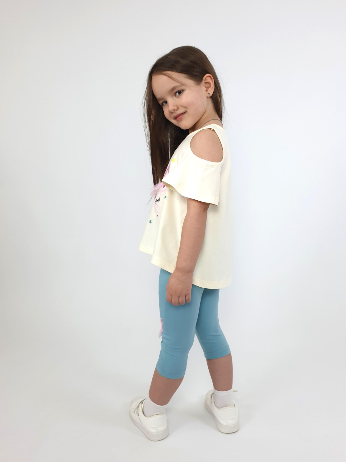 Кулирное полотно:95% х/б,5% лайкра. Джемпер-силуэт трапеция,печать и вышивка(аппликация) по переду.Рукав втачной с декоративным вырезом на плече.Горловина и вырез на плече окантованы. Лосины-укороченные с вышивкой-аппликацией и отделочным элементом из сетки.