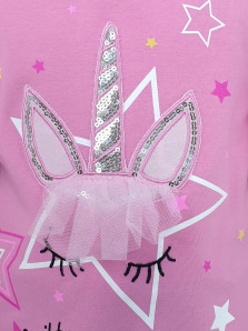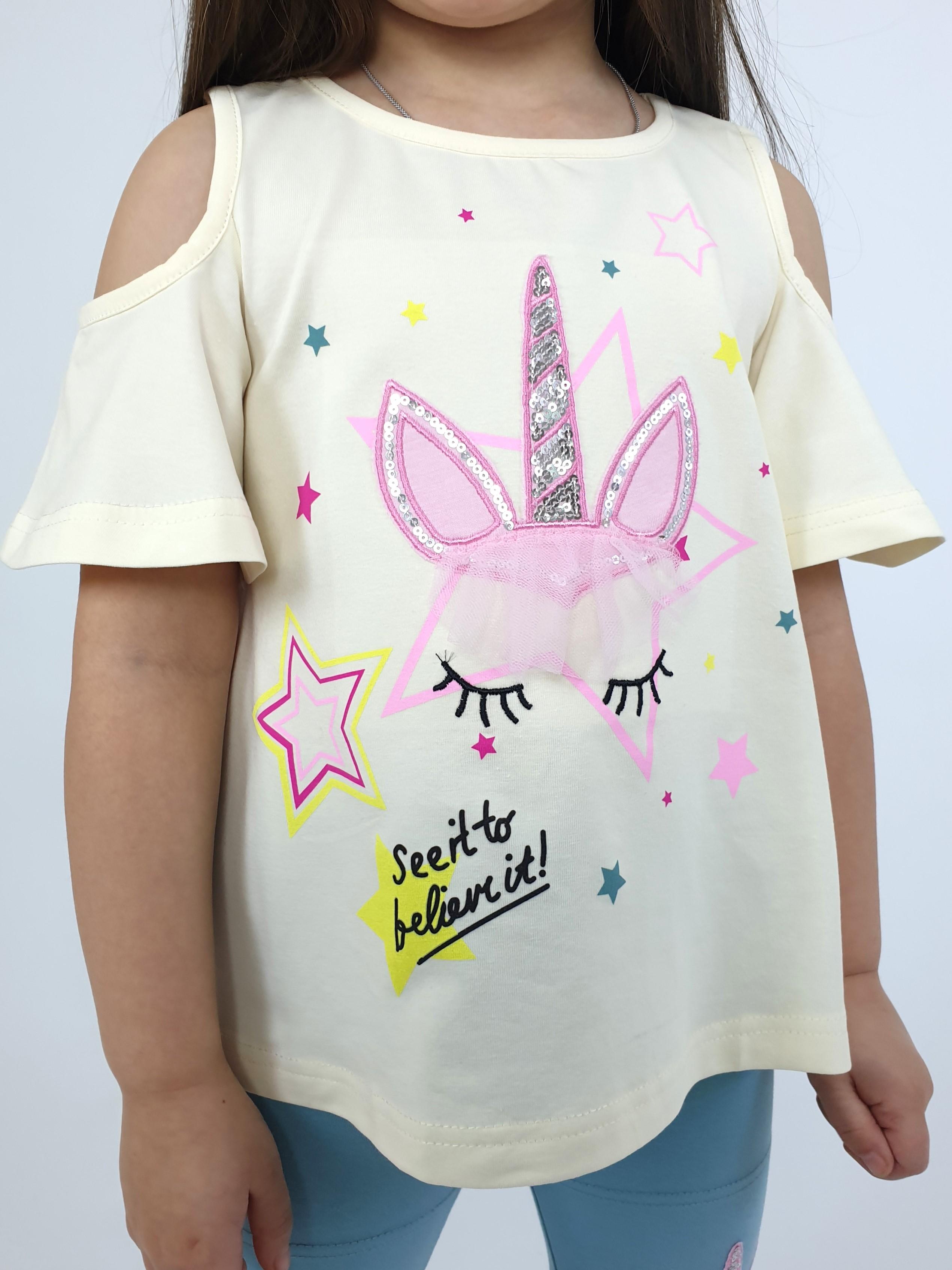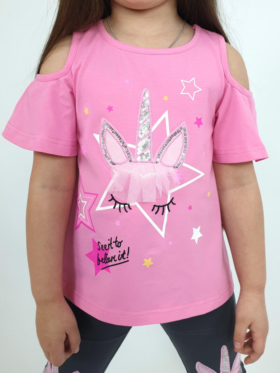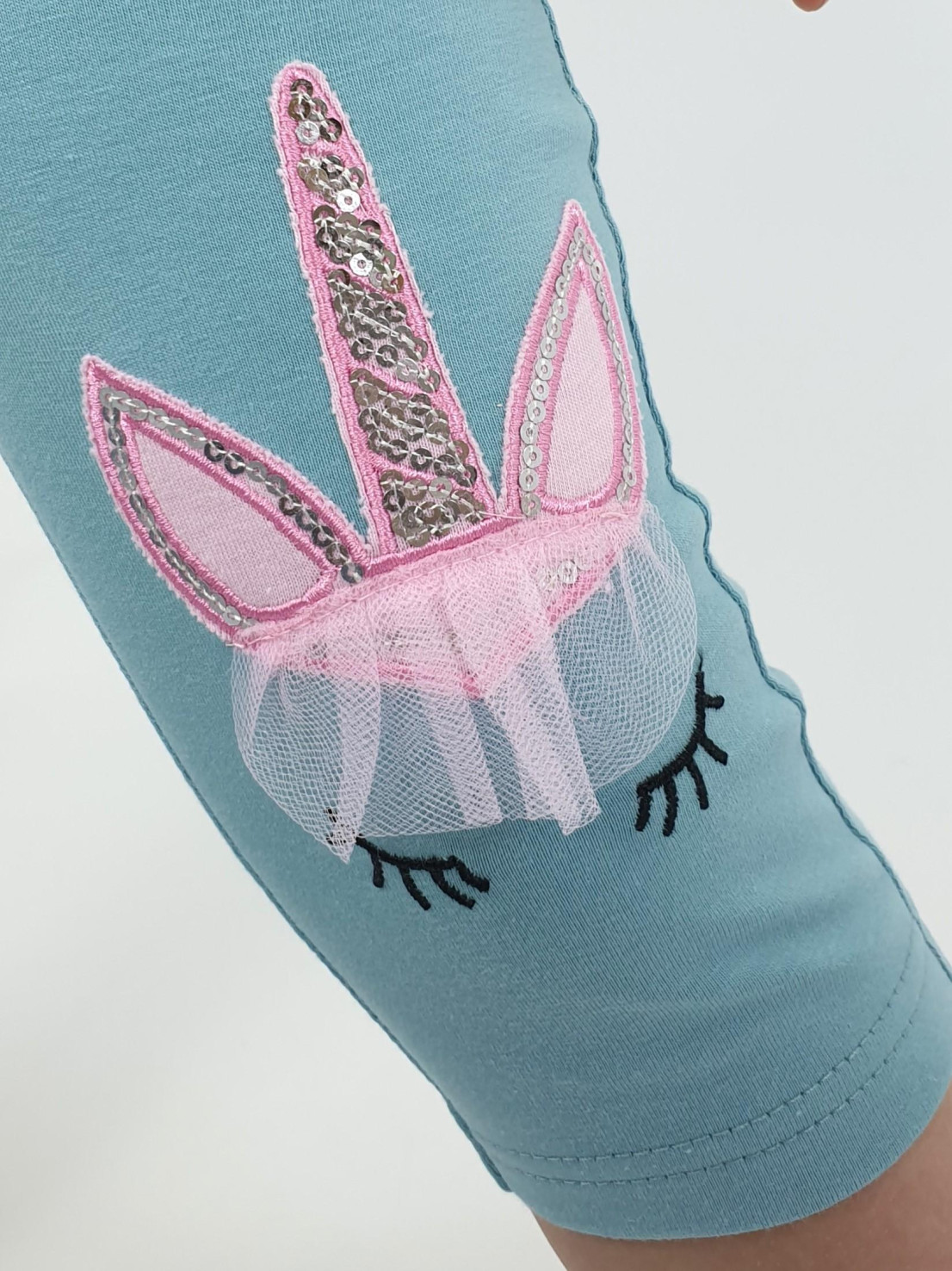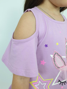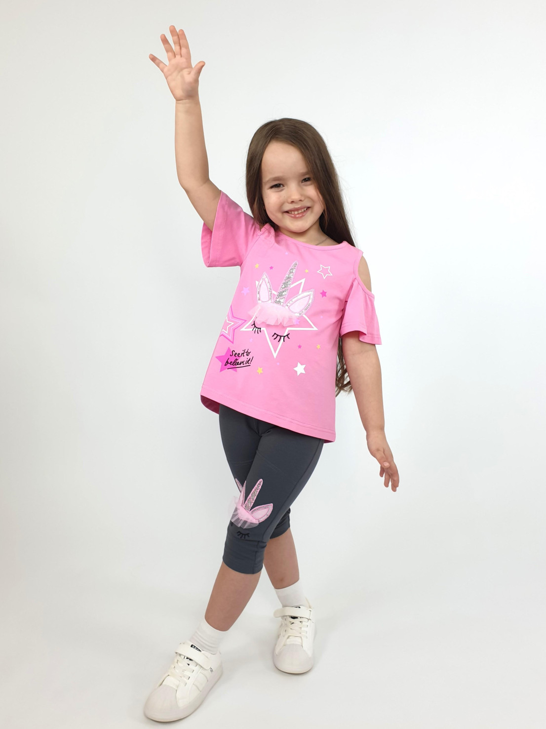 Кулирное полотно:95% х/б,5% лайкра. Джемпер-силуэт трапеция,печать и вышивка(аппликация) по переду.Рукав втачной с декоративным вырезом на плече.Горловина и вырез на плече окантованы. Лосины-укороченные с вышивкой-аппликацией и отделочным элементом из сетки.