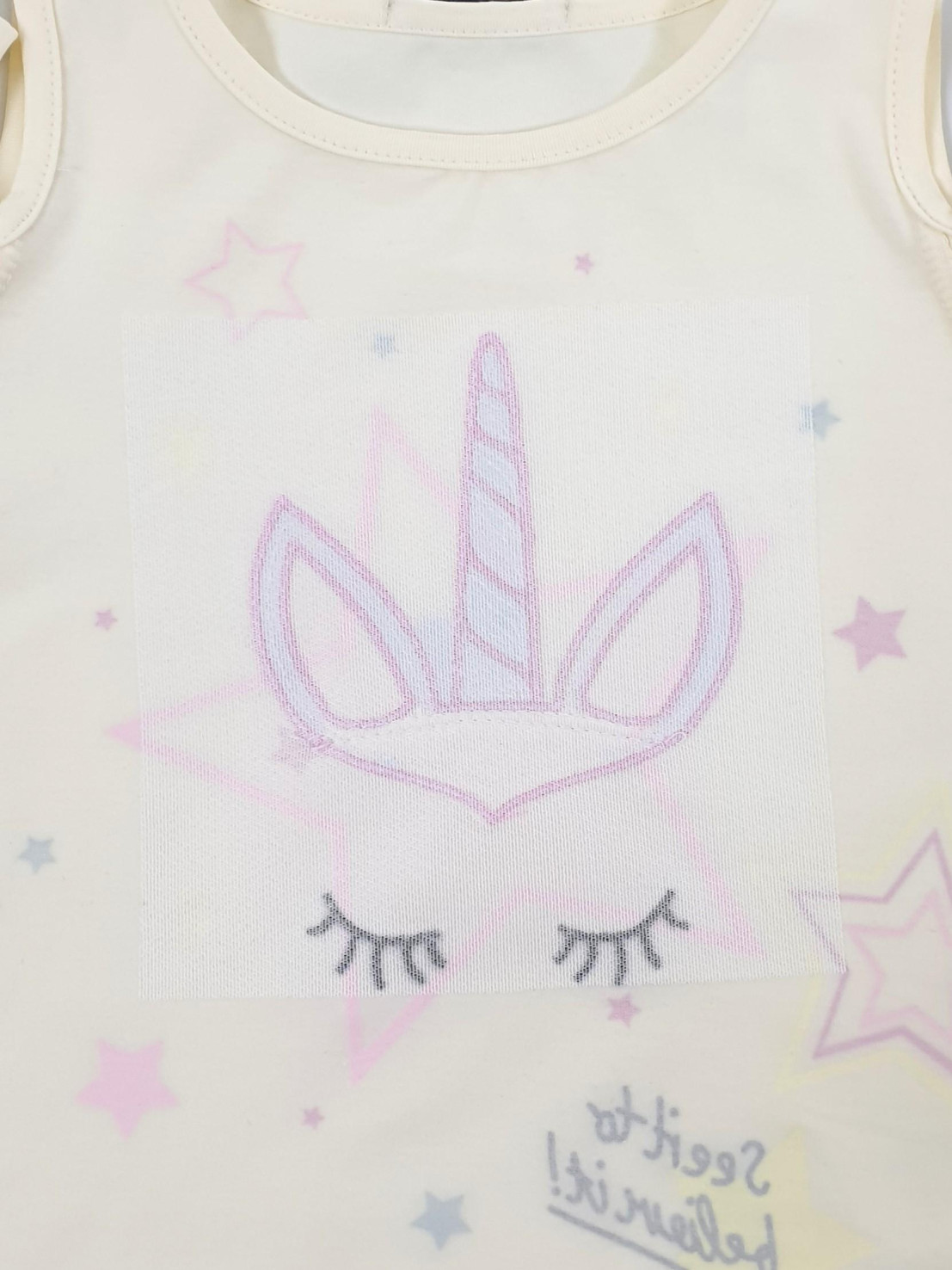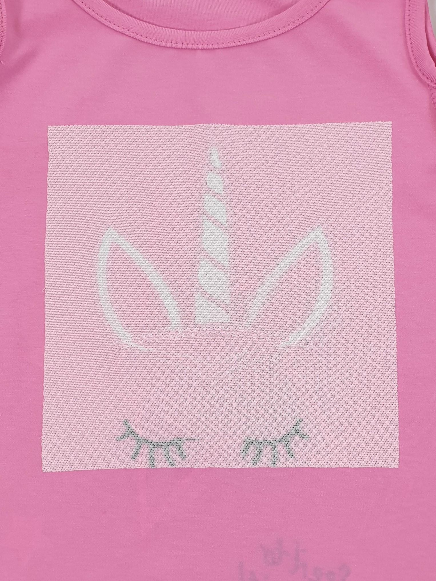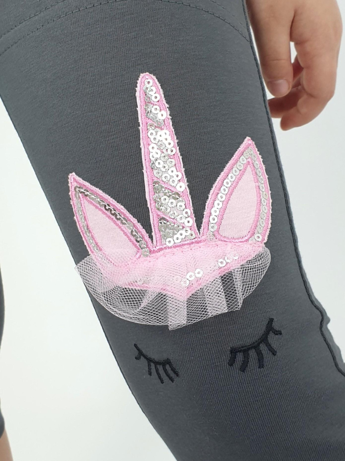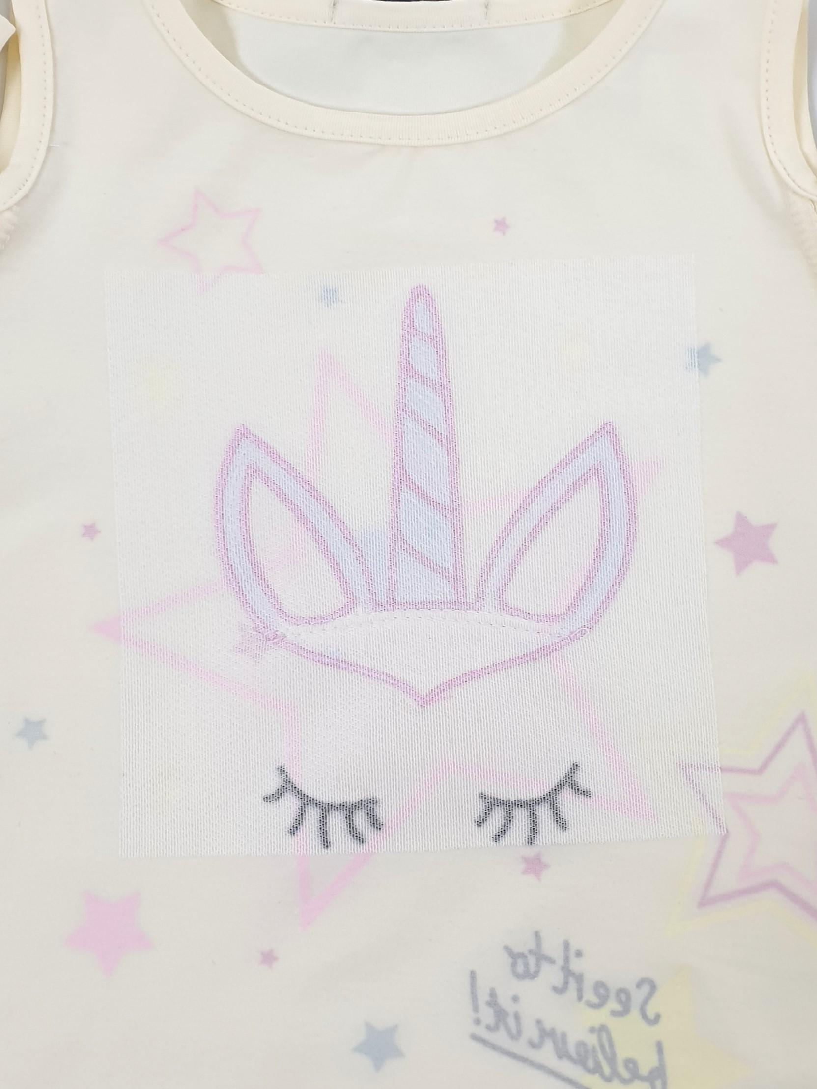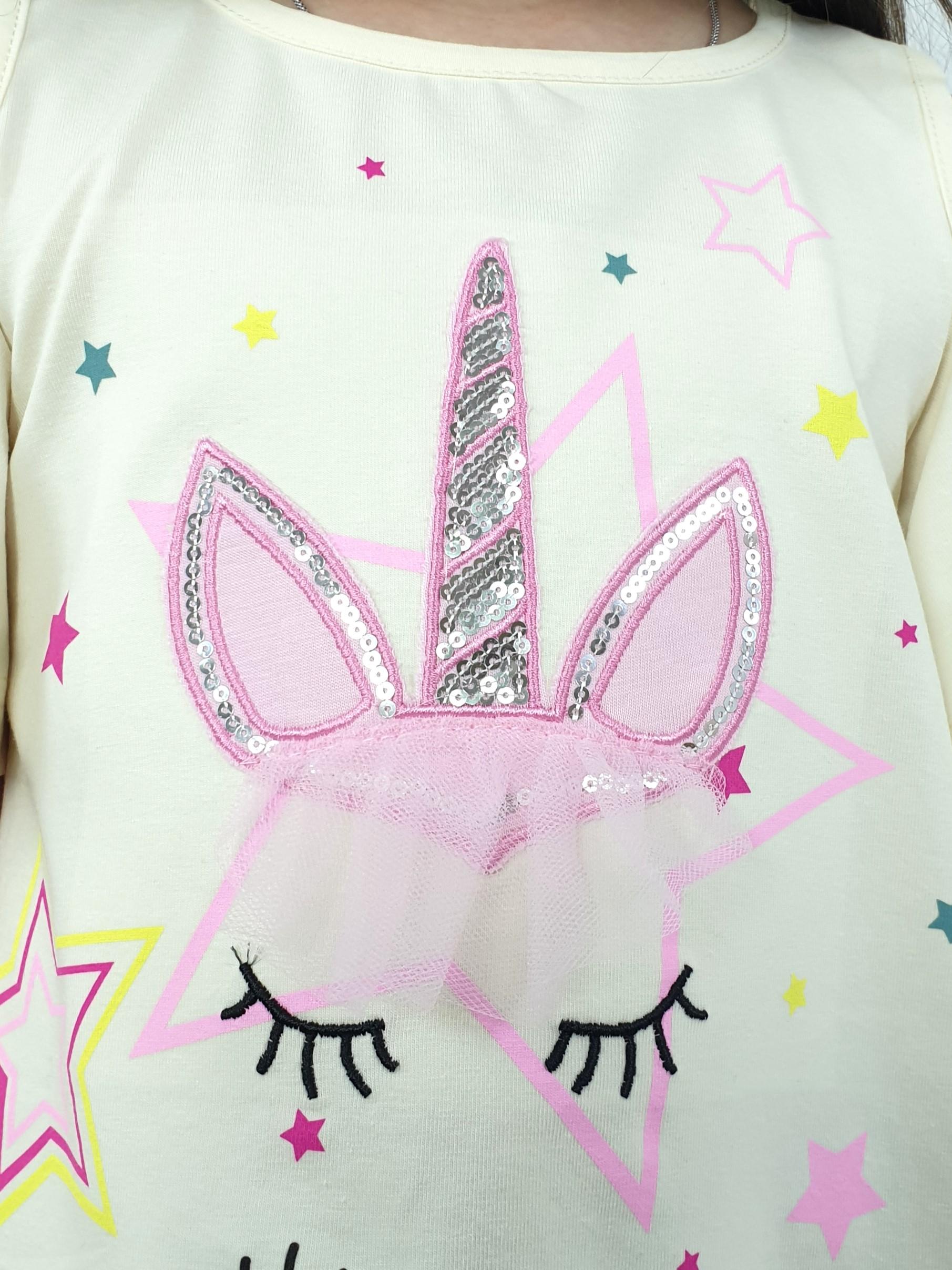Кулирное полотно:95% х/б,5% лайкра. Джемпер-силуэт трапеция,печать и вышивка(аппликация) по переду.Рукав втачной с декоративным вырезом на плече.Горловина и вырез на плече окантованы. Лосины-укороченные с вышивкой-аппликацией и отделочным элементом из сетки.