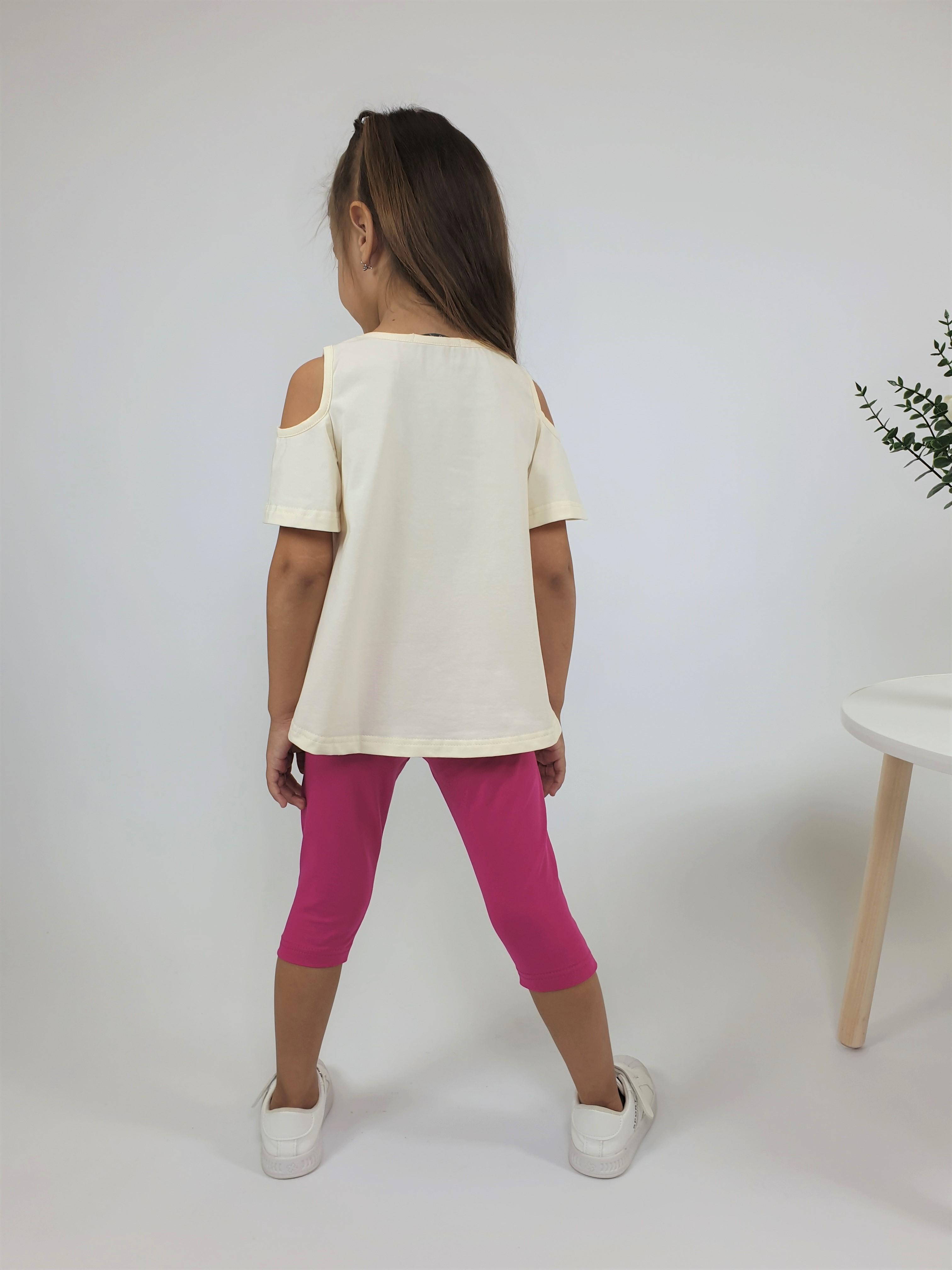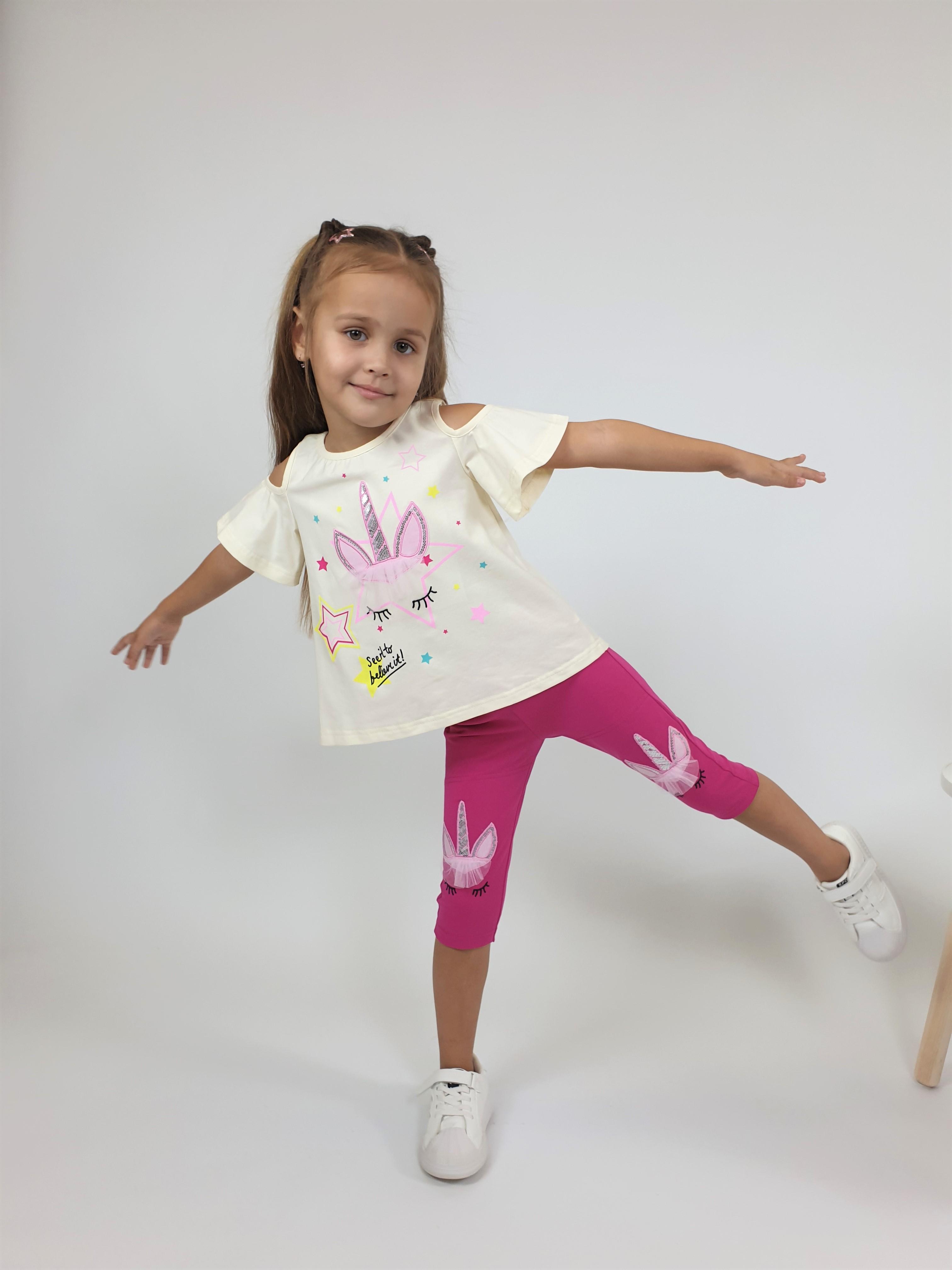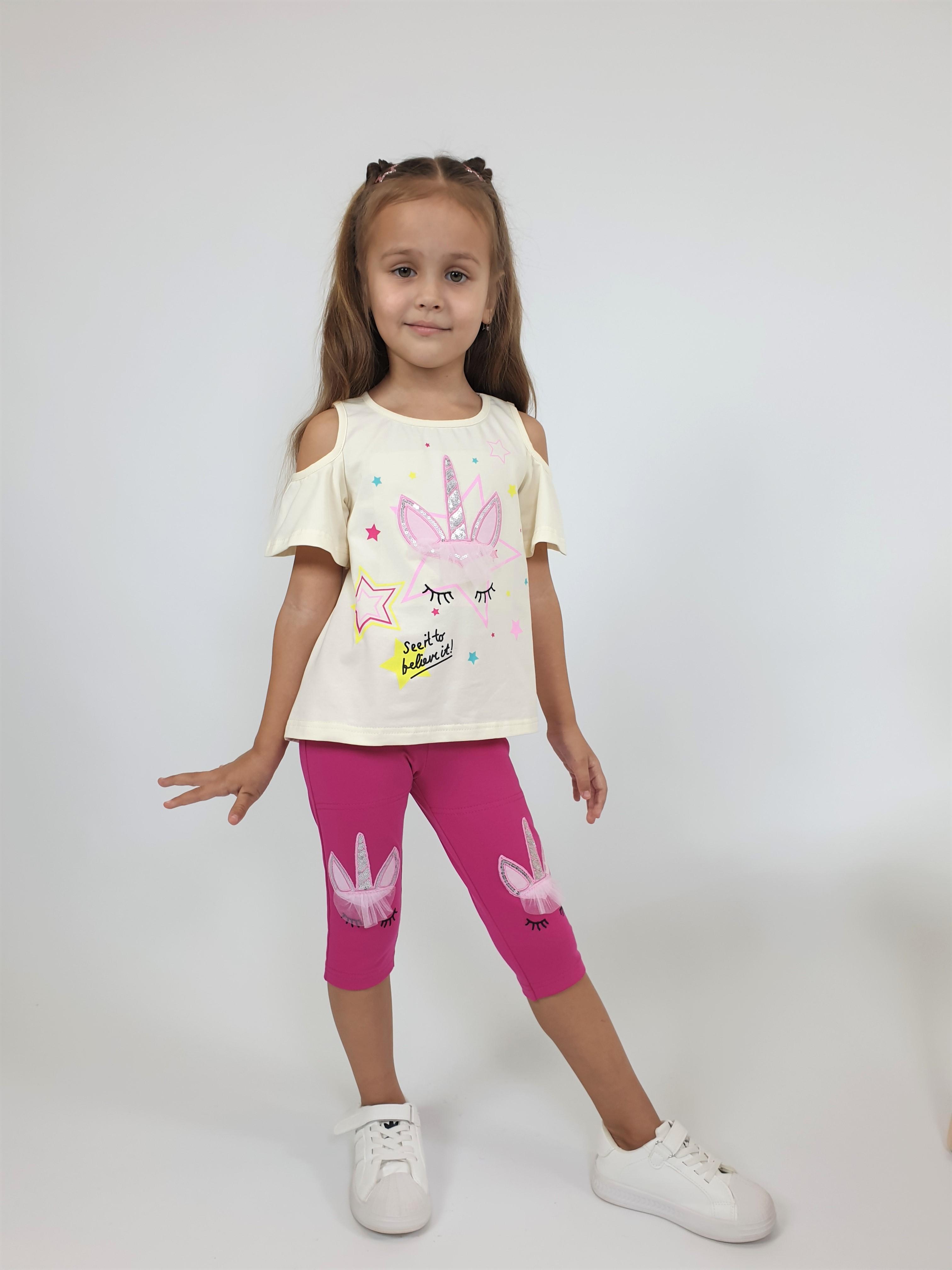 Кулирное полотно:95% х/б,5% лайкра. Фуфайка-силуэт трапеция,печать и вышивка(аппликация) по переду.Рукав втачной с декоративным вырезом на плече.Горловина и вырез на плече окантованы. Лосины-укороченные с вышивкой-аппликацией и отделочным элементом из сетки.