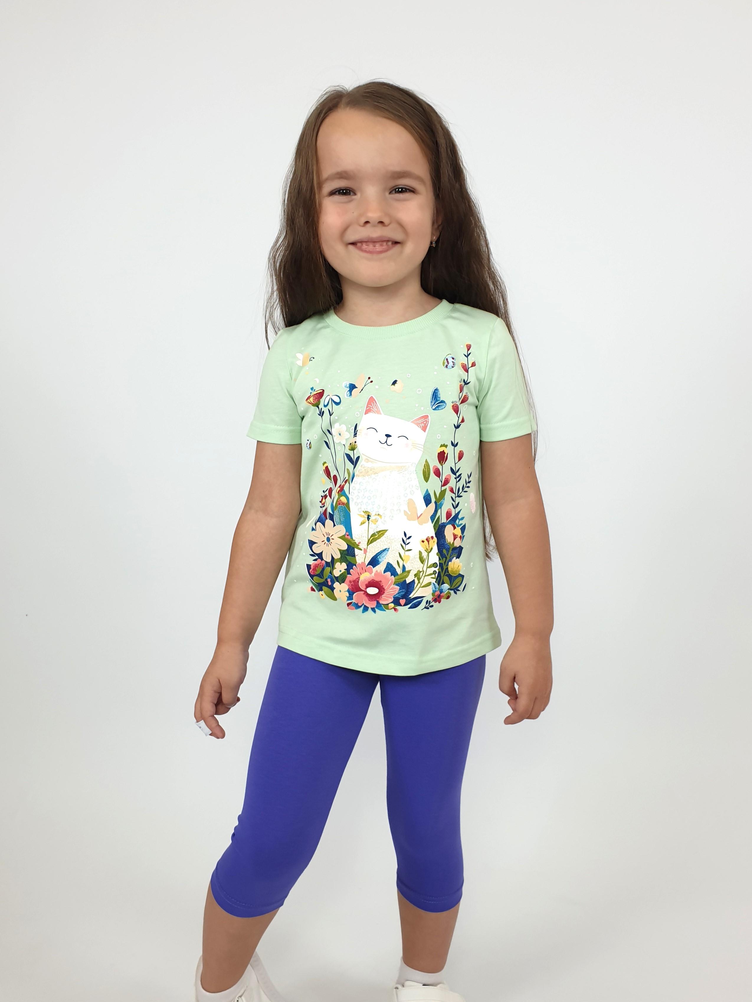 Кулирное полотно:100% х/б.-джемпер,95% х/б,5% лайкра-лосины. Джемпер-прямой силуэт,печать и вышивка(пайетки)на переде.Короткий,втачной рукав.Низ рукава и джемпера подшит.Горловина обработана ластиком. Лосины-укороченные,вверху на резинке.
