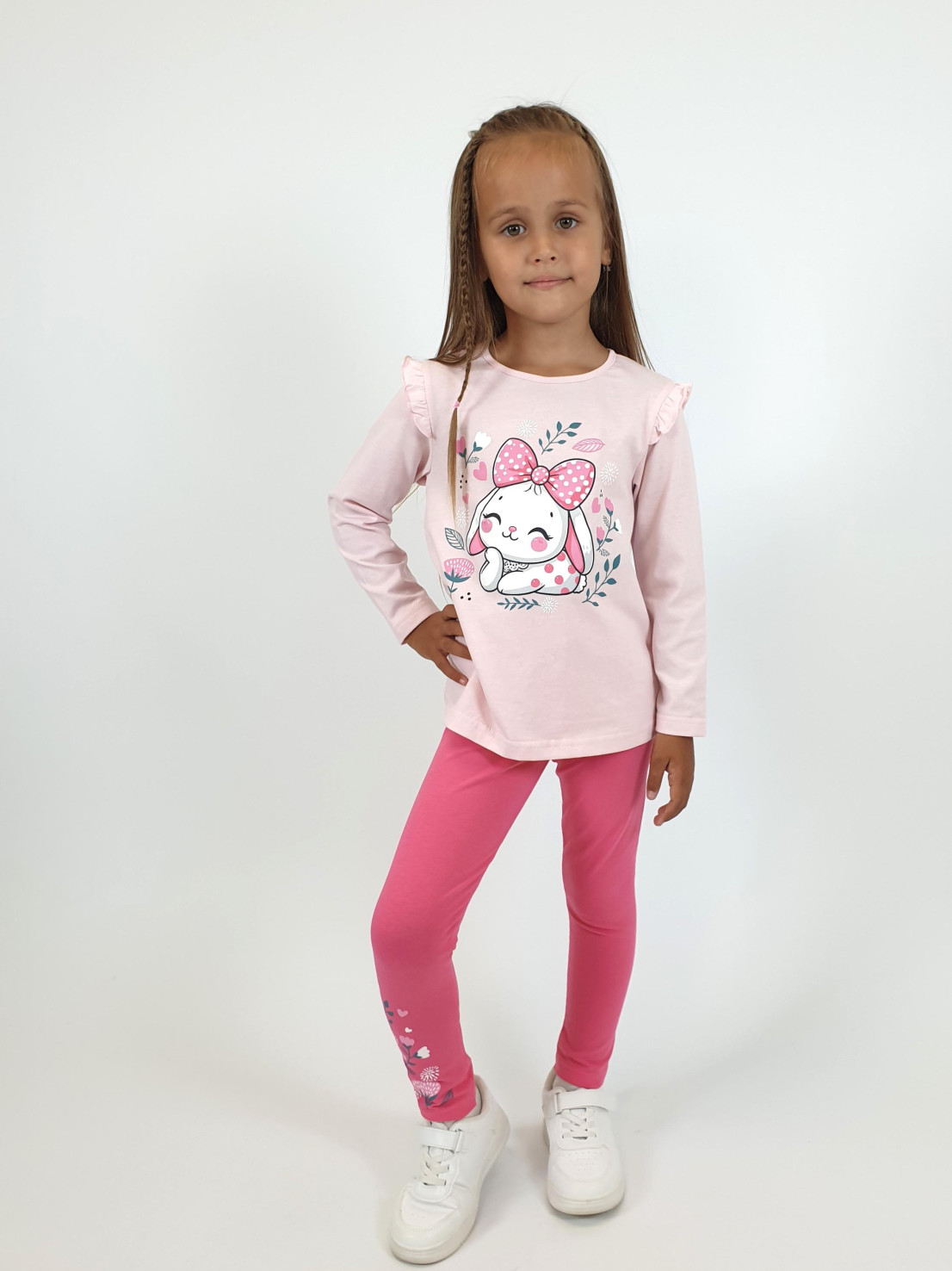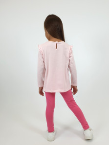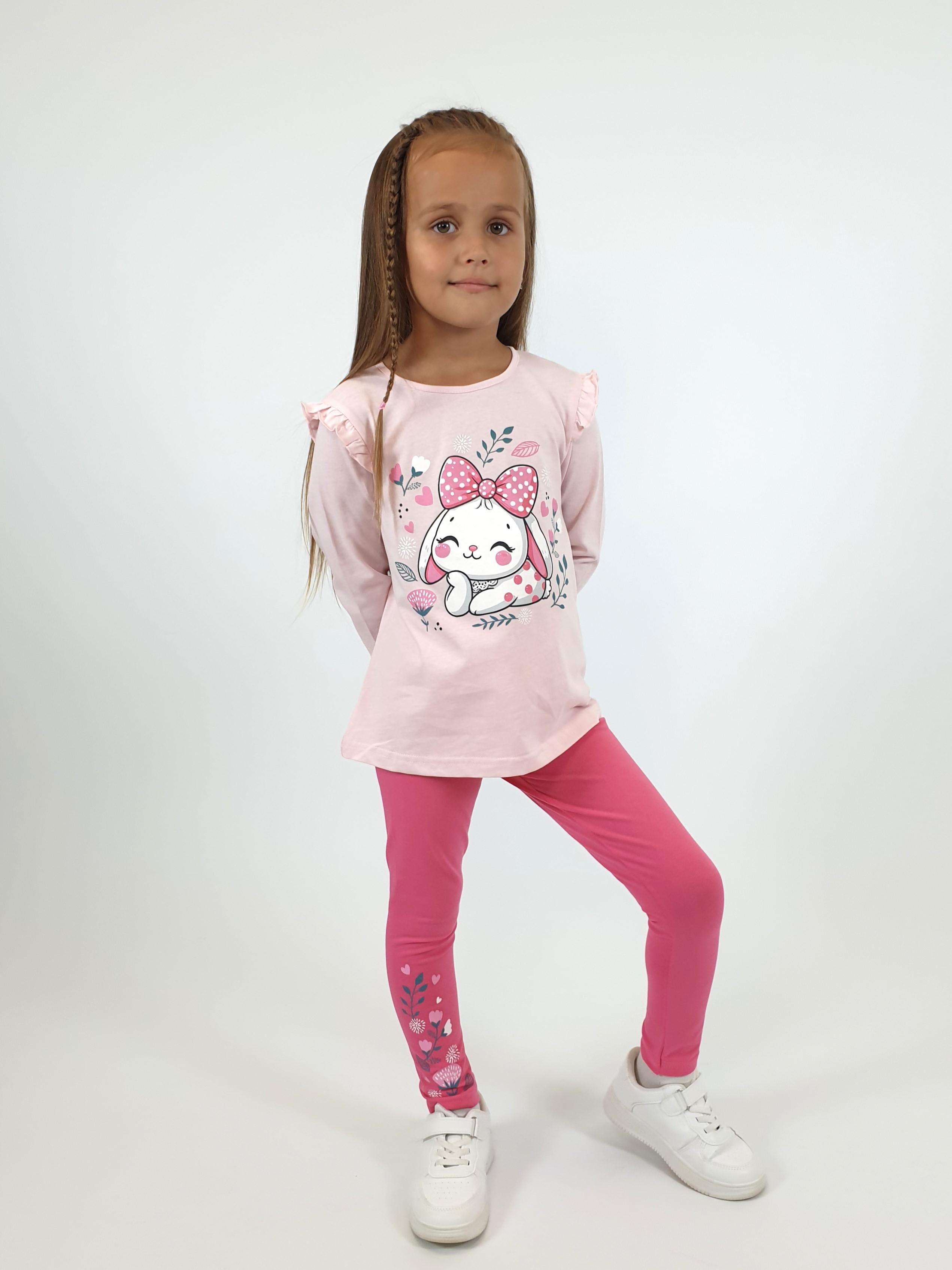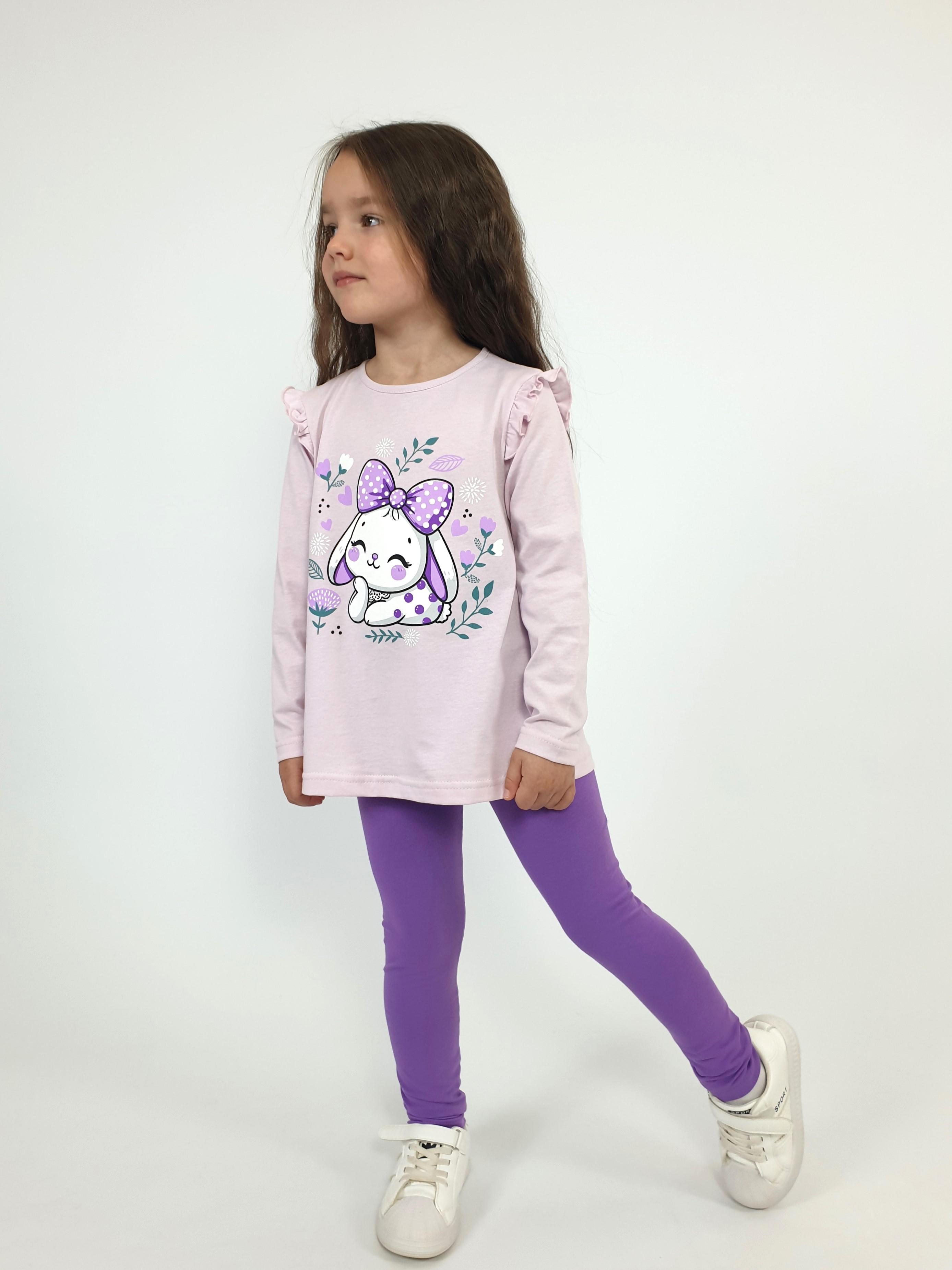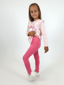 Кулирное полотно:100% х/б.,95% х/б,5% лайкра. Джемпер-силуэт трапеция,длинный втачной рукав,в пройме рюша.Горловина окантована,застежка на пуговицу по спинке.Печать на переде. Лосины-длинные.вверху на резинке.Печать-справа внизу.