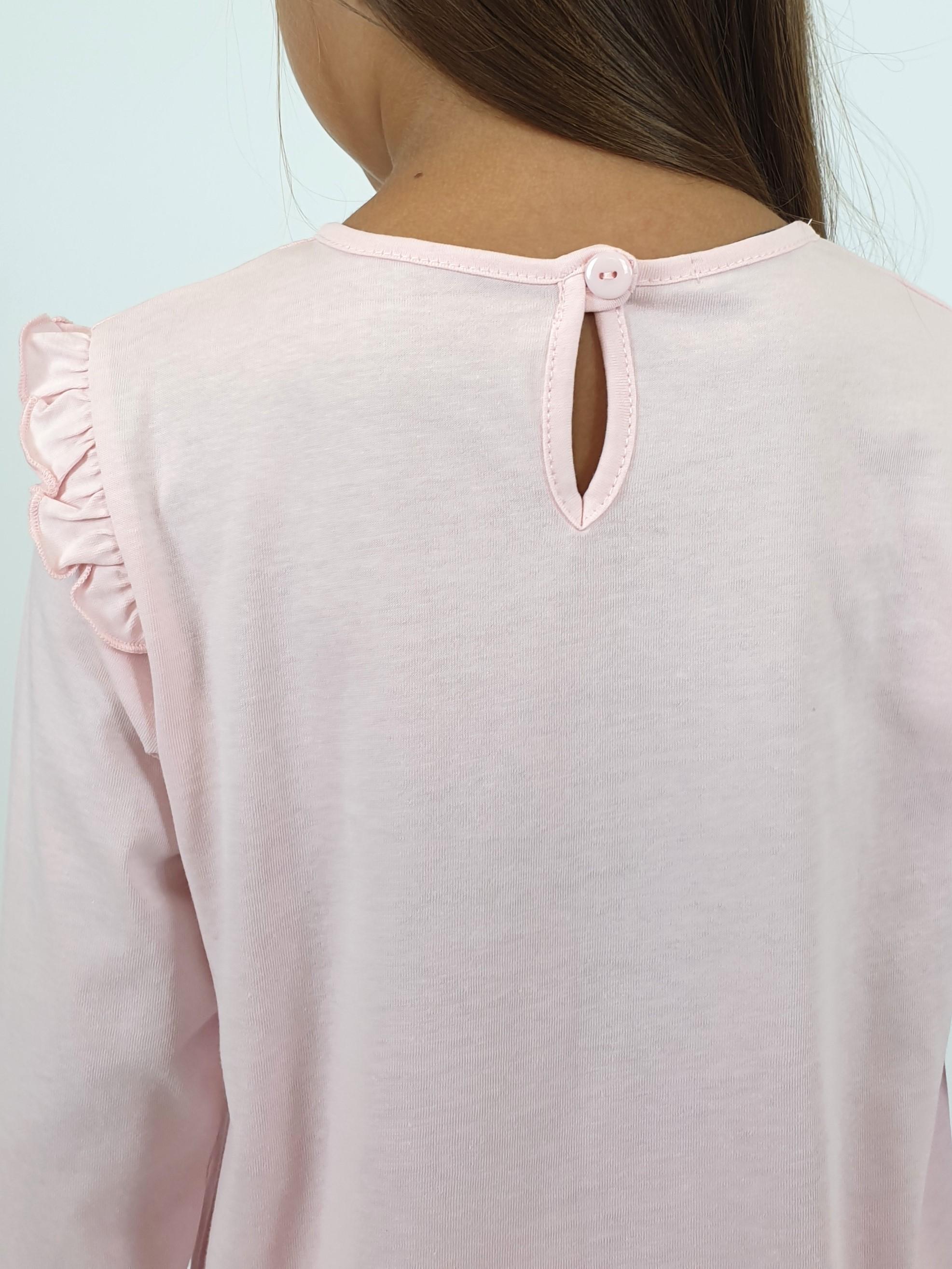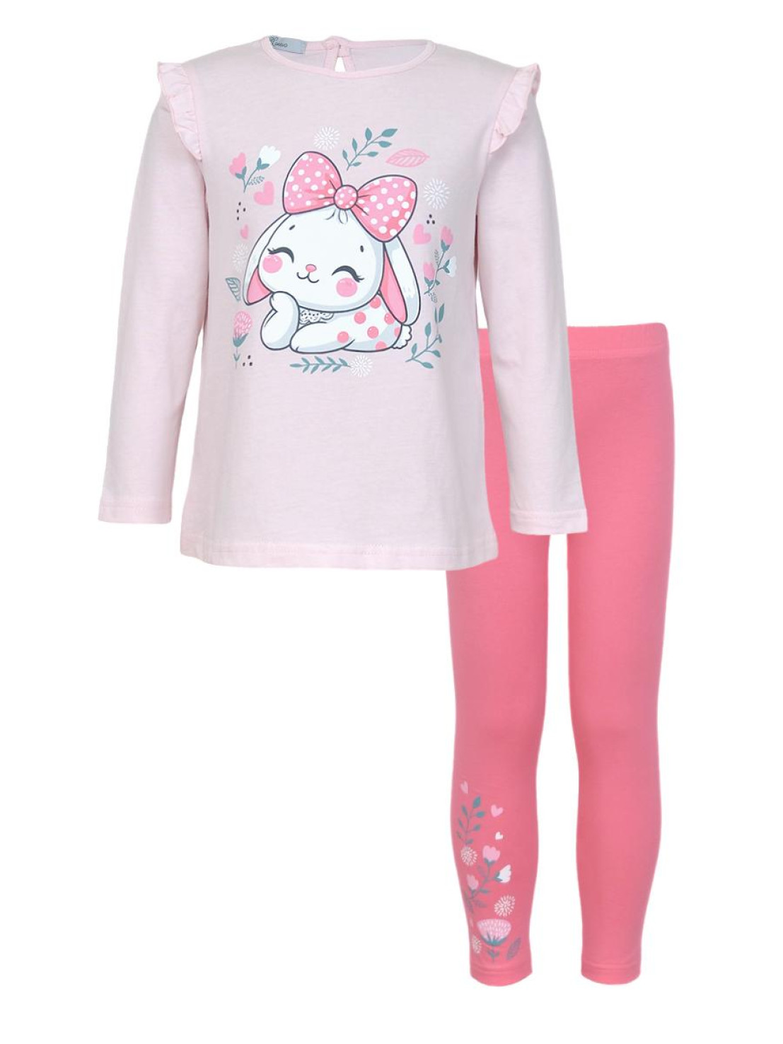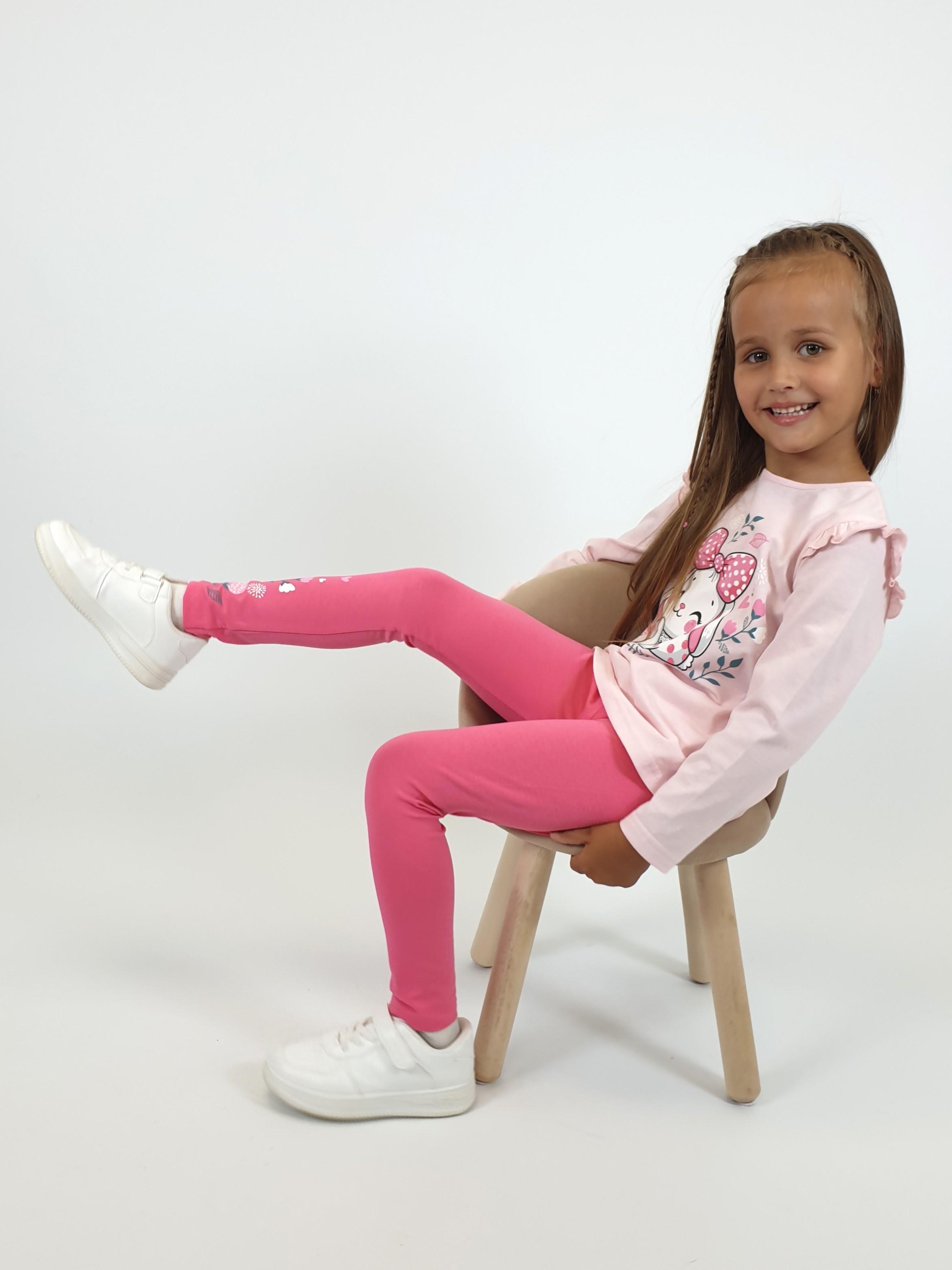 Кулирное полотно:100% х/б.,95% х/б,5% лайкра. Джемпер-силуэт трапеция,длинный втачной рукав,в пройме рюша.Горловина окантована,застежка на пуговицу по спинке.Печать на переде. Лосины-длинные.вверху на резинке.Печать-справа внизу.